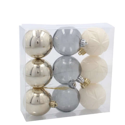Deze stijlvolle set bevat 9 zorgvuldig vervaardigde ornamenten die drie moderne tinten en diverse afwerkingen combineren voor een gebalanceerde feestelijke decoratie. Dankzij het duurzame plastic zijn de ballen licht, veilig en eenvoudig op te hangen aan elk type kerstboom.