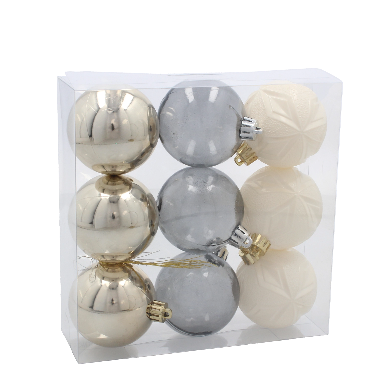 Set van kerstballen 6 cm – champagne, zilver en wit, 9 stuks
