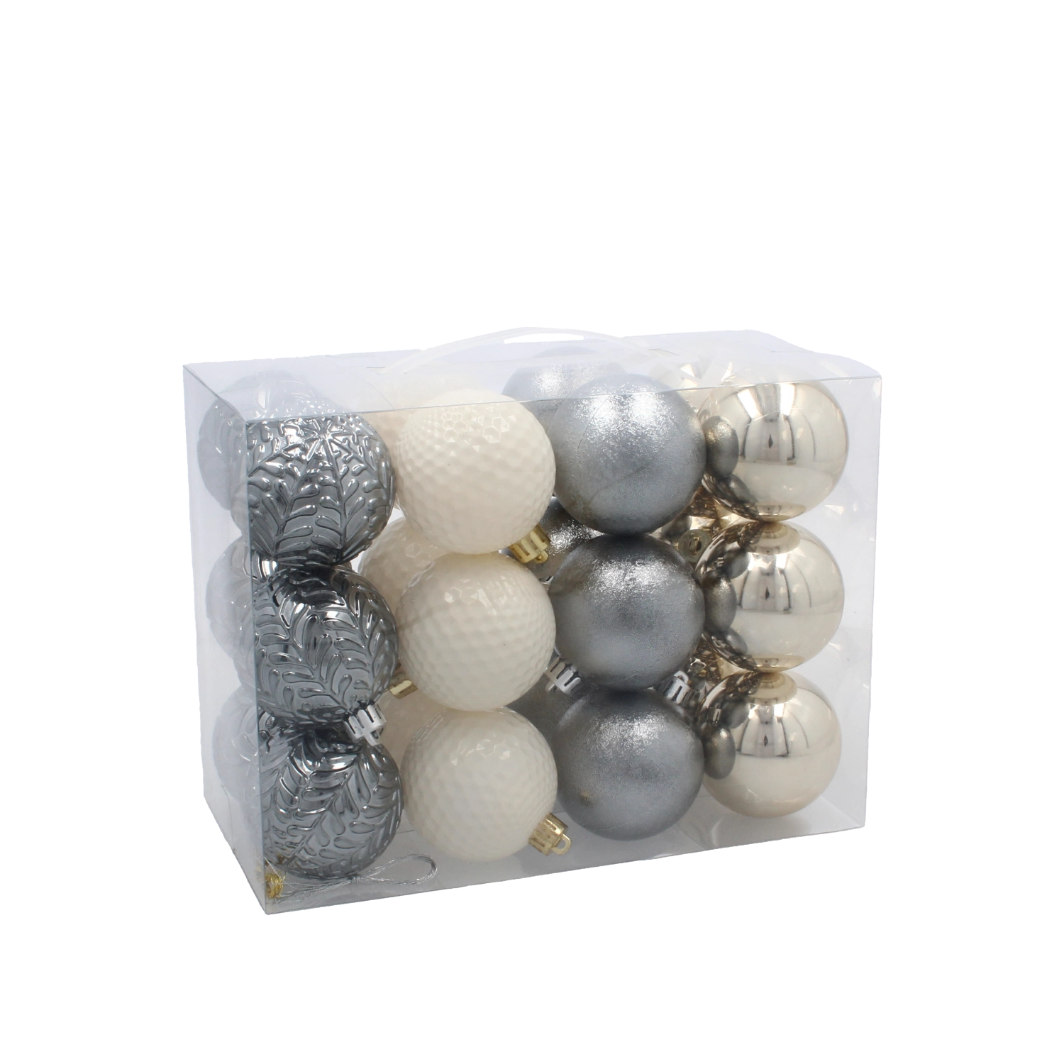 Geef je kerst een tijdloze elegantie. Deze zorgvuldig op elkaar afgestemde set van 24 kunststof ballen in de kleuren champagne, grijs en wit biedt een uitgebalanceerde combinatie van glanzende, matte en glitterende afwerkingen die diepte, lichtreflecties en een premium uitstraling aan je decor geven.