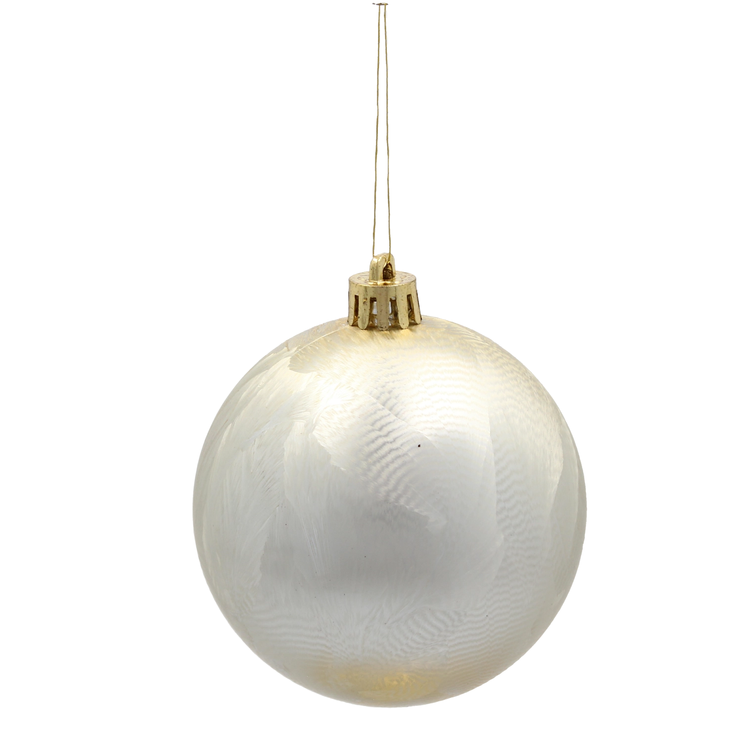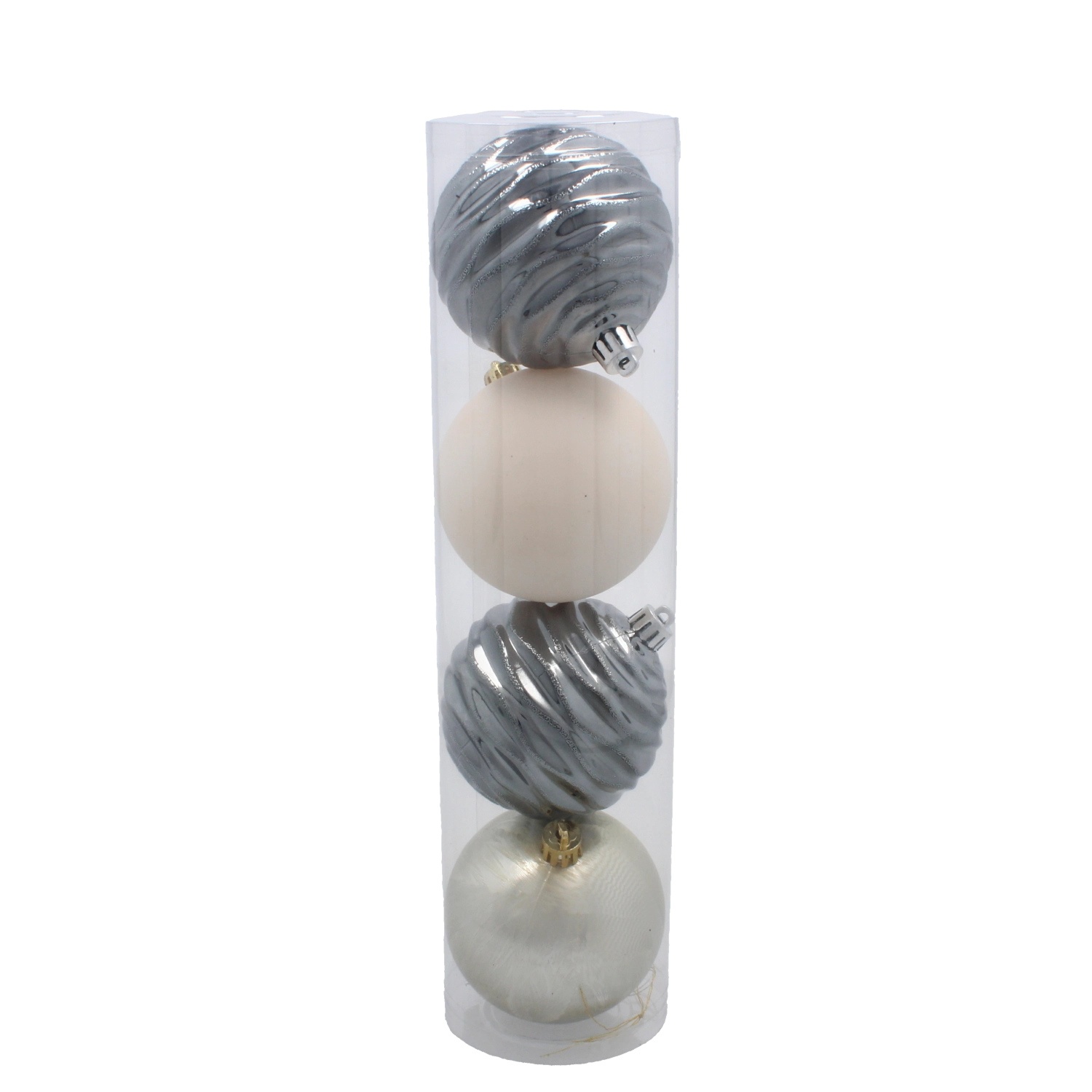 Een elegante set van vier kerstballen met een diameter van 8 cm in de tinten champagne, grijs en wit geeft je decoratie een verfijnde uitstraling en harmonie. Duurzame kunststof zorgt voor veilige hantering en een lange levensduur, terwijl de mix van matte, glanzende en glitterafwerkingen een opvallend contrast creëert. De praktische transparante koker is geschikt voor opbergen, presenteren en eenvoudig cadeau geven.