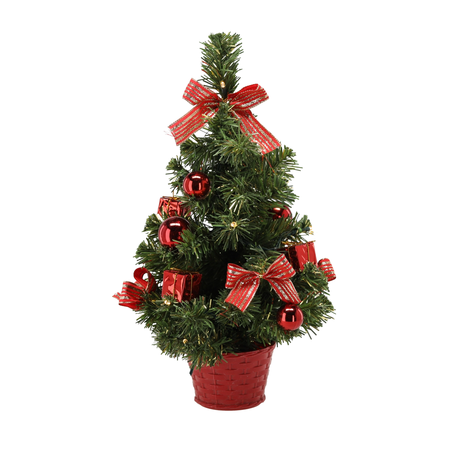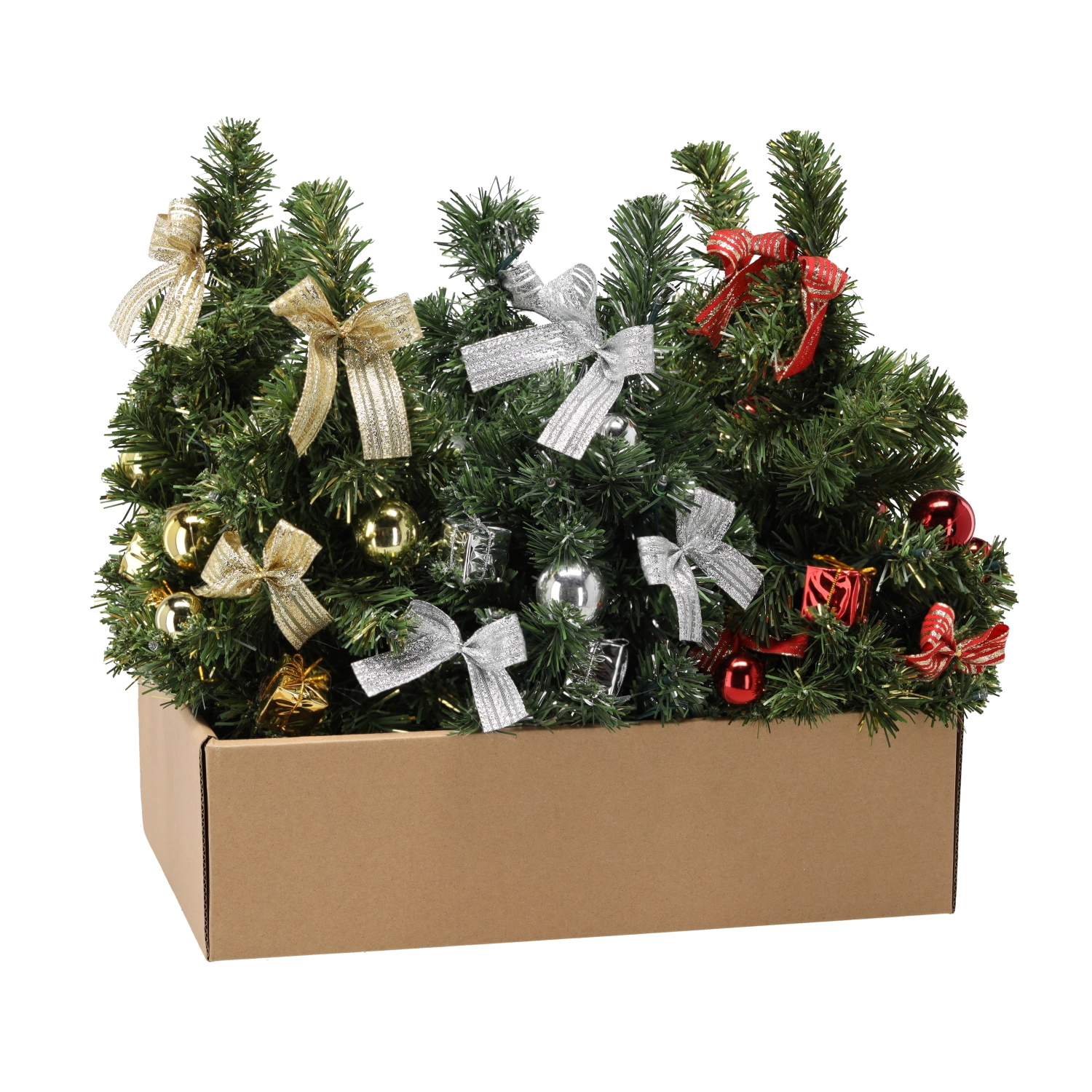 De boom is afgewerkt met strikjes en ballen in rode, zilveren of gouden tinten – alleen uitpakken en neerzetten.
