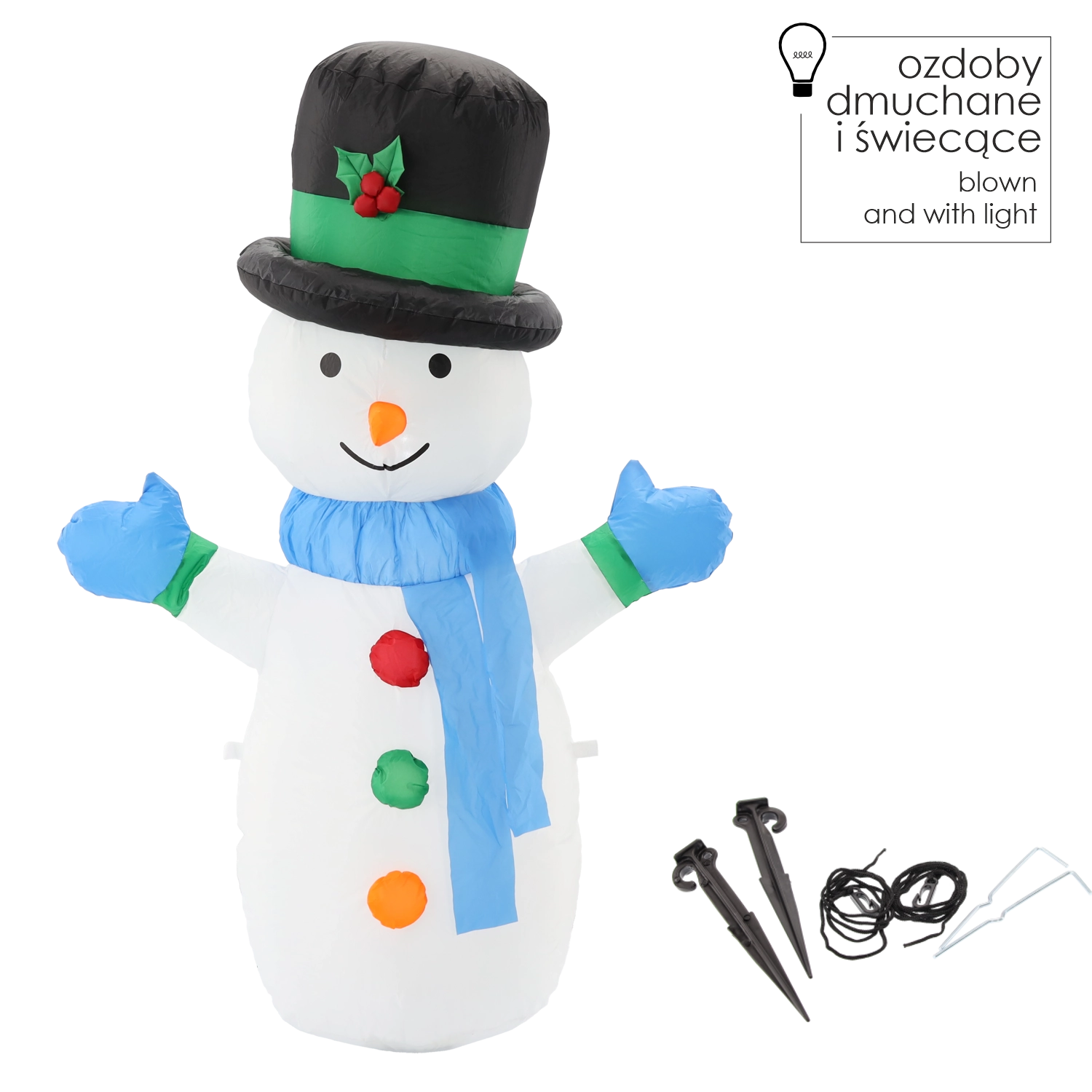 In de verpakking zitten grondpennen en koorden voor een veilige bevestiging, zodat de sneeuwman stevig blijft staan, zelfs bij slechter weer.