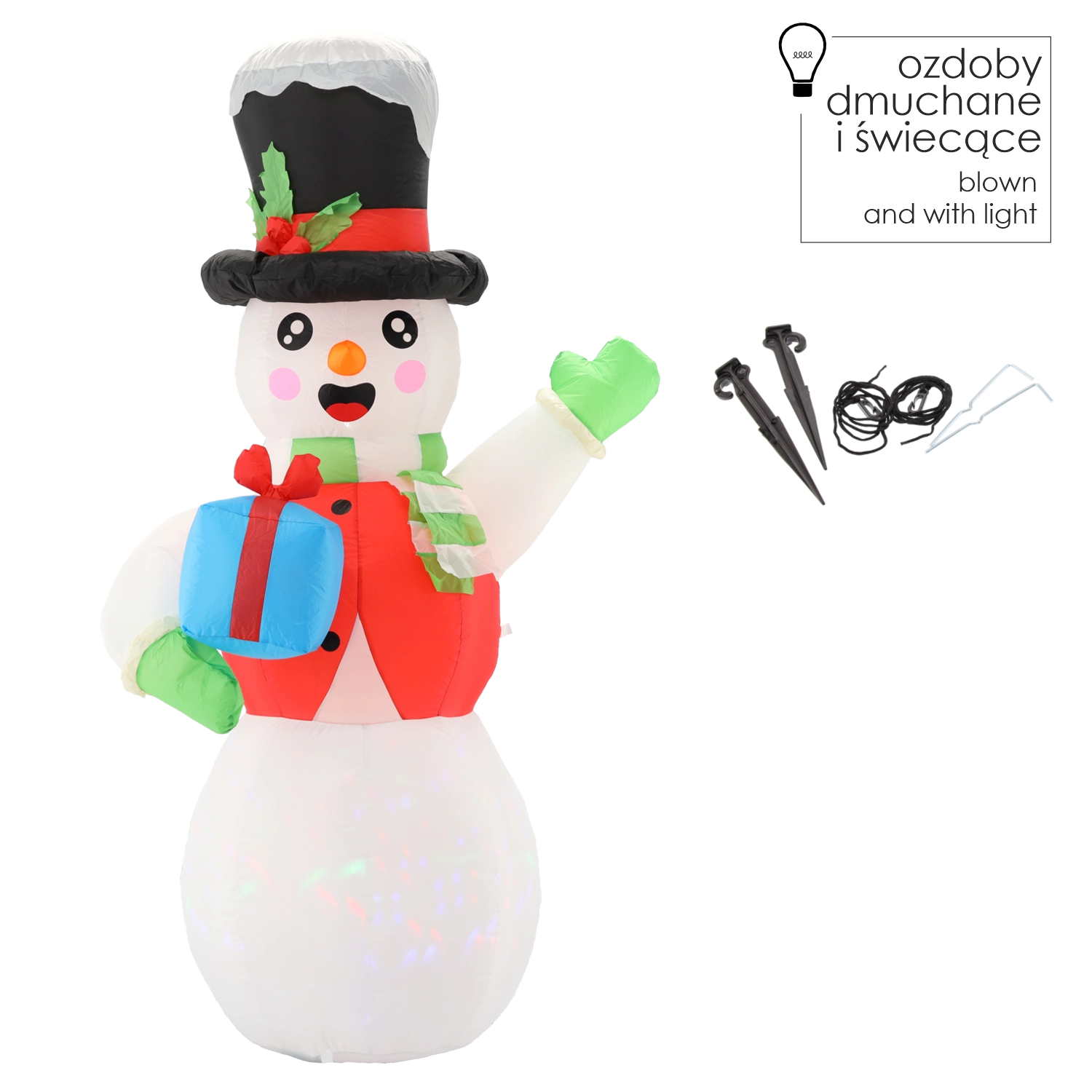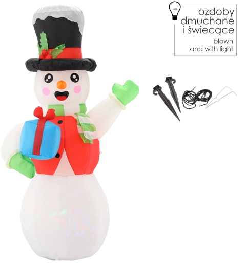 Verras buren en voorbijgangers met een grootse kerstdecoratie die zichzelf in een oogwenk opblaast en laat stralen. De hoge sneeuwpop met zwarte hoed, sjaal en een cadeautje in de hand brengt sprookjesachtige lichteffecten dankzij de combinatie van witte LED en roterende meerkleurige verlichting.