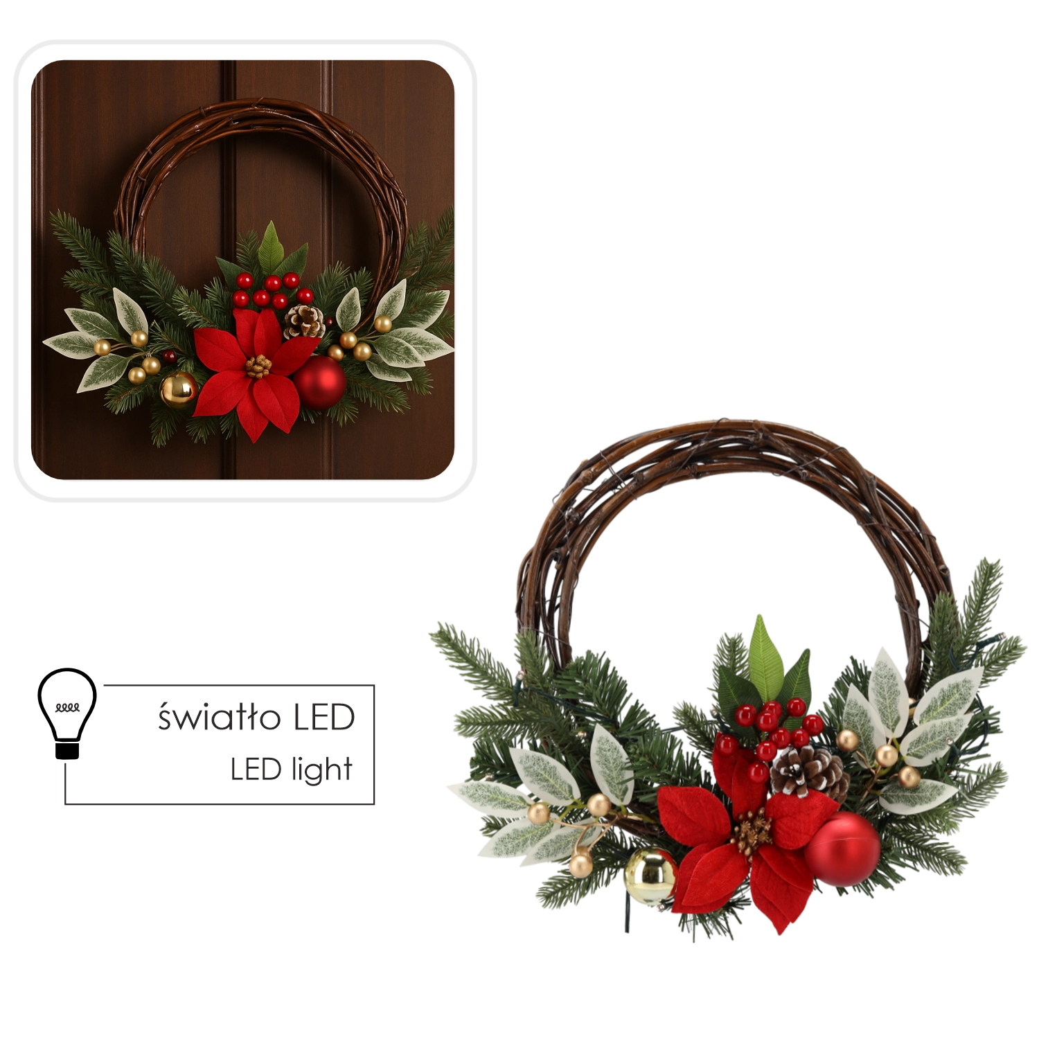 Breng traditionele kerstsfeer in je interieur. Deze krans is gemaakt van hoogwaardig wilgentenen en rijkelijk versierd met groen, bessen, dennenappels en rood‑gouden accenten. Subtiele LED‑verlichting benadrukt de details en creëert gedurende de hele feestdagen een aangenaam lichtdecor.