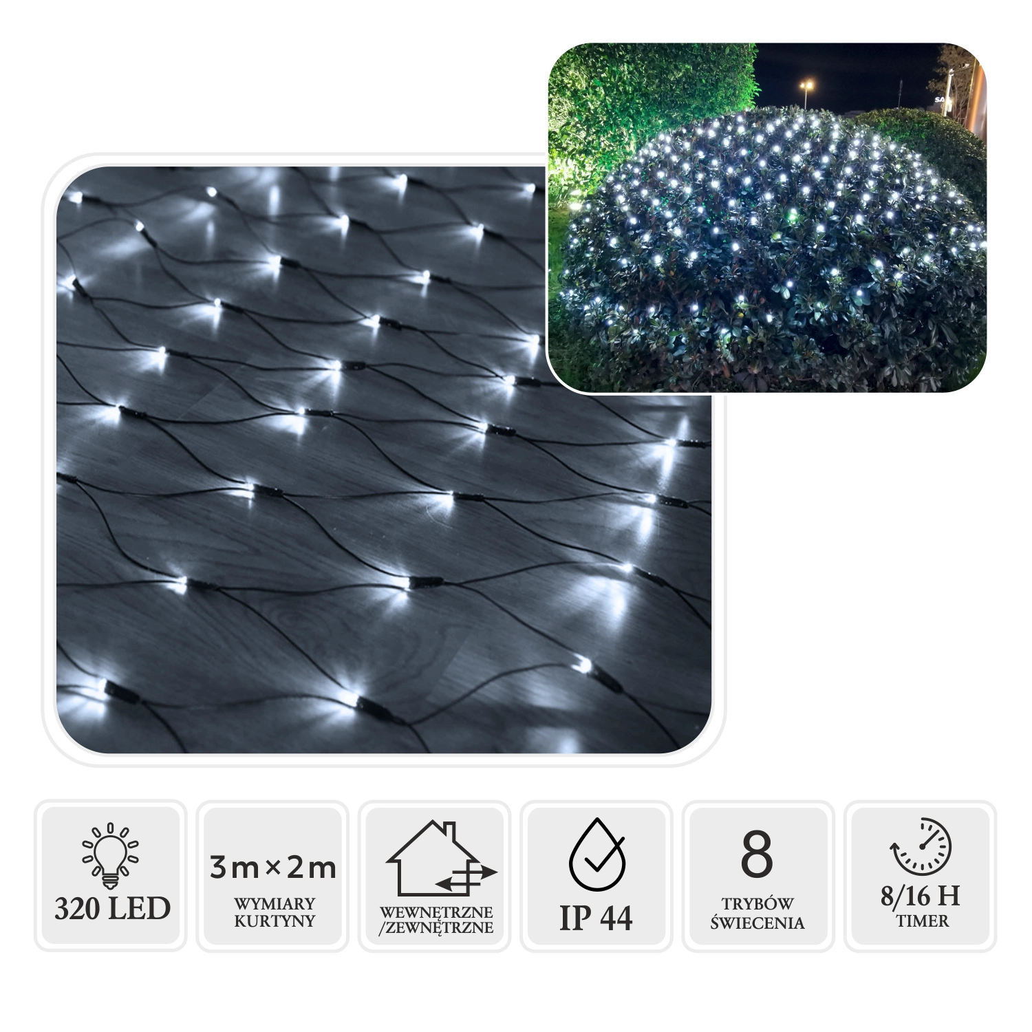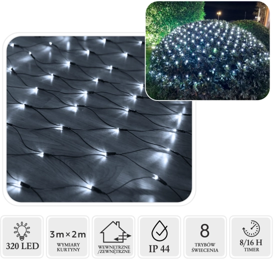 De 8/16 u timer vereenvoudigt het gebruik – de lampjes gaan automatisch aan en uit. Dankzij de laagspanningsvoeding van 31 V en IP44-bescherming is het gebruik veilig, zelfs bij veeleisendere omstandigheden. De koudwitte lichtkleur geeft decoraties een strakke, moderne en feestelijke uitstraling.