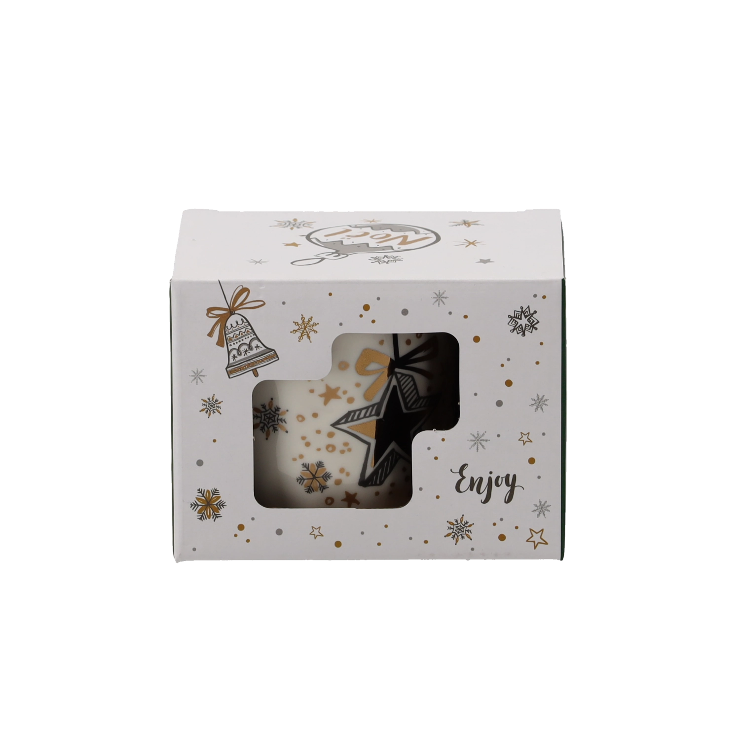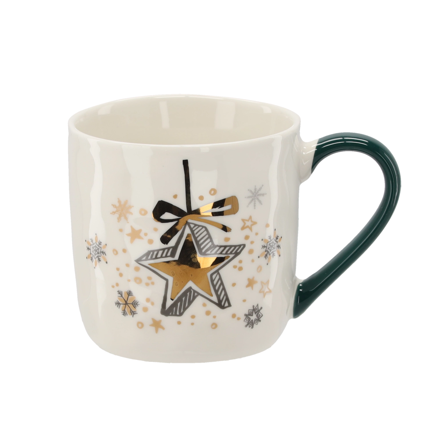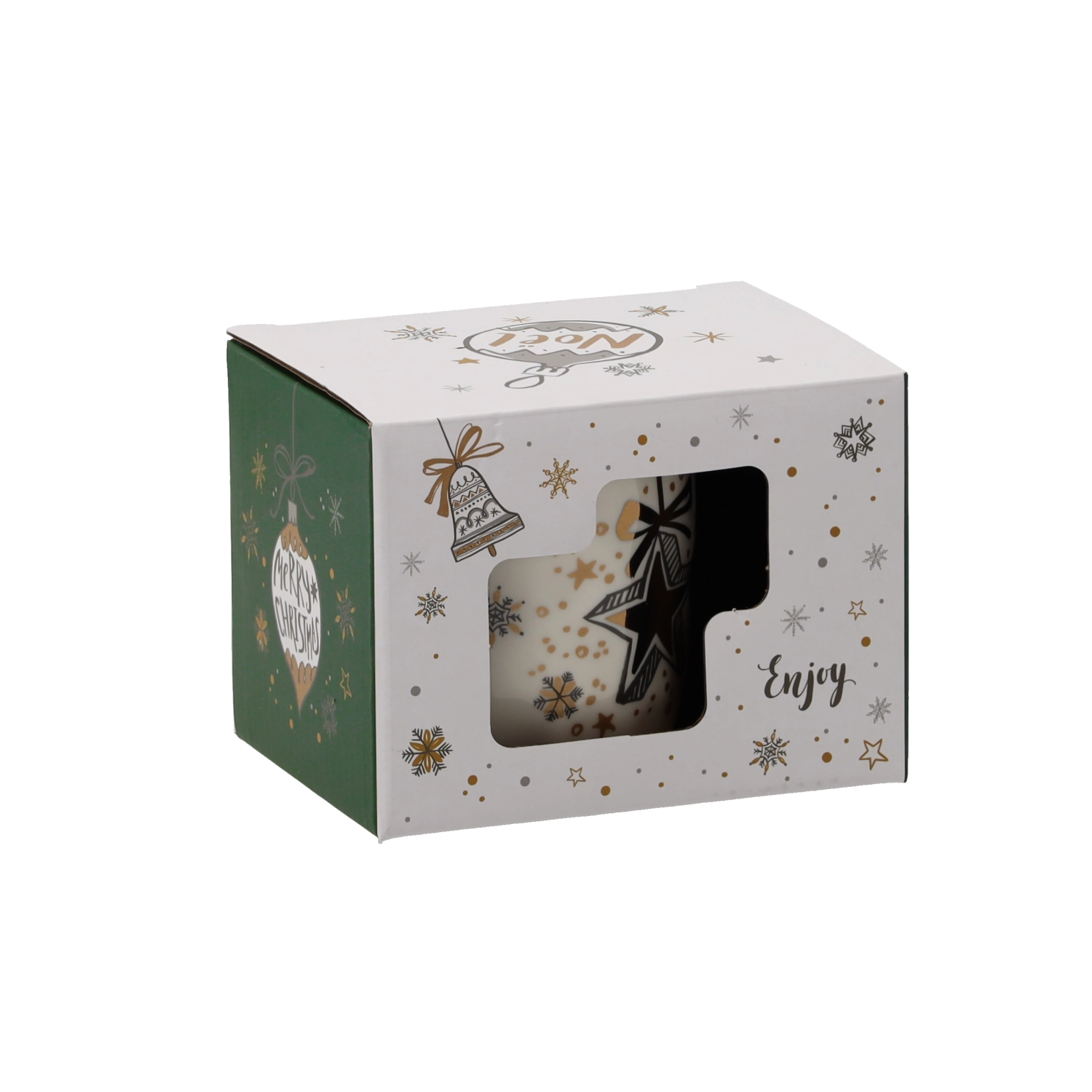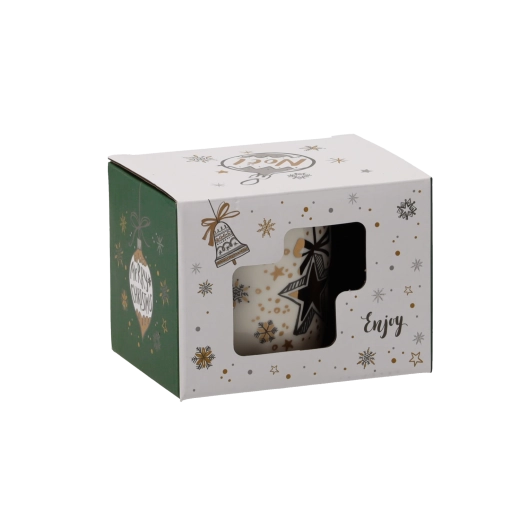 Verwen jezelf of verras je dierbaren met een porseleinen mok in een zachte crèmekleur en feestelijke details in goud, groen en wit. De unieke motieven van sterren, bellen en kerstballen versterken de kerstsfeer en maken van elke warme drank een aangenaam ritueel.