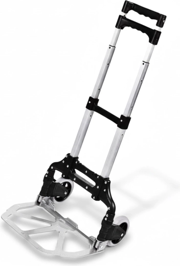 De praktische aluminium trolley combineert laag gewicht, een stevige constructie en snel inklappen in enkele seconden. De telescopische handgreep maakt comfortabel gebruik mogelijk voor gebruikers van verschillende lengtes en de grote opklapbare laadplaat biedt stabiele ondersteuning voor dozen en pakketten.