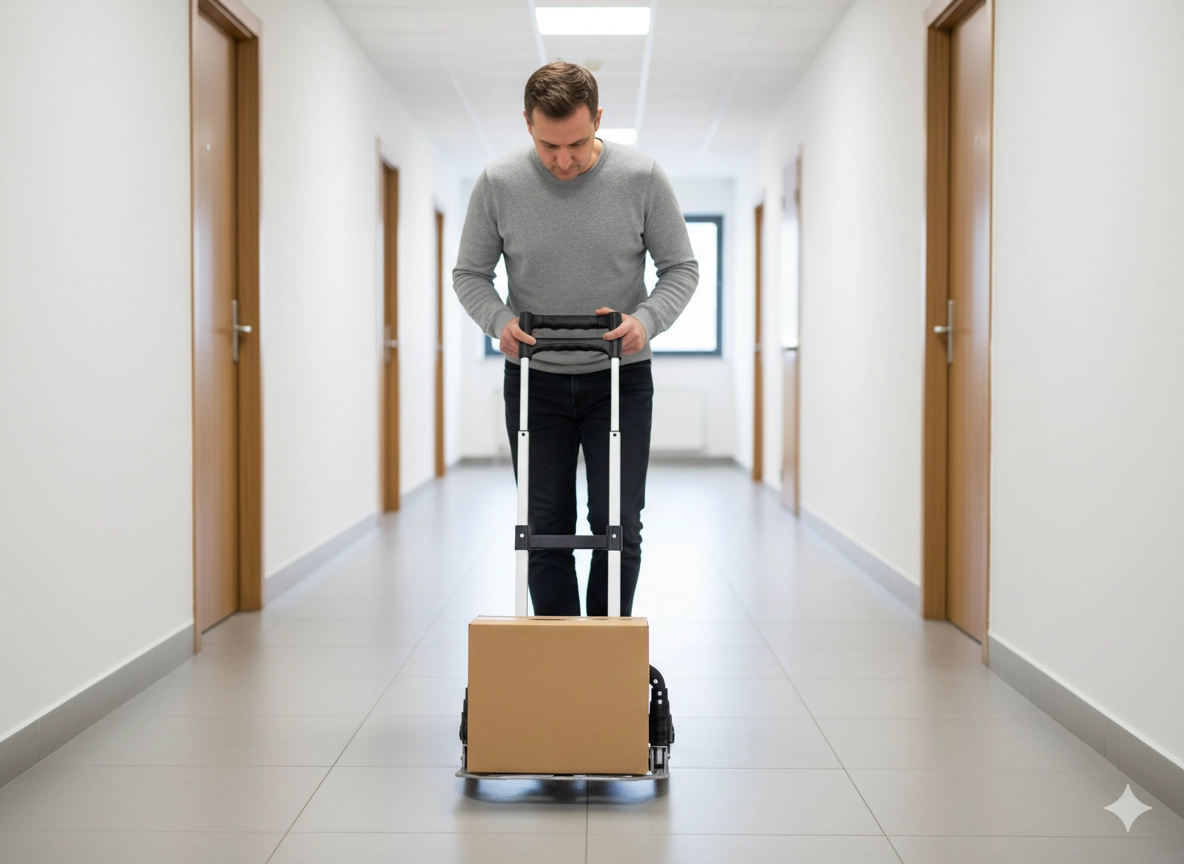 De verstelbare handgreephoogte en brede opvouwbare basis zorgen voor comfortabel en veilig vervoer van dozen en bagage.