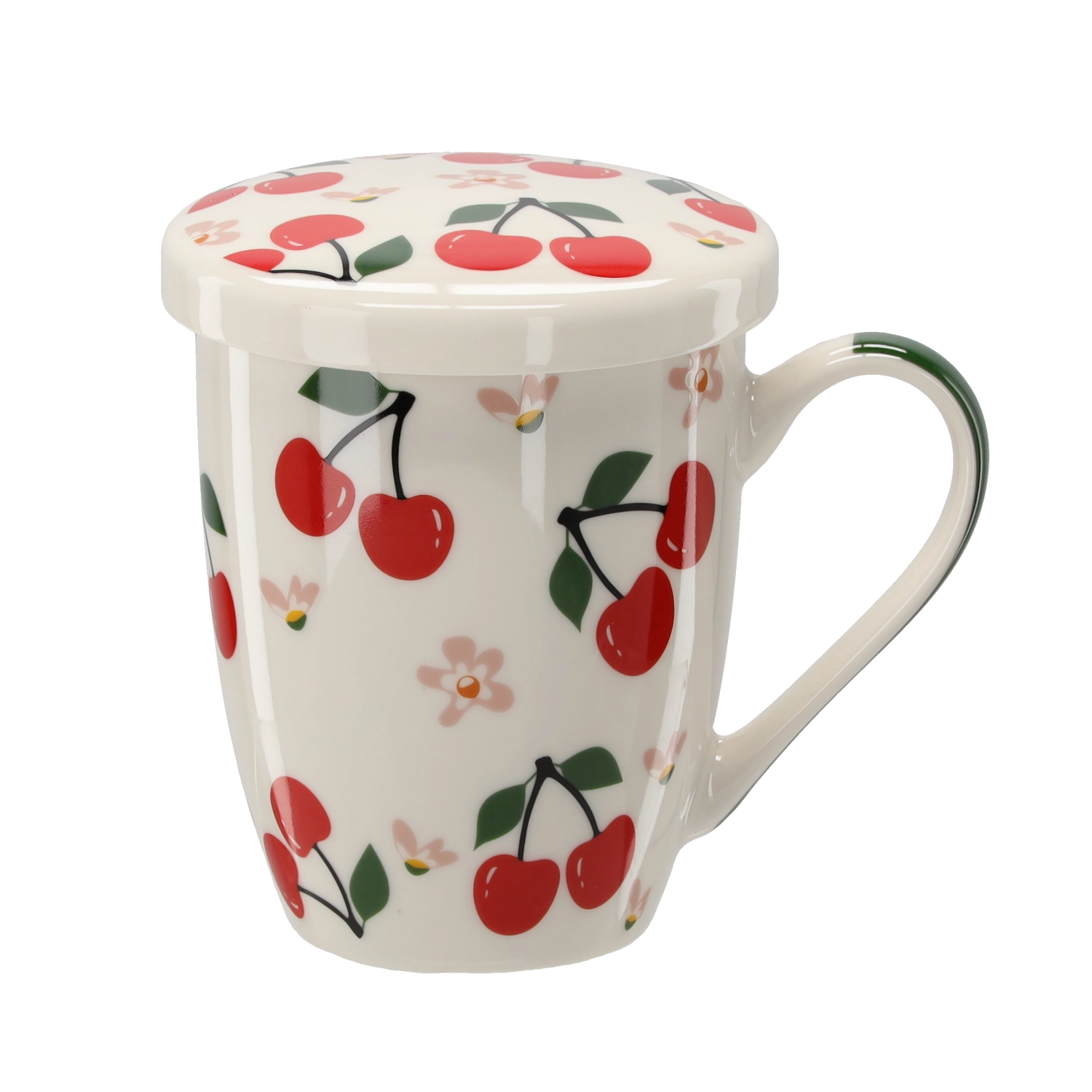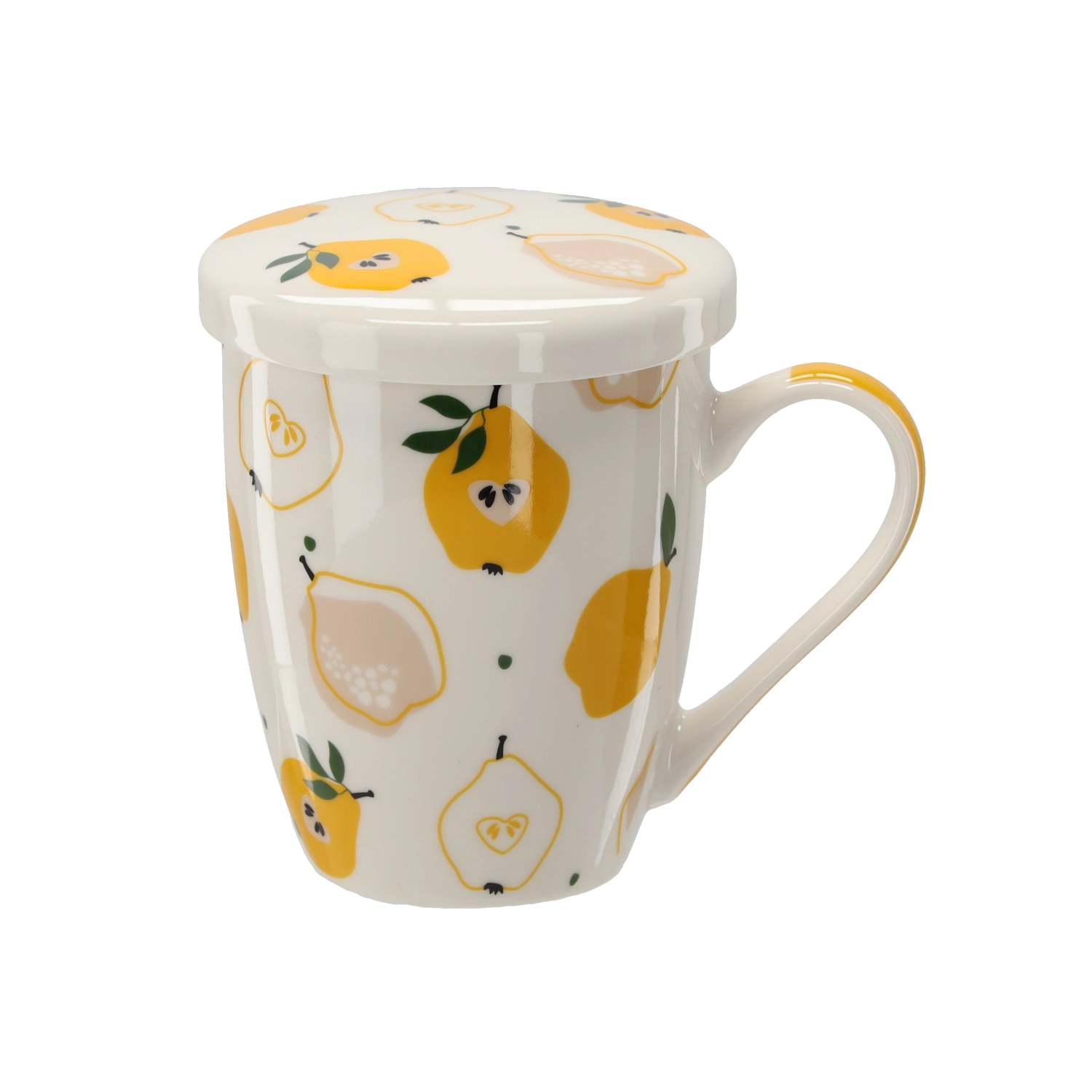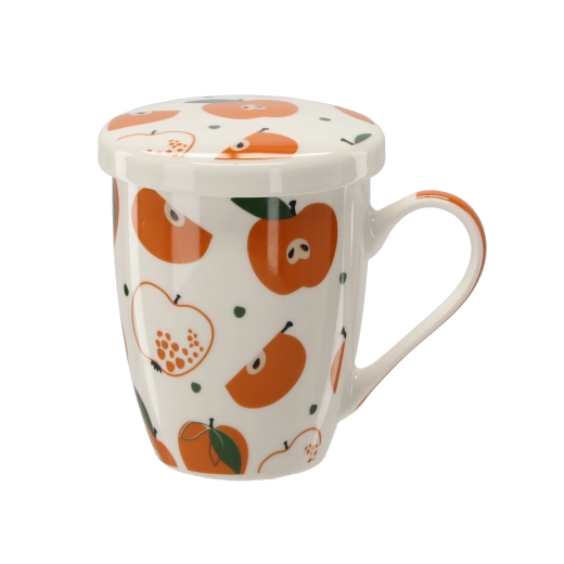 Stijlvolle porseleinen mok met een inhoud van 340 ml, met geïntegreerde zeef en deksel, ideaal voor het dagelijks drinken van thee en kruidenaftreksels. Dankzij het fijne zeefje bereid je losse thee zonder onzuiverheden, terwijl het deksel de drank langer warm houdt. Hoogwaardig porselein, een ergonomisch oor en frisse fruitmotieven maken het tot een praktische en mooie aanvulling voor de keuken.