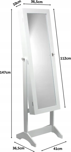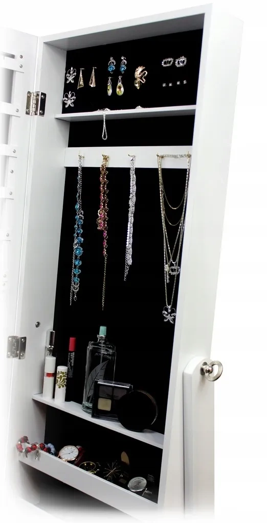 Ontdek de praktische combinatie van opbergruimte voor sieraden en een volwaardige staande spiegel. De witte sieradenkast GRAND biedt een doordachte indeling – haakjes voor kettingen, rails voor oorbellen, vakken voor ringen, horloges en kleine cosmetische accessoires. Zachte pluche bekleding beschermt sieraden tegen krassen en het slot met sleuteltje zorgt voor privacy en veiligheid.