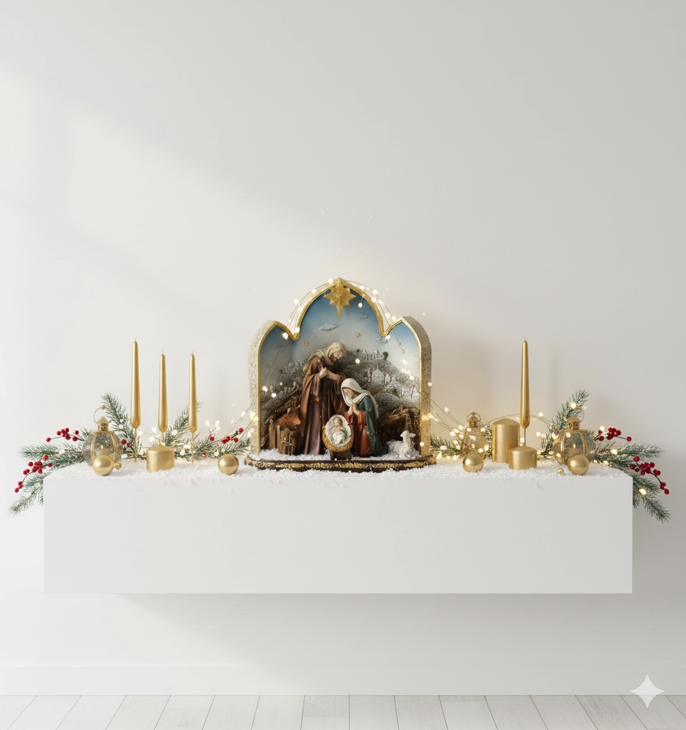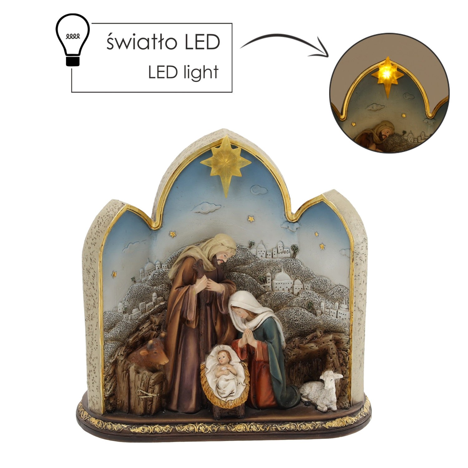Dit decoratieve kerststalbeeldje met de Heilige Familie in een boogvormige lijst met subtiele gouden accenten brengt een traditioneel kerstmotief in een modern jasje. De warme LED-verlichting van de ster zorgt voor een aangename sfeer en geeft je decoratie een feestelijk accent.