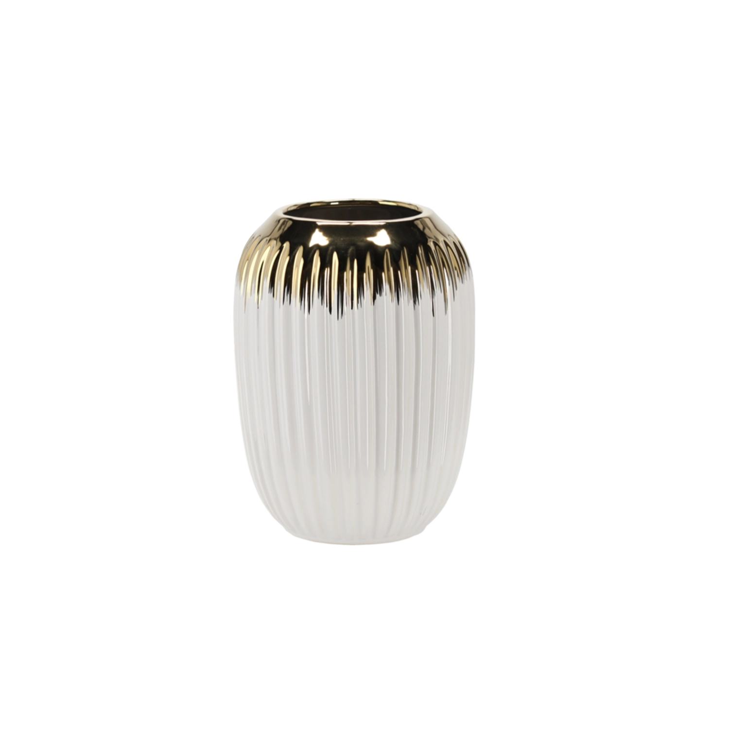 Deze stijlvolle wit‑gouden vaas accentueert de schoonheid van zowel verse als gedroogde bloemen en fungeert tegelijk als een opvallend decoratief element. De keramische afwerking in combinatie met een glanzend gouden accent past bij zowel moderne als klassieke interieurs.