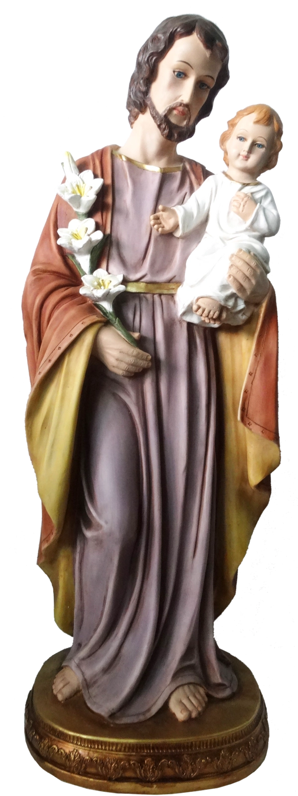 Dit representatieve beeld van de heilige Jozef met het Kindje Jezus is gemaakt van duurzame materialen en zorgvuldig met de hand beschilderd. Het hoge esthetische niveau en de realistische details benadrukken het spirituele karakter van elke ruimte – van kerken en kapellen tot huiselijke gebedshoeken en tuinplekken.
