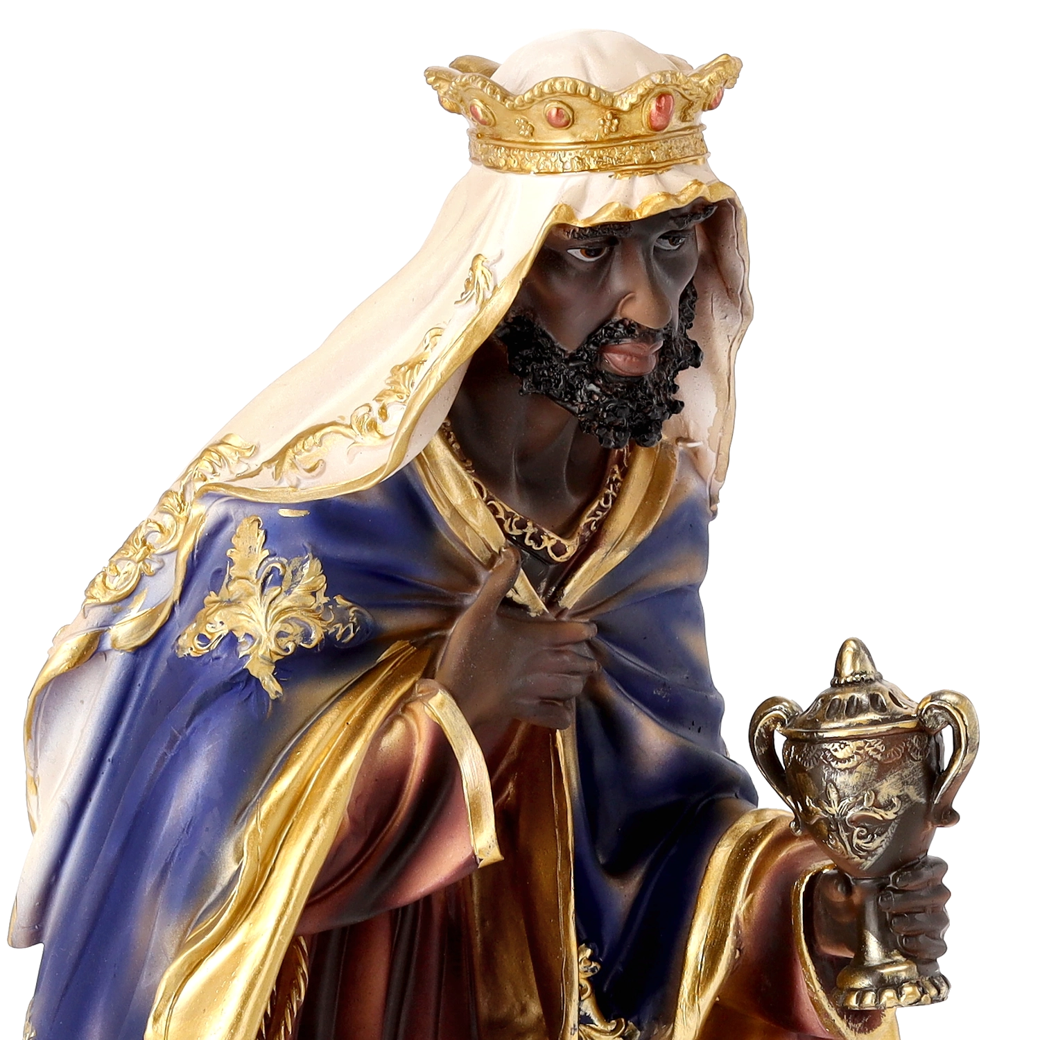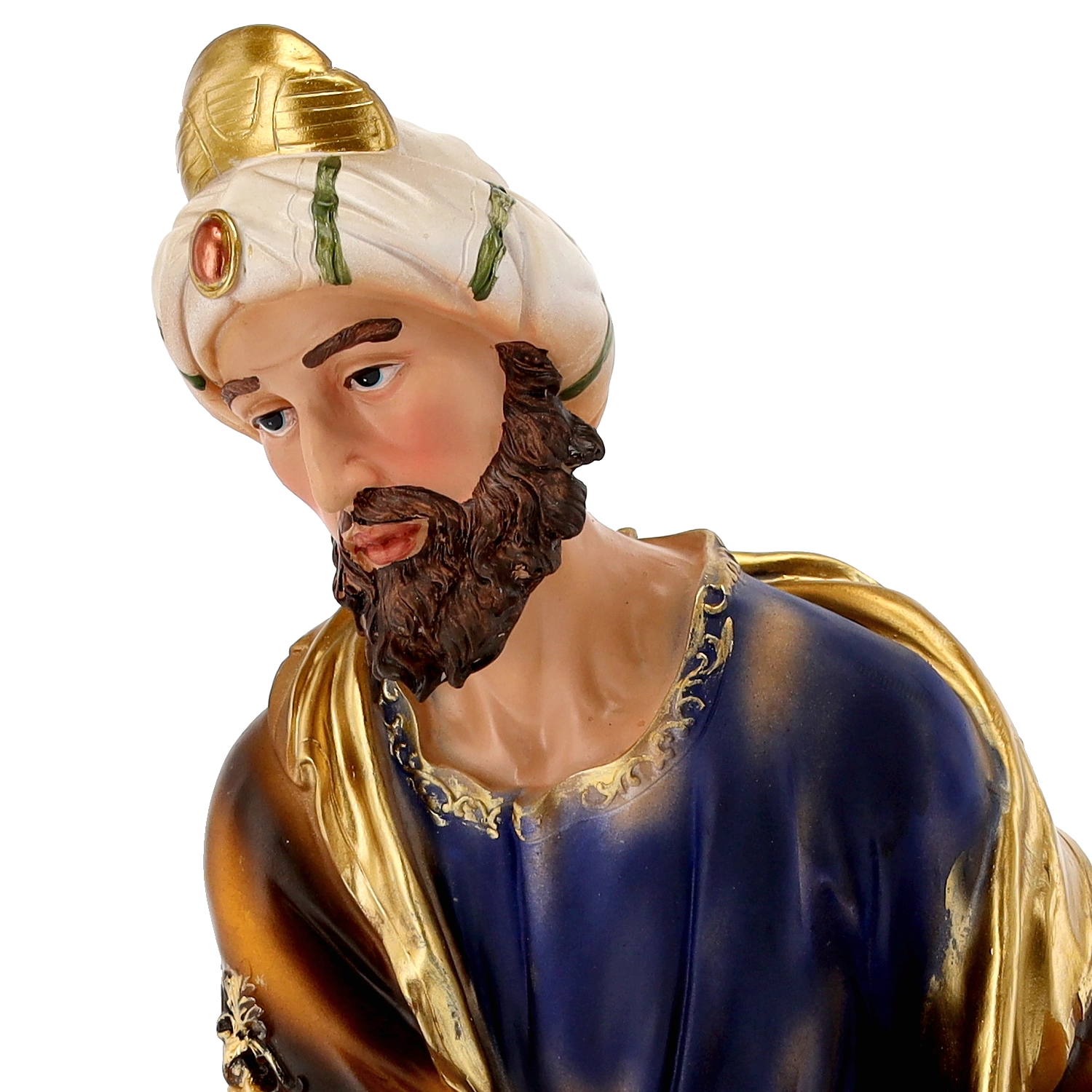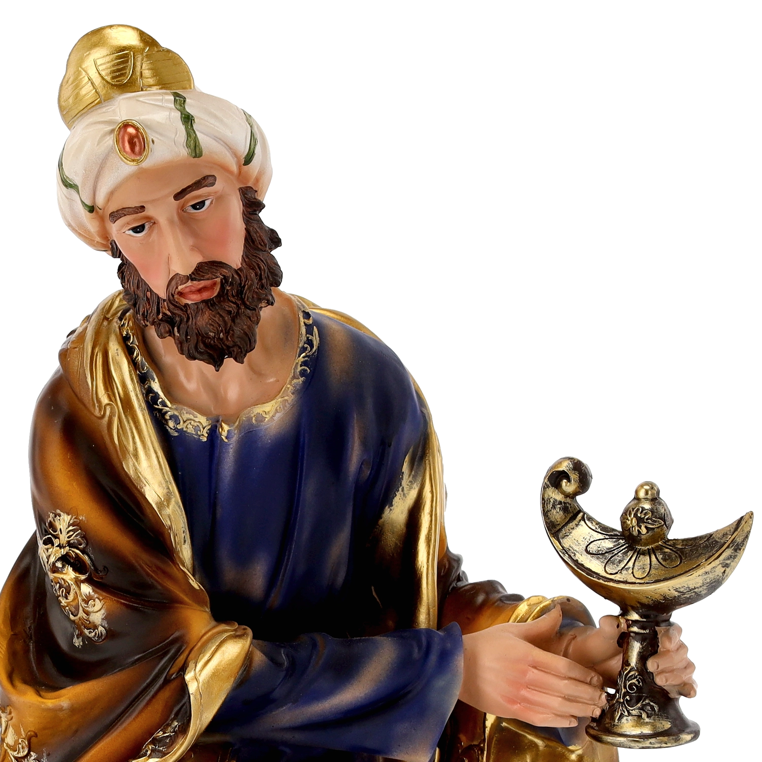 Elke figuur valt op door verfijnde gelaatstrekken, precies gevormde plooien in de kleding en gouden accenten. Dankzij het handschilderwerk oogt de scène levendig en feestelijk.