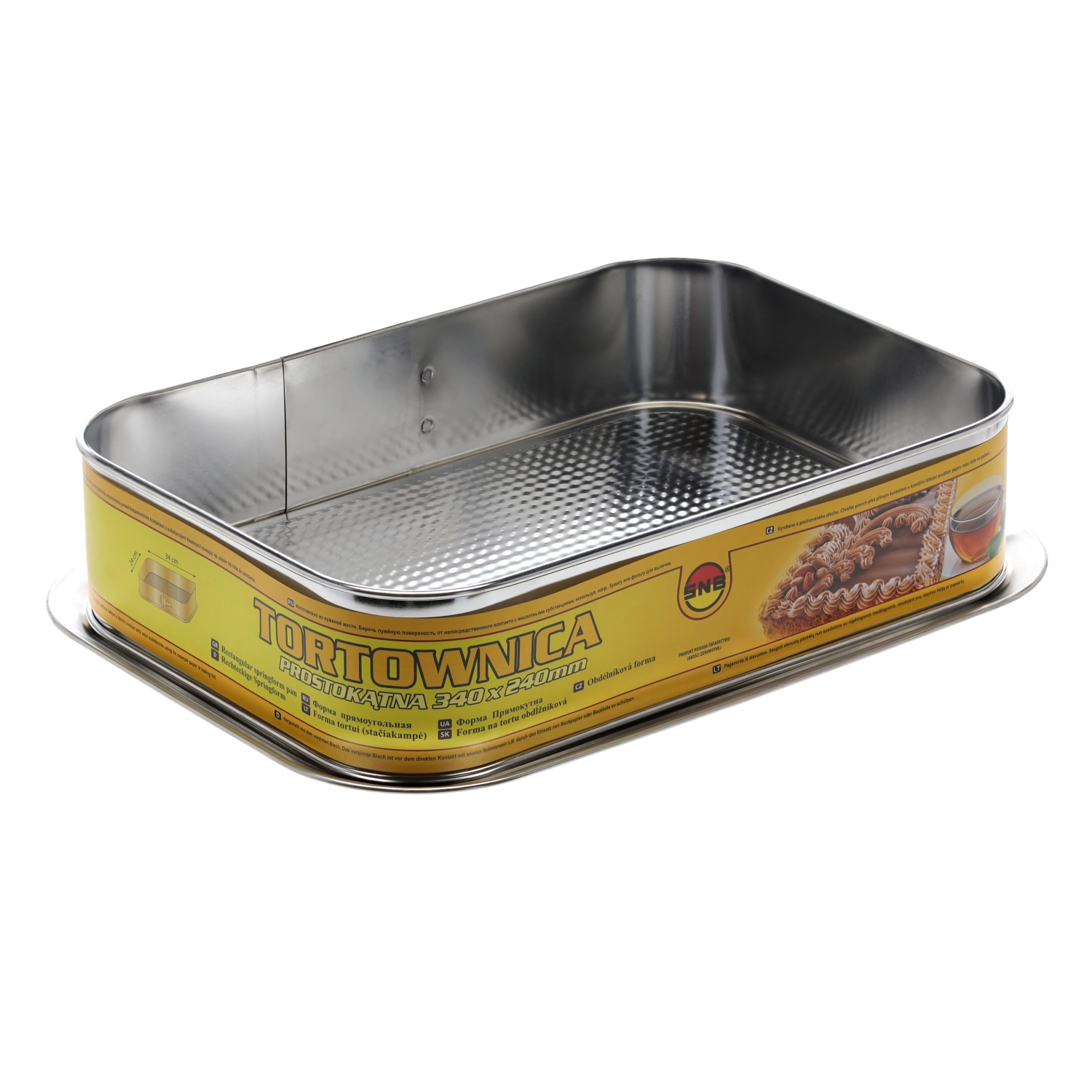 Praktische rechthoekige taartvorm van 34 × 24 cm met een geprofileerde bodem voor egale garing en een krokante structuur van het deeg. Gemaakt van verzinkt staal voor hoge duurzaamheid en een lange levensduur. De uitneembare bodem maakt het eenvoudig om desserts te lossen zonder beschadiging. Geschikt voor gas- en elektrische ovens en makkelijk te reinigen en te onderhouden.