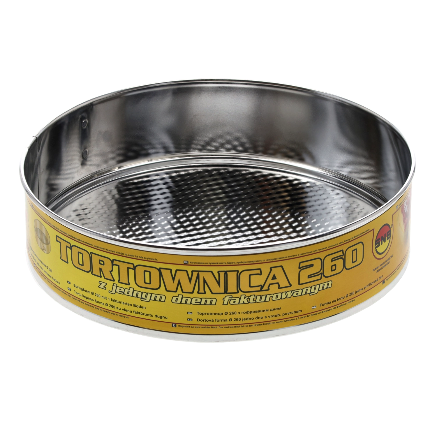 Praktische taartvorm met een diameter van 26 cm van duurzame verzinkte staal voor het eenvoudig bereiden van taarten en gebak. Dankzij de uitneembare bodem met gestructureerd oppervlak haal je desserts er moeiteloos uit en hebben ze een perfect gladde uitstraling. De handige klem maakt snel openen mogelijk en serveren direct op de bodem. Ter bescherming van het oppervlak tegen zure ingrediënten raden we aan bakpapier te gebruiken.