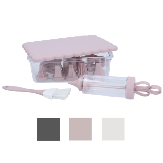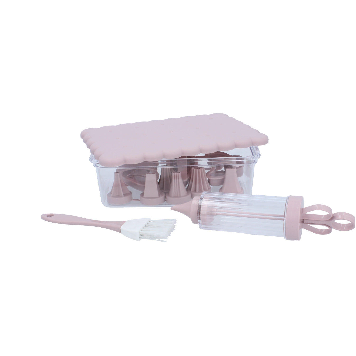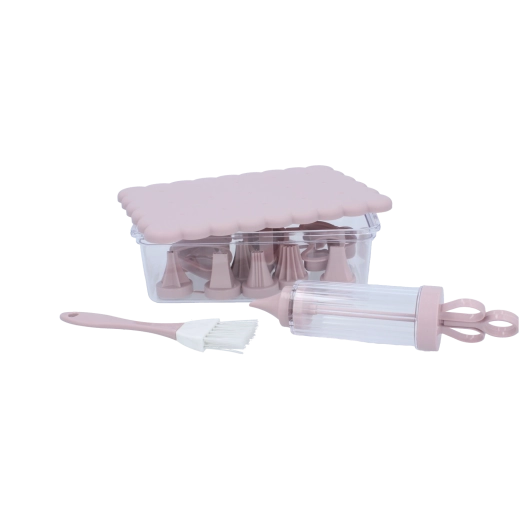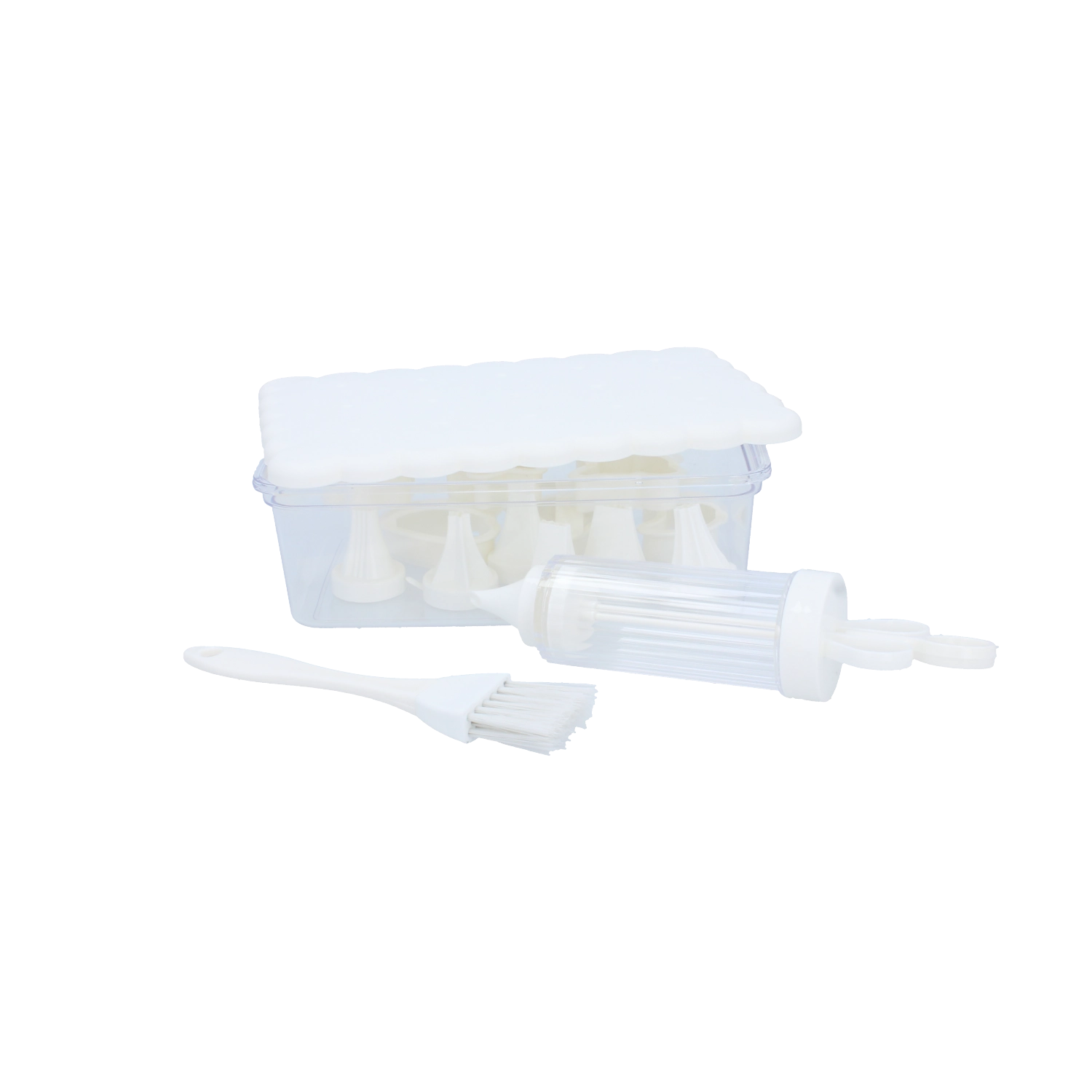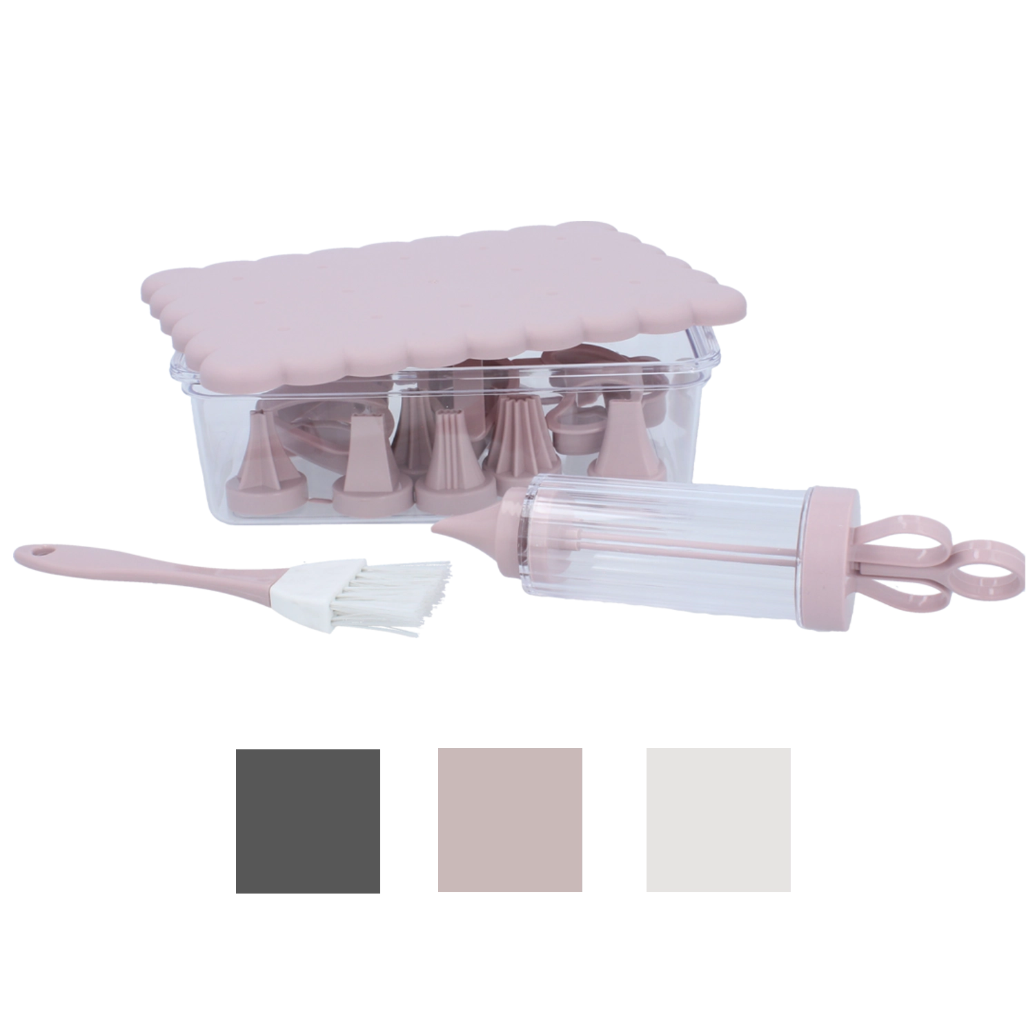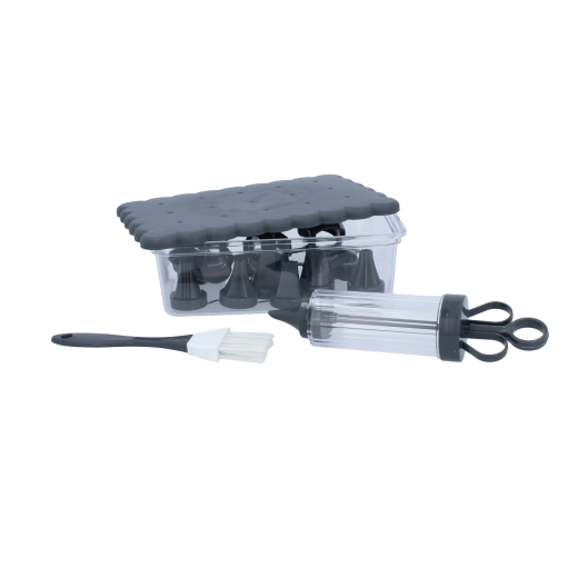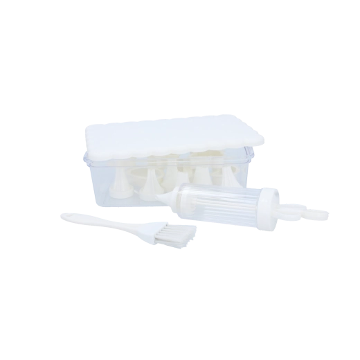 De set is geschikt voor gebruik met deeg, crèmes en glazuren. Alles berg je op in de draagbare box met deksel, die de hulpmiddelen schoon en altijd binnen handbereik houdt.