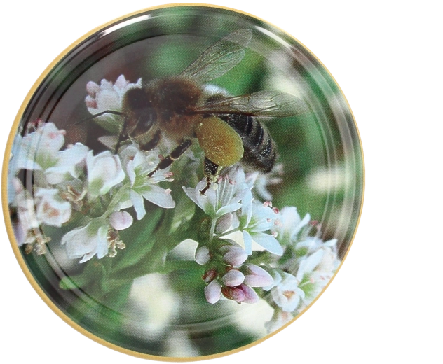 Praktische set van 10 deksels met een diameter van 82 mm met een aantrekkelijk bijenmotief op bloemen, geschikt voor potten met honing en andere zelfgemaakte producten. Twist-off deksels van verzinkt plaatstaal met siliconen afdichting zorgen voor een stevige en hermetische afsluiting. Geschikt voor koude en warme verwerking, inclusief sterilisatie en pasteurisatie.