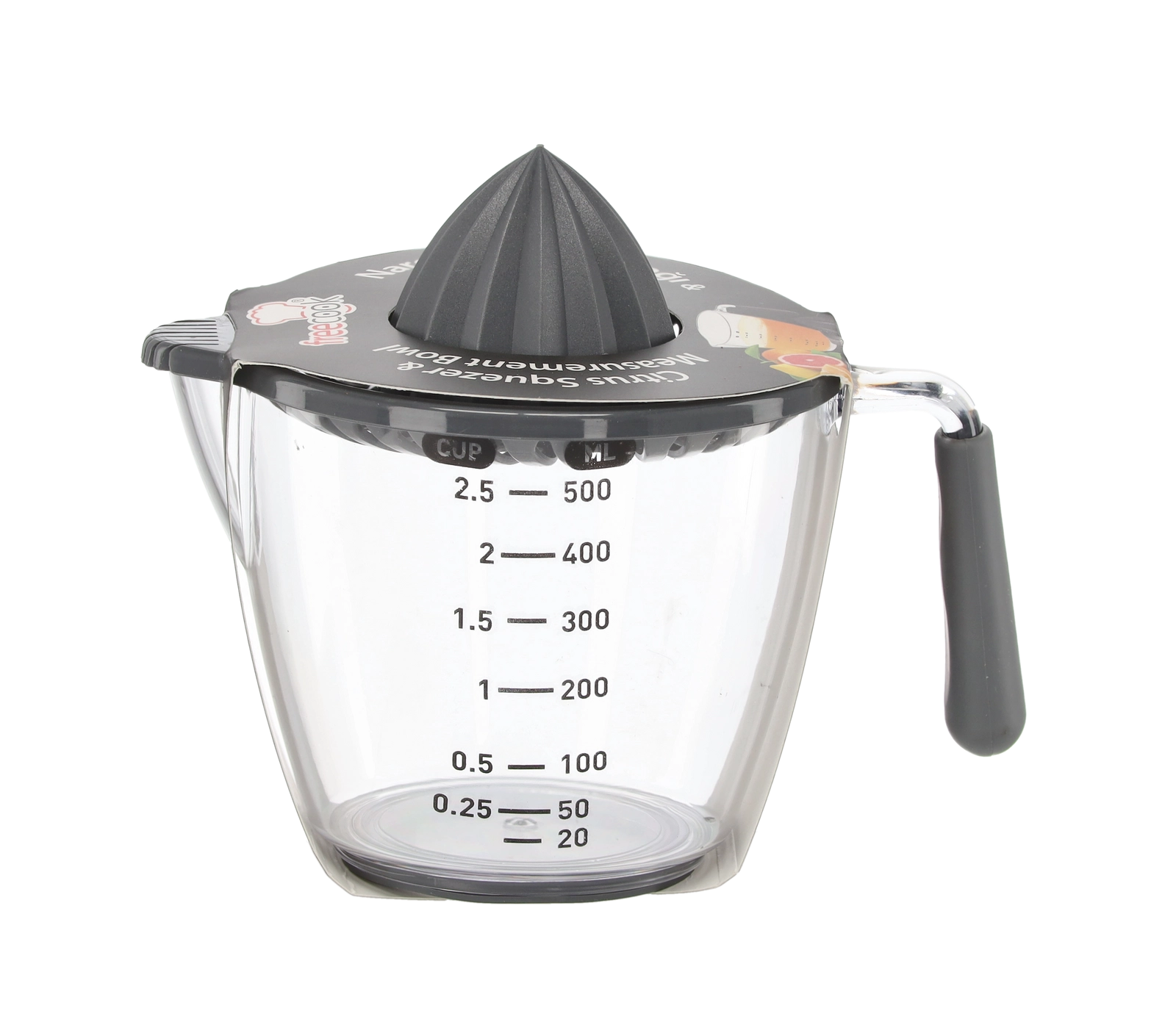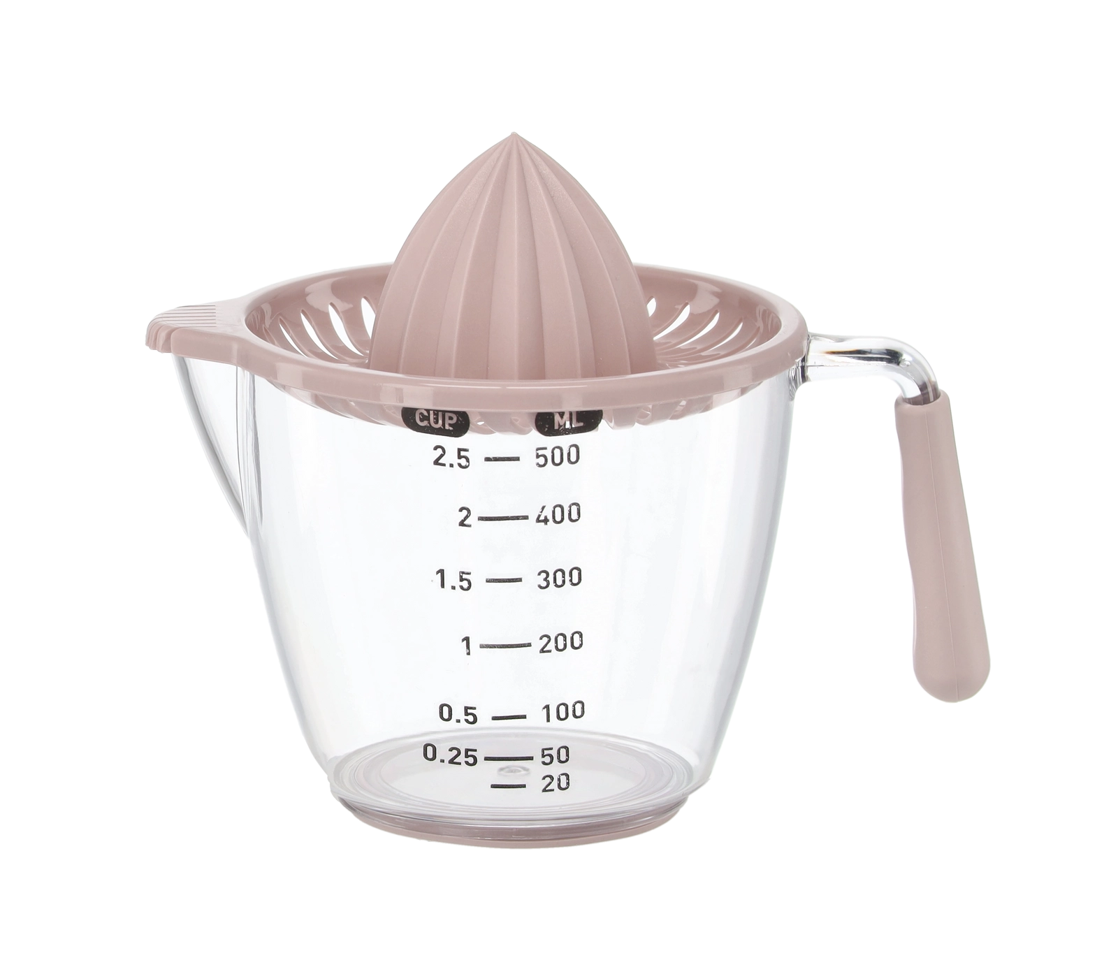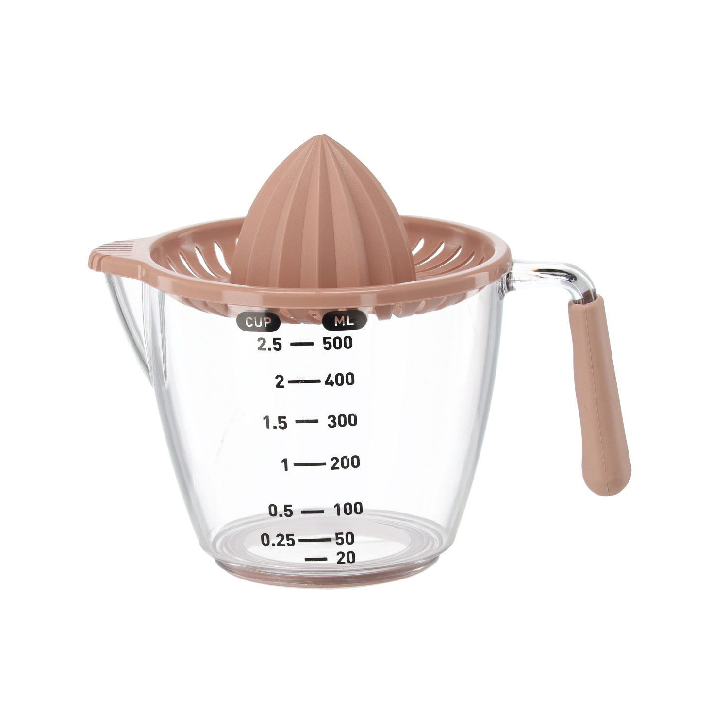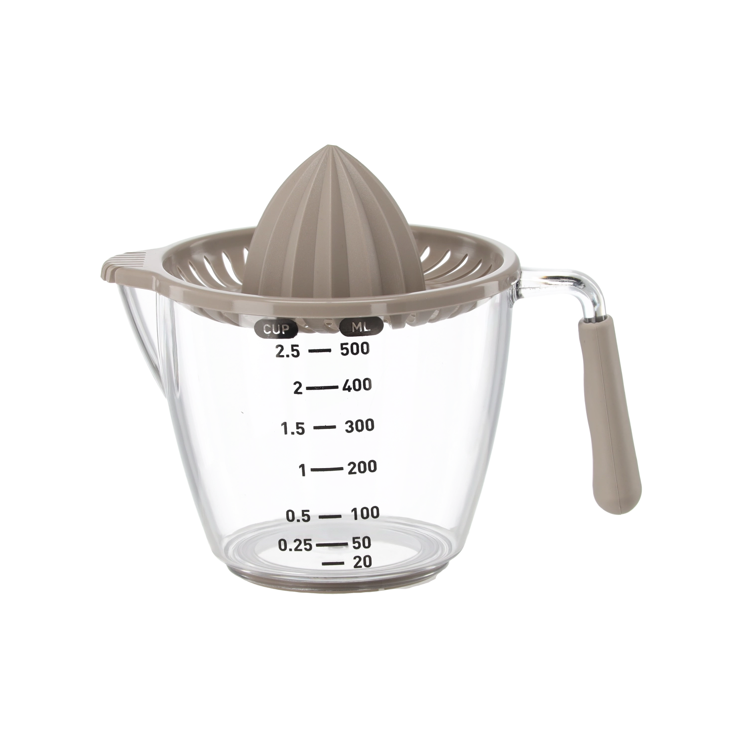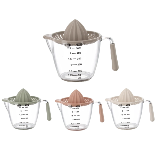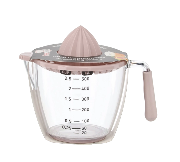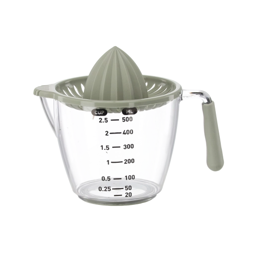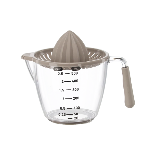 Deze compacte handmatige sappers perst citroenen, limoenen en sinaasappels direct in de transparante maatkan met aanduidingen in milliliters en cups. De geribbelde kegel extraheert efficiënt sap, terwijl de zeef pitten en pulp opvangt. Dankzij het comfortabele handvat en de praktische schenktuit schenk je zonder druppelen en knoeien.