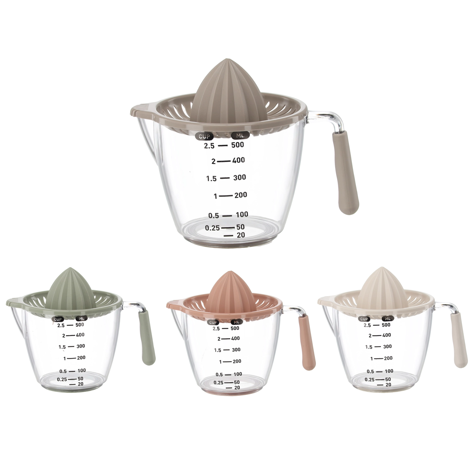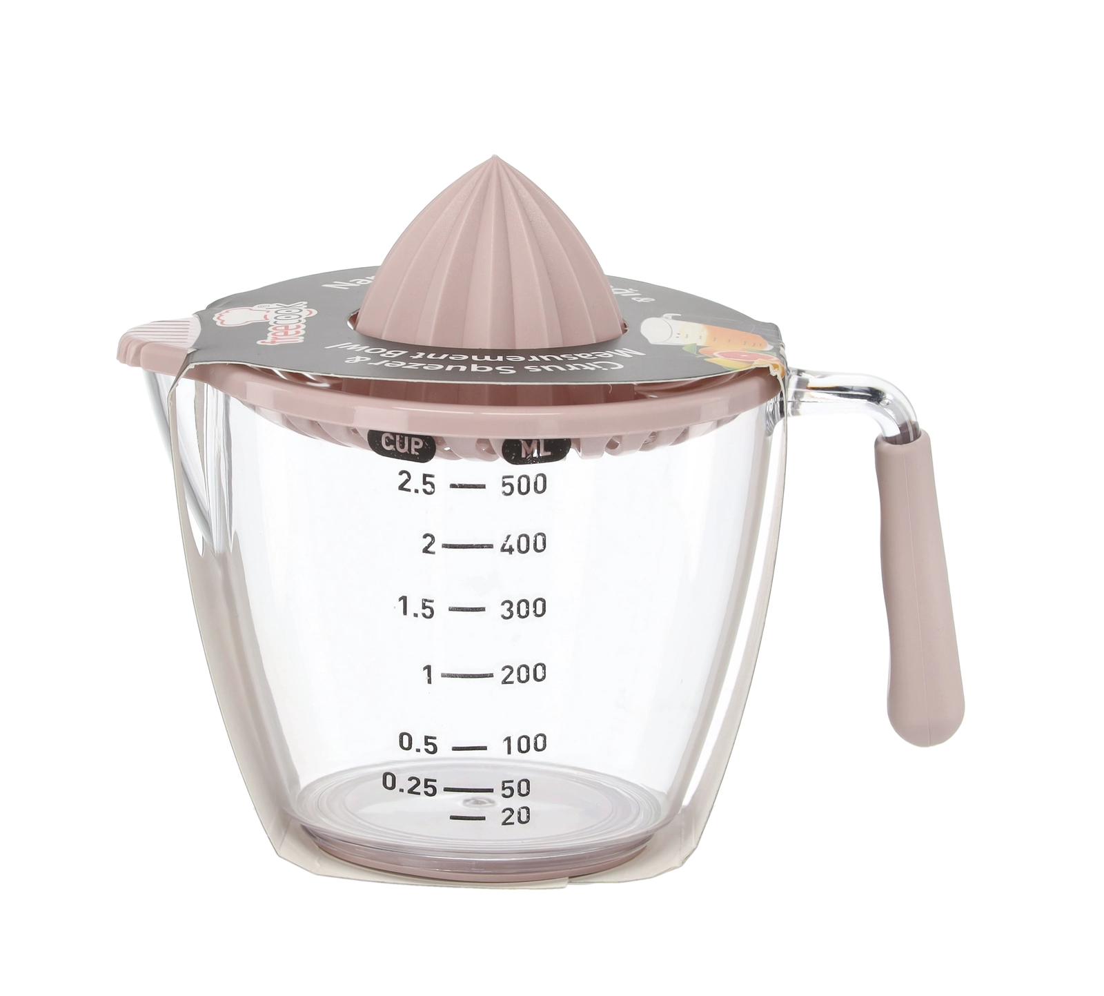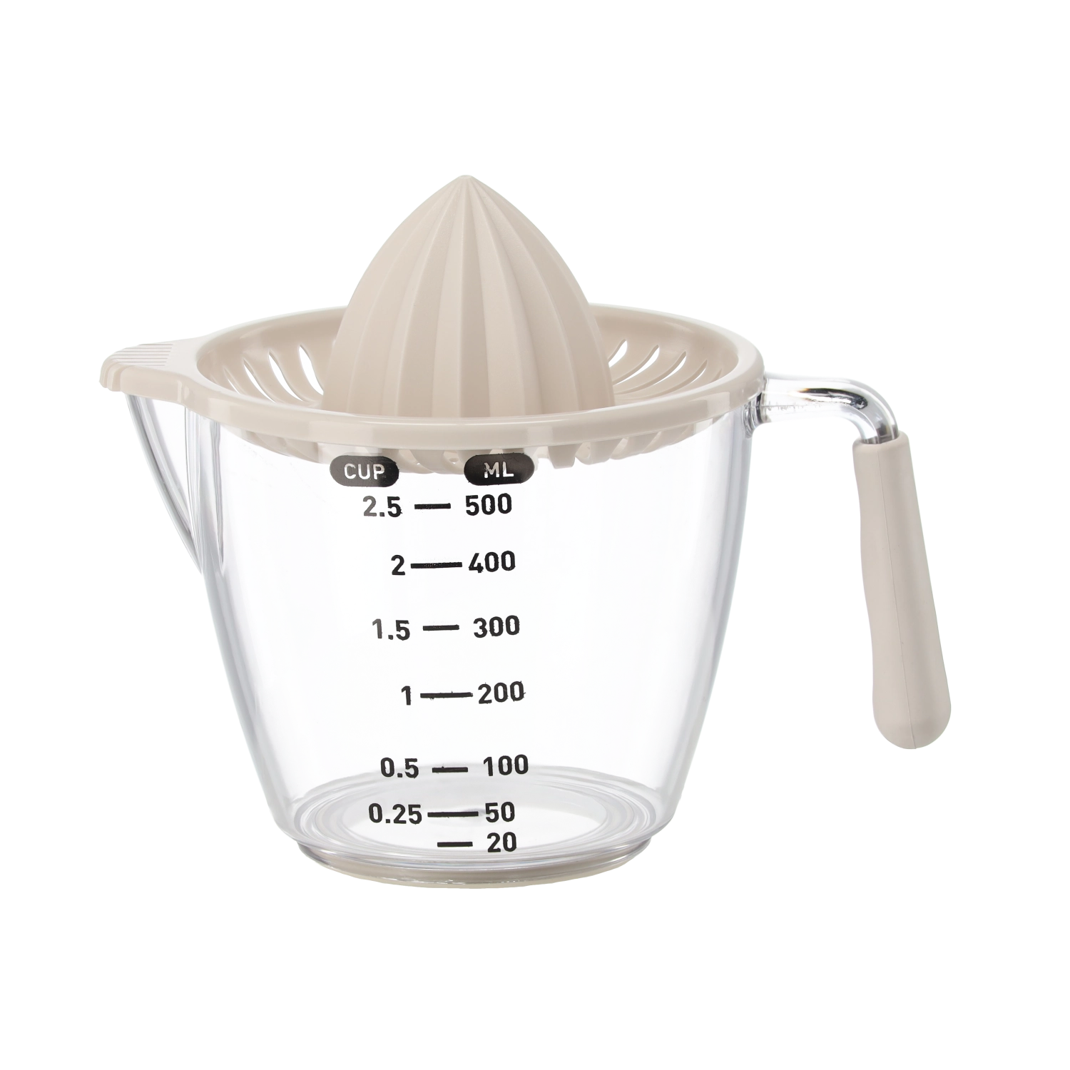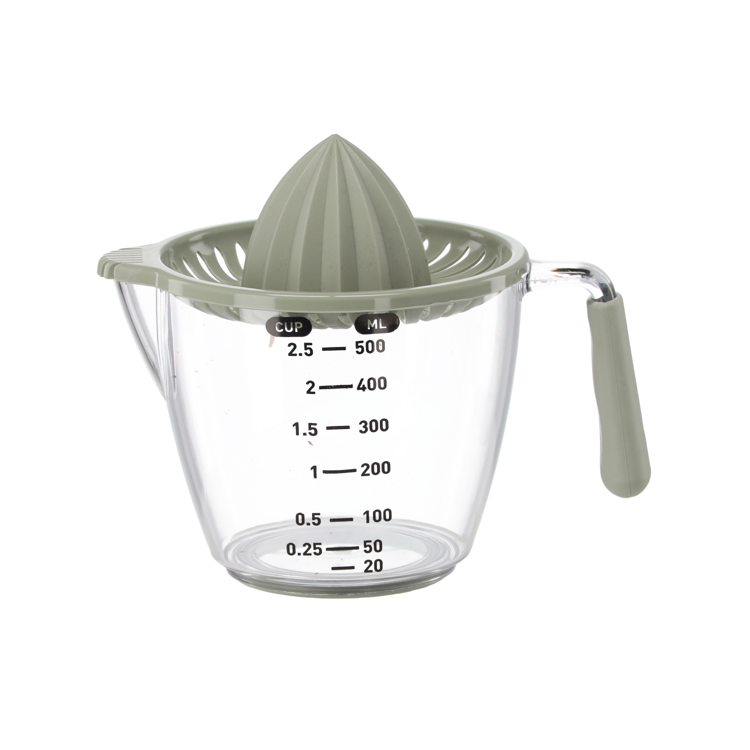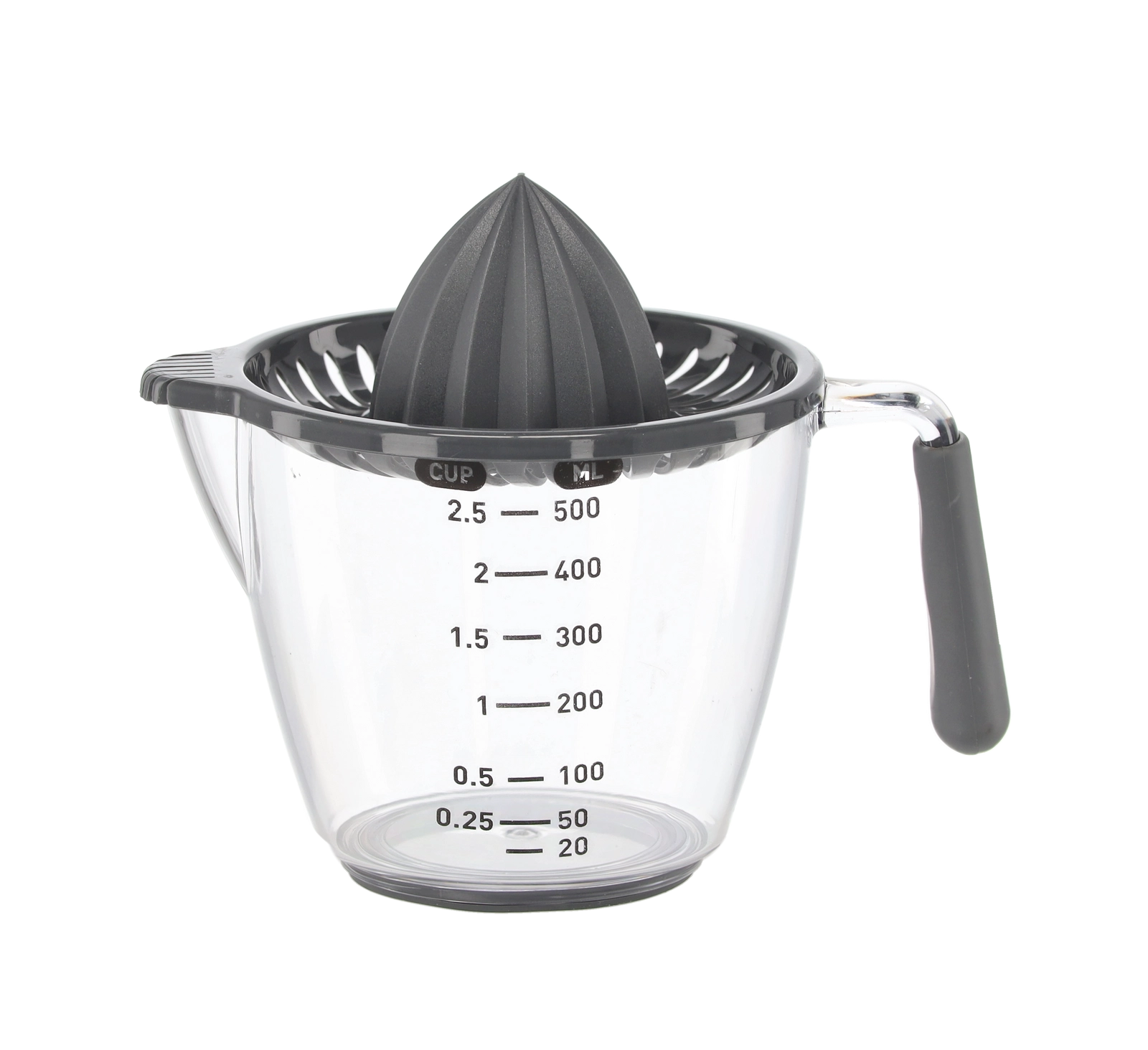Deze compacte handmatige sappers perst citroenen, limoenen en sinaasappels direct in de transparante maatkan met aanduidingen in milliliters en cups. De geribbelde kegel extraheert efficiënt sap, terwijl de zeef pitten en pulp opvangt. Dankzij het comfortabele handvat en de praktische schenktuit schenk je zonder druppelen en knoeien.
