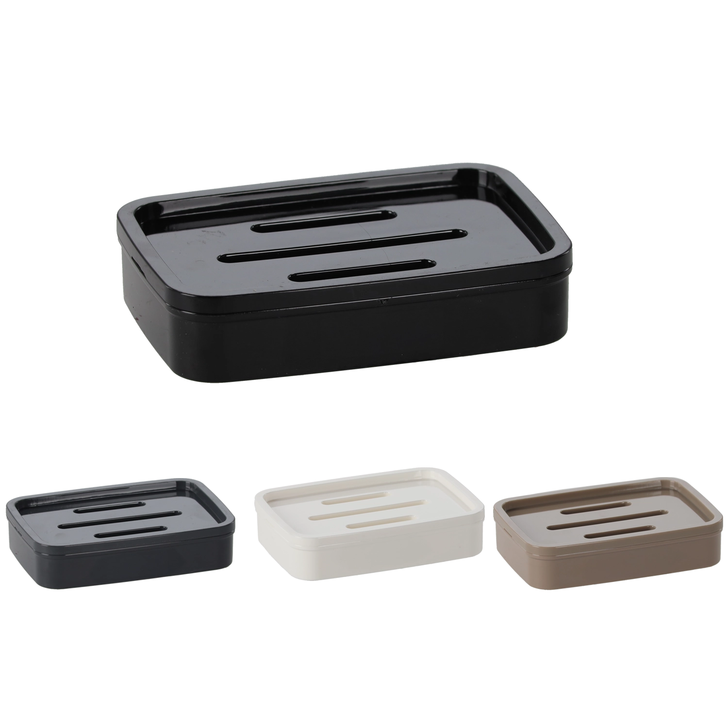 Drie langwerpige sleuven in het deksel/de inzet voeren water betrouwbaar af naar het onderste deel, zodat de zeep droog en stevig blijft.