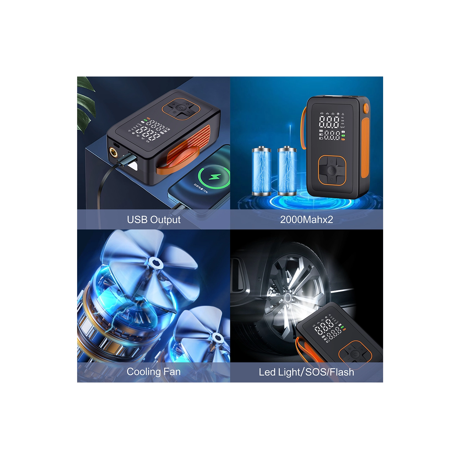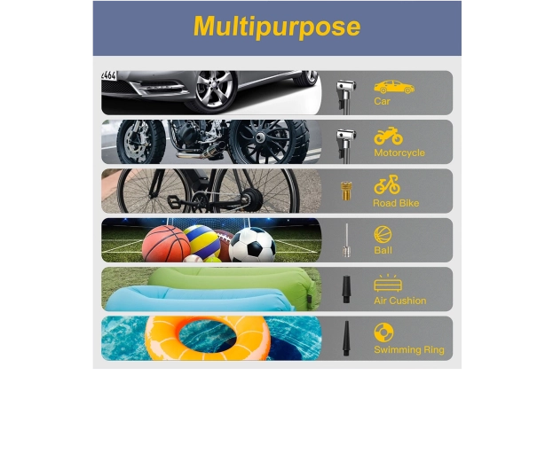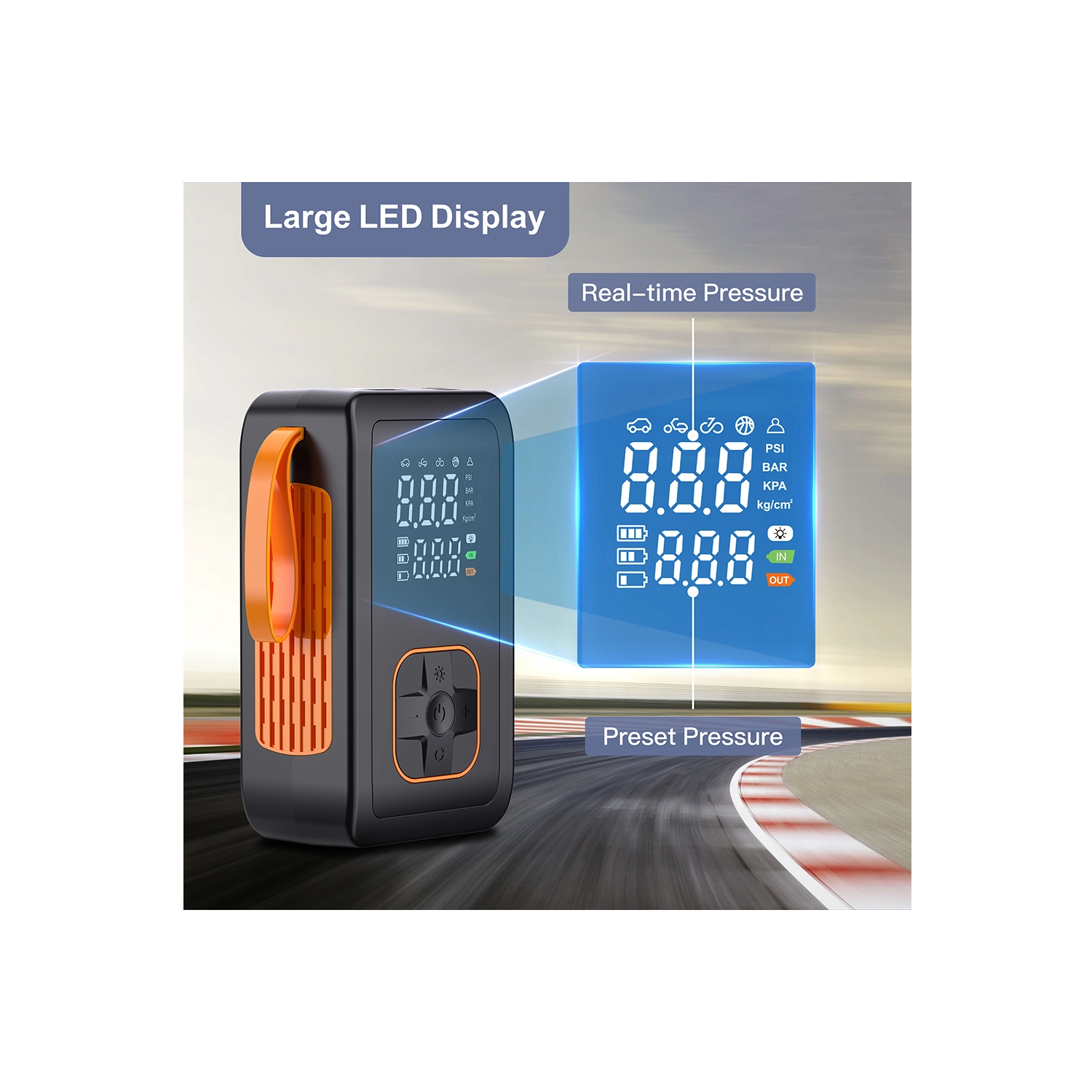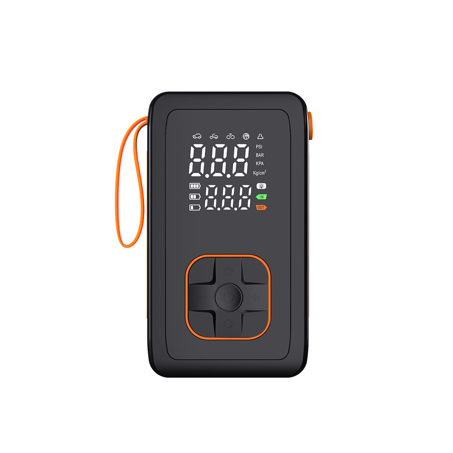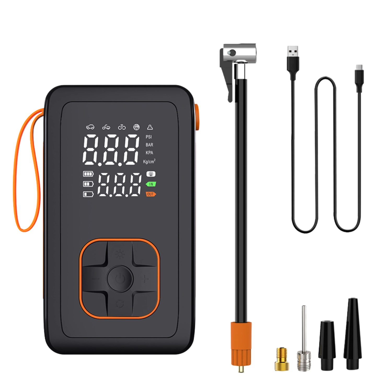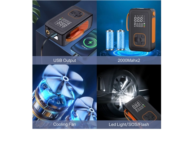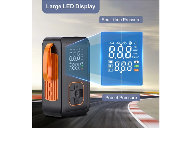Kies uit 5 snelle modi (auto, motor, fiets, sportbal, handmatig) en 4 drukeenheden (PSI, KPA, BAR, KG/CM²). De handmatige modus met geheugen onthoudt de laatste instelling. De geïntegreerde koelventilator verlengt de levensduur en het ontluchtingsventiel maakt fijn afstellen van de druk eenvoudig. De LED-zaklamp met 3 modi (standaard, SOS, knipperen) verhoogt de veiligheid bij werken in het donker.