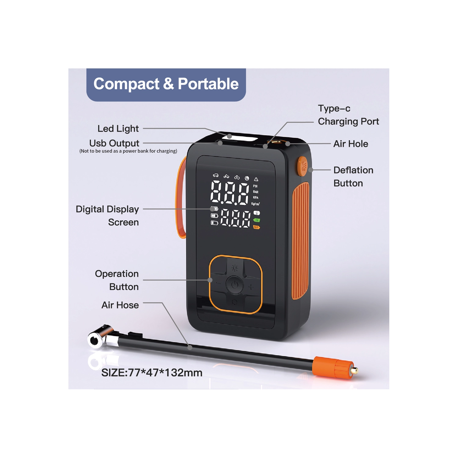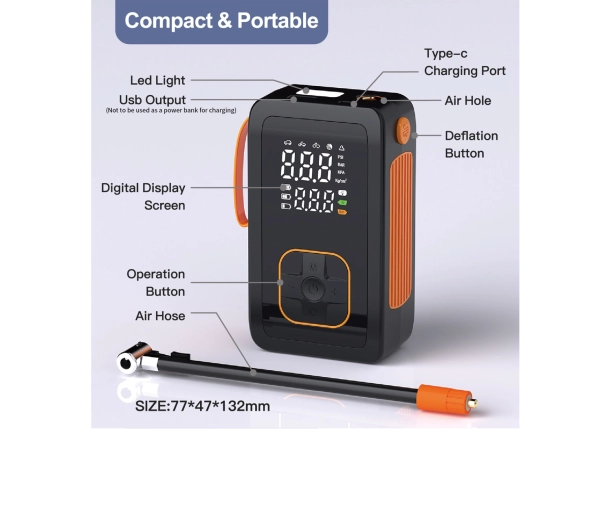 Deze draagbare 7,4 V accu-luchtpomp combineert krachtig oppompen tot 150 PSI / 10,3 BAR met een praktische powerbankfunctie. Dankzij het compacte formaat en het comfortabele handvat is hij ideaal voor onderweg, in de auto en in de werkplaats. Het dubbele digitale display toont zowel de ingestelde als de actuele druk, terwijl automatisch uitschakelen het oppompen stopt zodra de doelwaarde is bereikt.