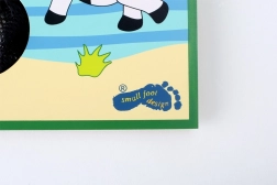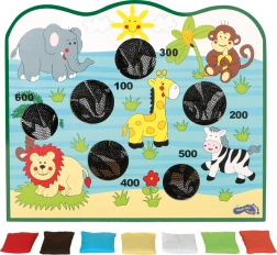 Het speelbord met kleurrijke illustraties van dieren en kleurrijke zakjes maken het spel aantrekkelijk en leuk voor kinderen.