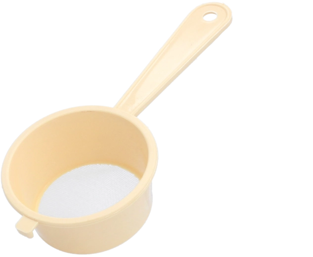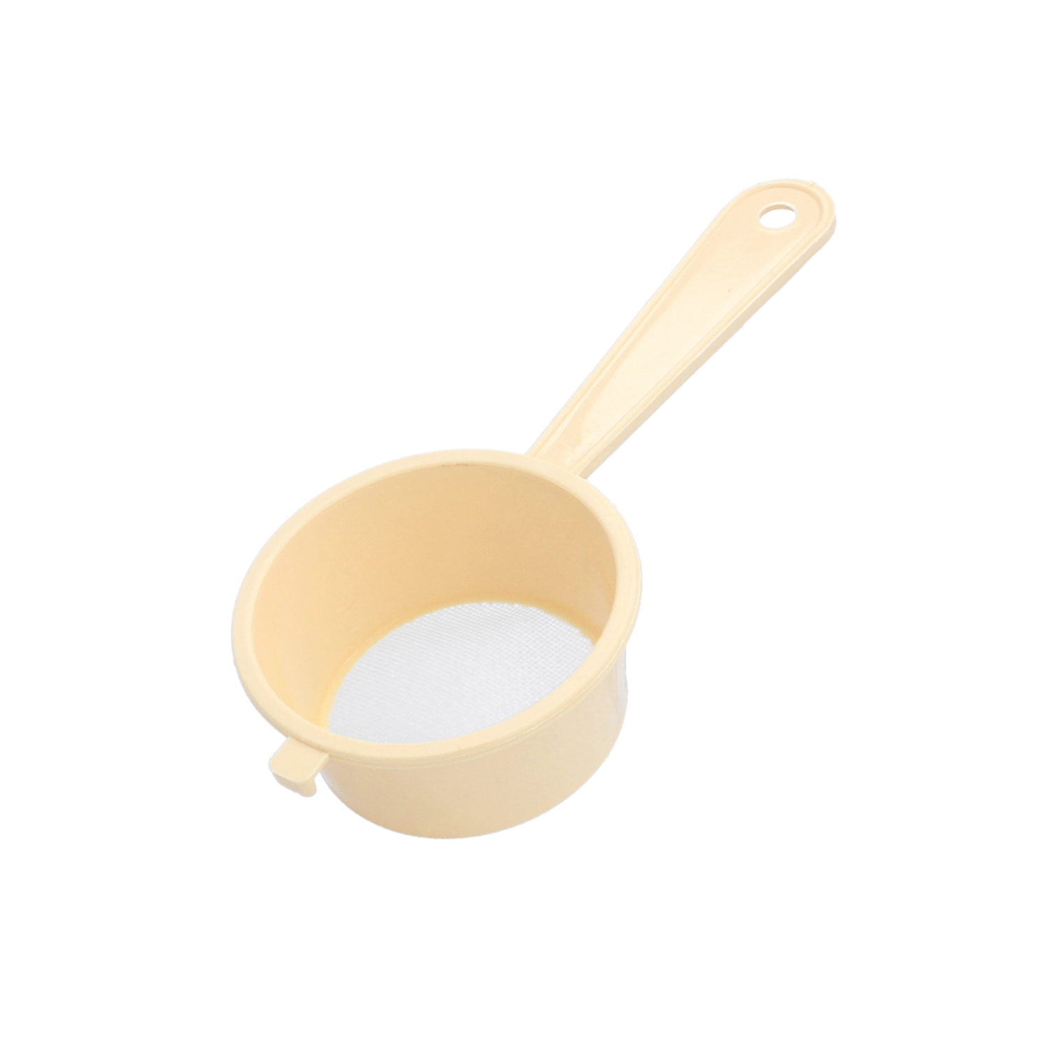 Praktische keukenzeef met een diameter van 7,5 cm en fijne mazen van 0,6 mm voor het zeven van bloem en poedersuiker, het filteren van vloeistoffen en het afgieten van kleine etenswaren. Licht en duurzaam plastic dat geschikt is voor contact met voedsel, met een ergonomisch handvat en een ophangoog voor comfortabel gebruik en ruimtebesparing.
