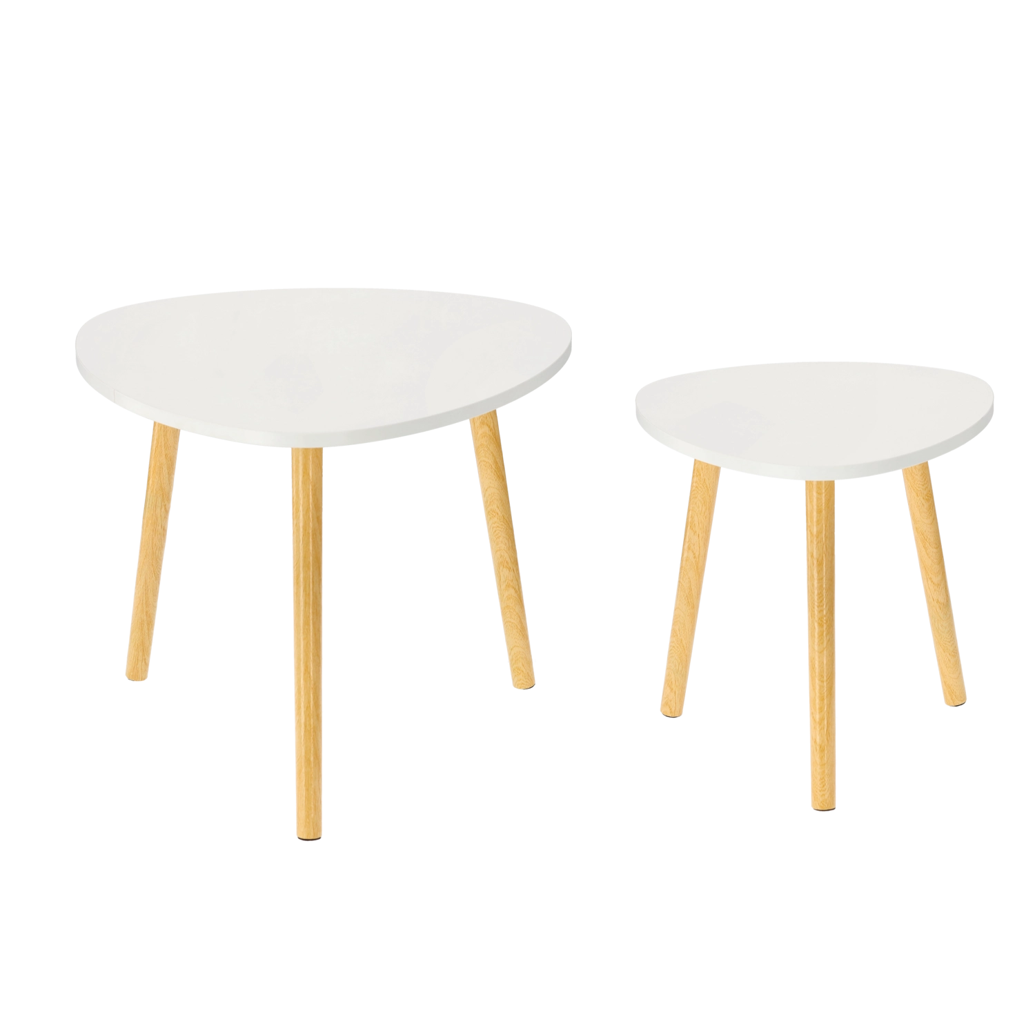 Stijlvolle set van twee salontafels met een combinatie van een wit blad en poten van natuurlijk hout, die Scandinavisch minimalisme, een lichte uitstraling en praktische flexibiliteit in elk interieur brengt. De asymmetrische driehoekige/afgeronde vorm oogt origineel en past in de woonkamer, slaapkamer en studeerkamer.