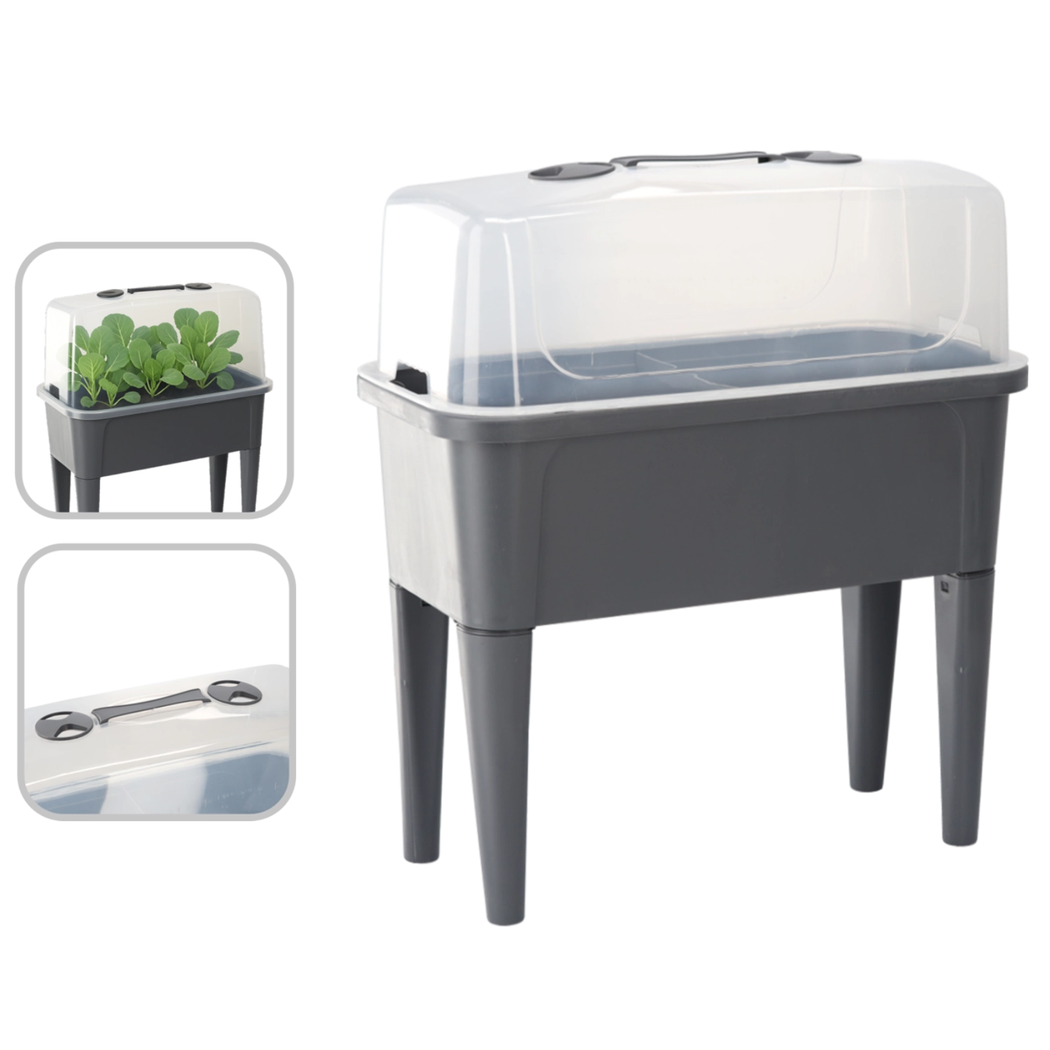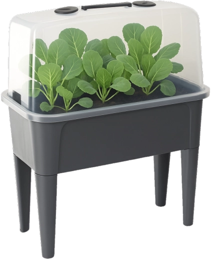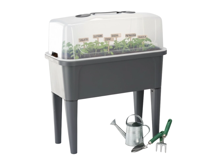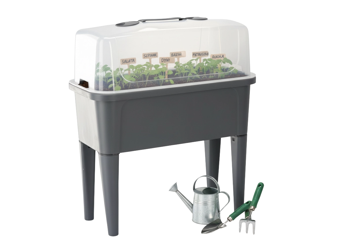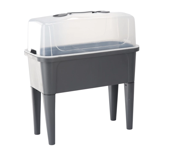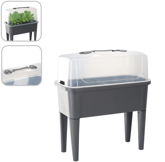 De praktische mini-kas op poten combineert het gemak van een verhoogde bak met effectieve bescherming tegen weersinvloeden. De transparante koepel houdt constante warmte en vochtigheid vast voor een snelle start van zaaien, het bewortelen van stekken en het kweken van kruiden. Dankzij de ventilatieopeningen in het deksel heb je de luchtstroom volledig onder controle.