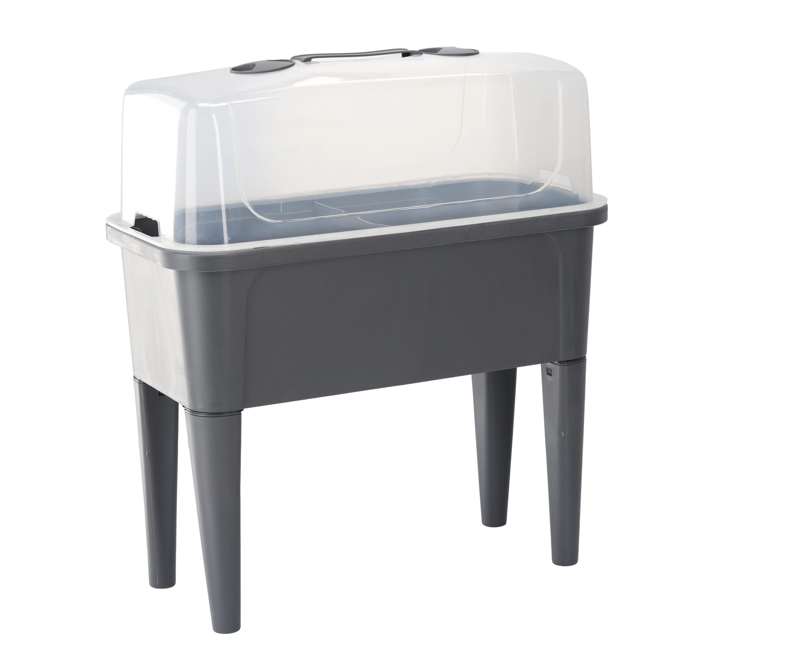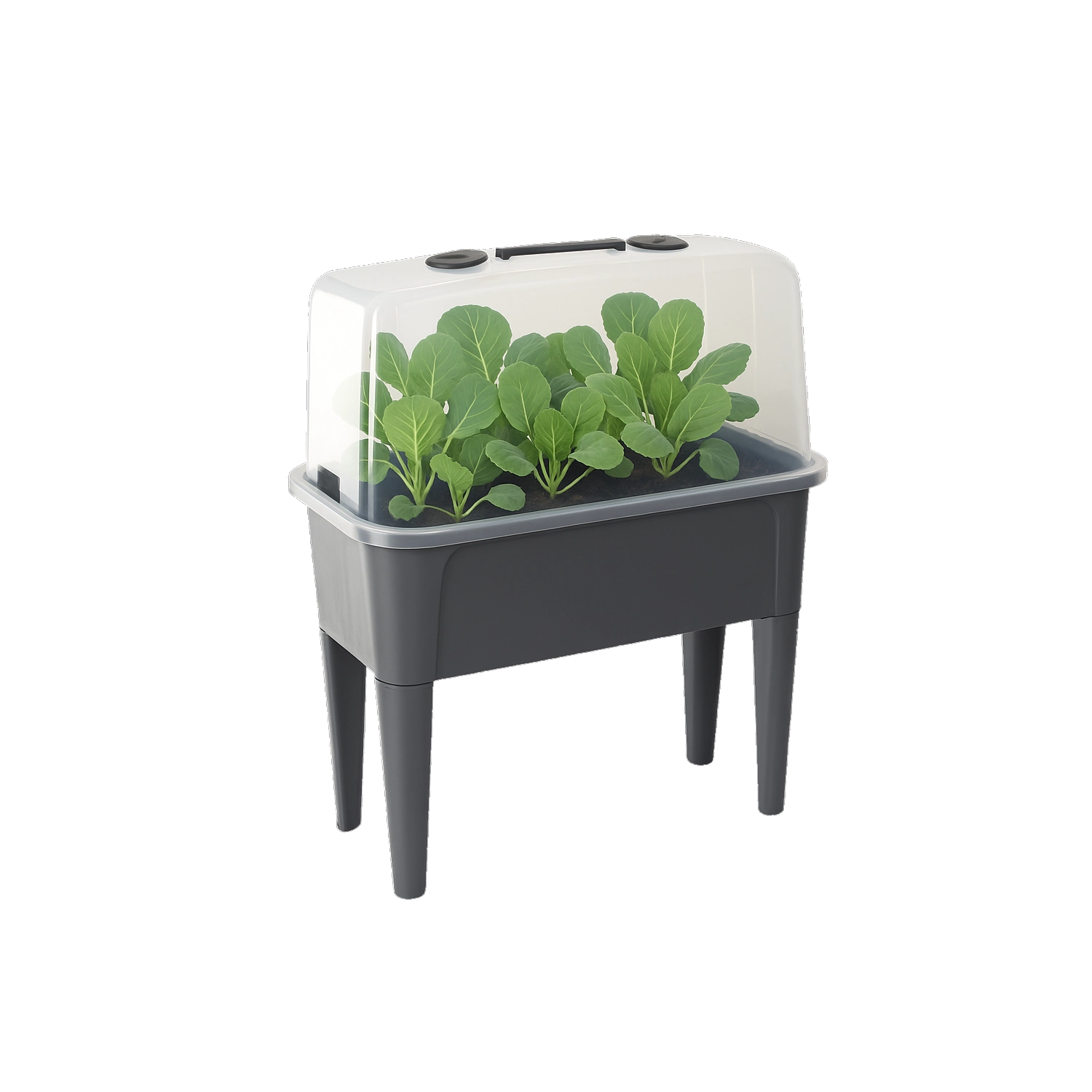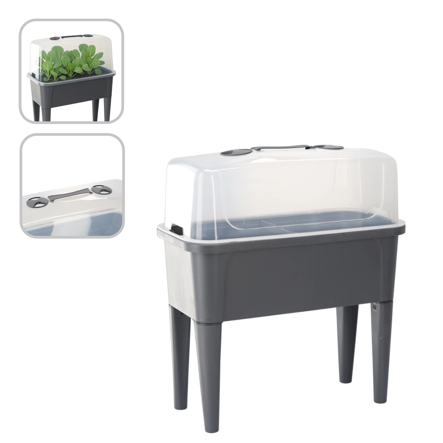 De praktische mini-kas op poten combineert het gemak van een verhoogde bak met effectieve bescherming tegen weersinvloeden. De transparante koepel houdt constante warmte en vochtigheid vast voor een snelle start van zaaien, het bewortelen van stekken en het kweken van kruiden. Dankzij de ventilatieopeningen in het deksel heb je de luchtstroom volledig onder controle.