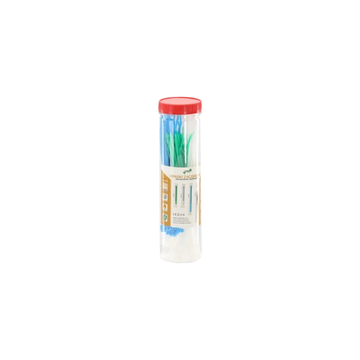 - 50 stuks 2,5 × 100 mm – groen; 50 stuks 2,5 × 100 mm – wit; 50 stuks 2,5 × 150 mm – blauw; 50 stuks 3,6 × 200 mm – wit