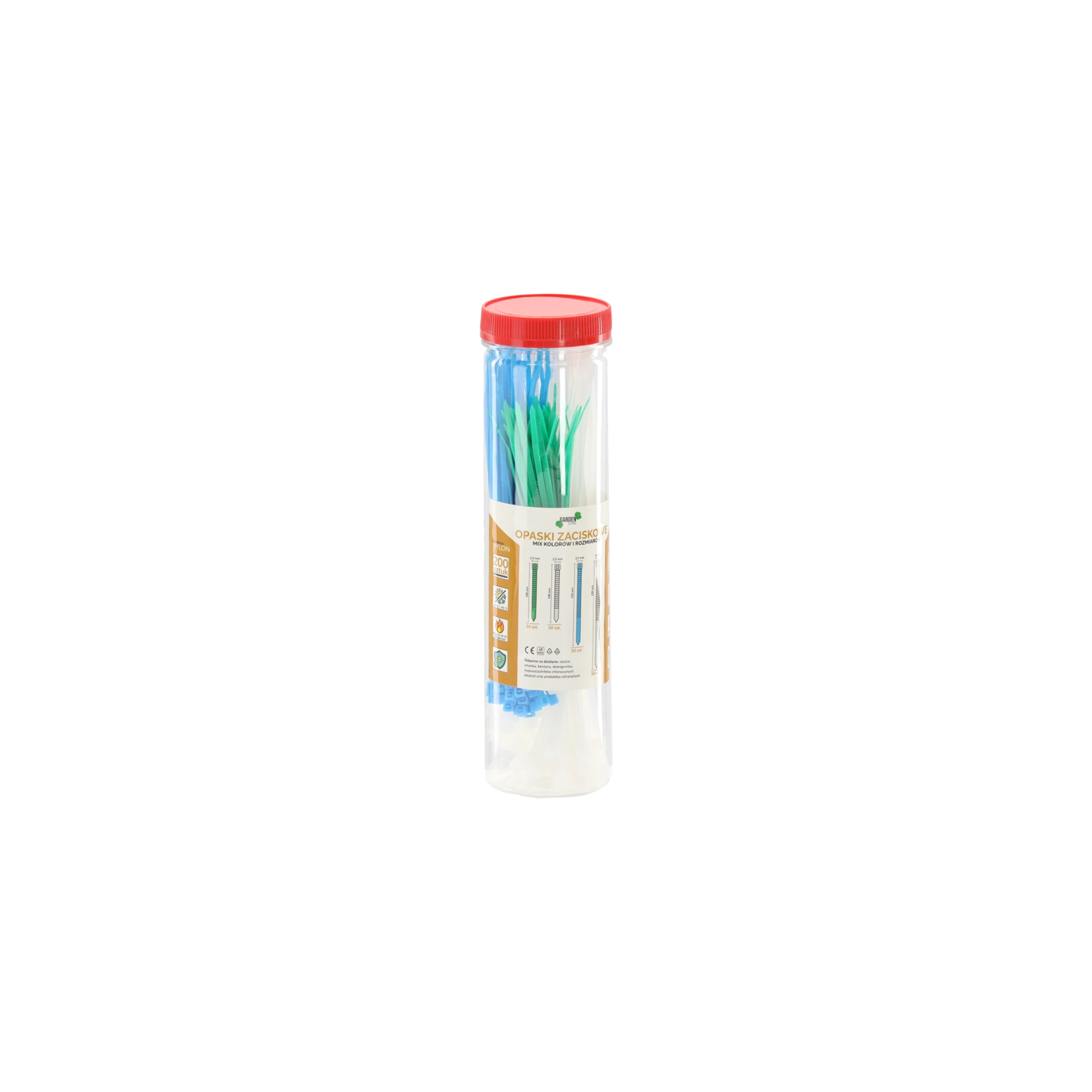 Praktische koker met 200 nylon kabelbinders in diverse lengtes en kleuren voor universeel gebruik in werkplaats, huishouden en bij elektrotechnische installaties. De binders zijn van duurzaam nylon, hebben zelfdovende klasse UL 94 V2, zijn UV‑bestendig en verdragen een breed temperatuurbereik. Ze zijn bestand tegen oliën, smeermiddelen, benzine en gangbare detergenten en oplosmiddelen.