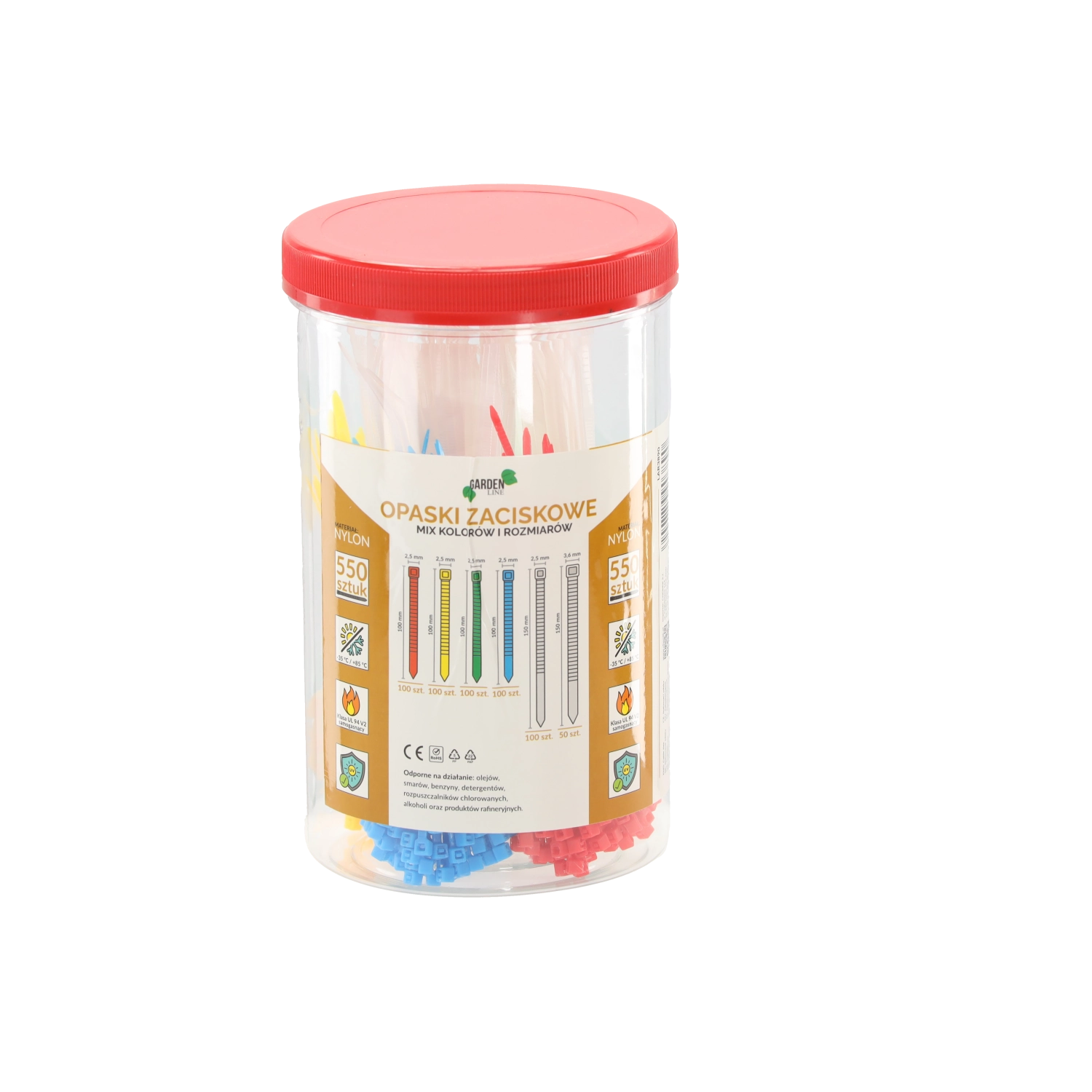 Universele set met 550 hoogwaardige nylon kabelbinders in een praktische koker. Bevat een mix van kleuren en maten voor snel sorteren en gebruik thuis, in de werkplaats en in de industrie. De ty-raps zijn zelfdovend (UL 94 V2), UV-bestendig en bestand tegen chemicaliën, geschikt voor een breed temperatuurbereik en betrouwbare fixatie van kabels, slangen en kleine componenten.