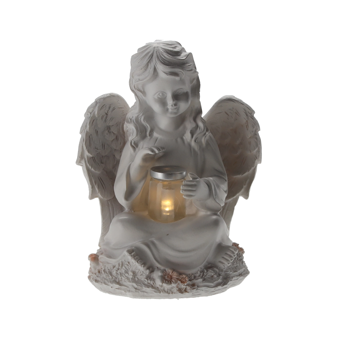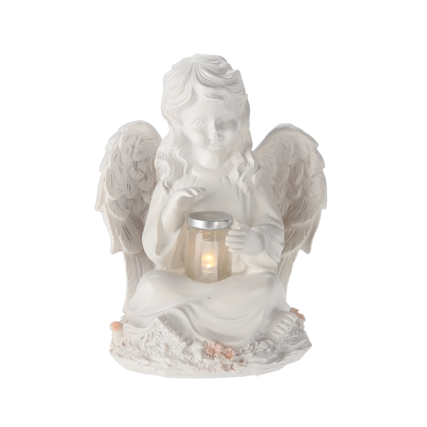 Elegante engelenfiguur van duurzaam hars met geïntegreerde zonne-LED-verlichting die overdag siert en na zonsondergang zacht, rustgevend licht geeft gedurende 6–8 uur. Dankzij automatisch opladen zonder kabels of batterijen is hij ideaal voor de tuin, het terras en gedenkplekken, is hij bestand tegen regen, vorst en zon en creëert hij een sfeervolle ambiance.