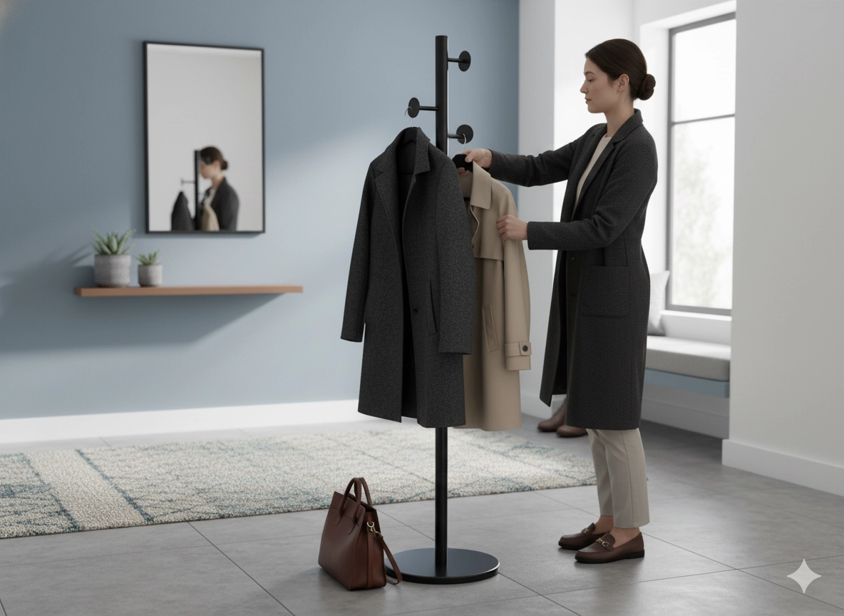 Afwisselend geplaatste haken op verschillende hoogtes maken het mogelijk jassen, hoeden, sjaals en handtassen op te hangen zonder te kreuken.