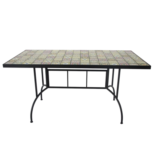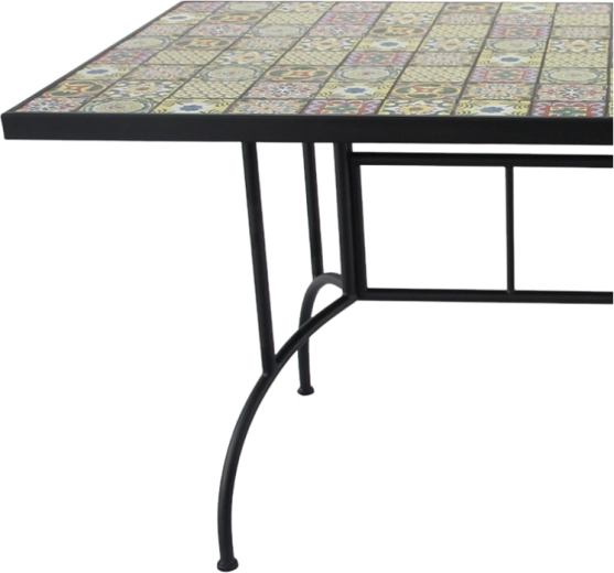De rechthoekige mozaïektafel met afmetingen 150 × 80 × 74 cm is een ideale keuze voor buiten dineren. De kleurrijke mozaïek geeft de ruimte een uitgesproken karakter, terwijl het zwarte metalen frame met decoratieve elementen een moderne en tijdloze uitstraling onderstreept. Dankzij het royale blad is er comfortabel plaats voor meerdere personen en is de tafel geschikt voor terrassen, tuinen en patio’s.