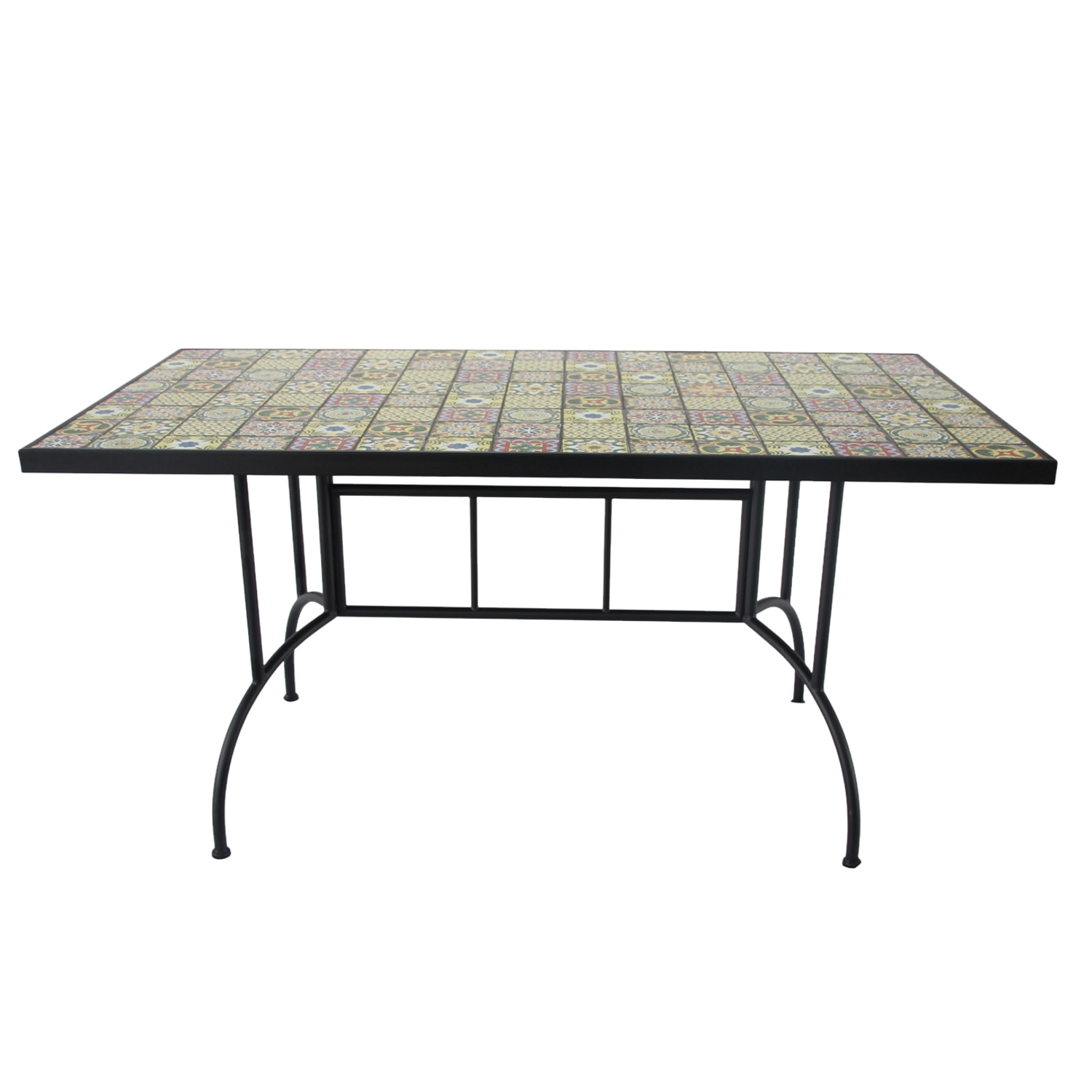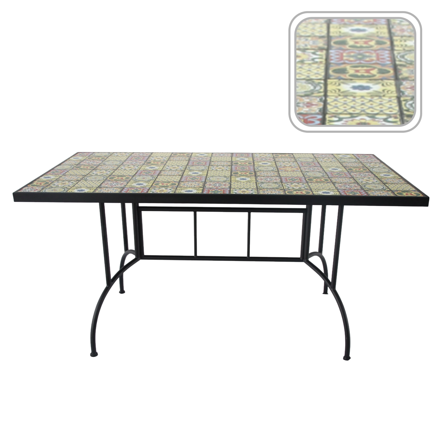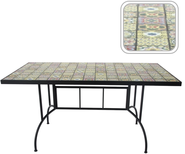 Stabiele metalen poten met verstevigingen zorgen voor stevigheid en zekerheid op diverse ondergronden. Het gladde, afwasbare mozaïekoppervlak is eenvoudig te onderhouden, waardoor de tafel perfect is voor dagelijks gebruik en weekendbarbecues. Combineer hem moeiteloos met rieten of metalen stoelen en creëer een harmonieuze outdoorset.