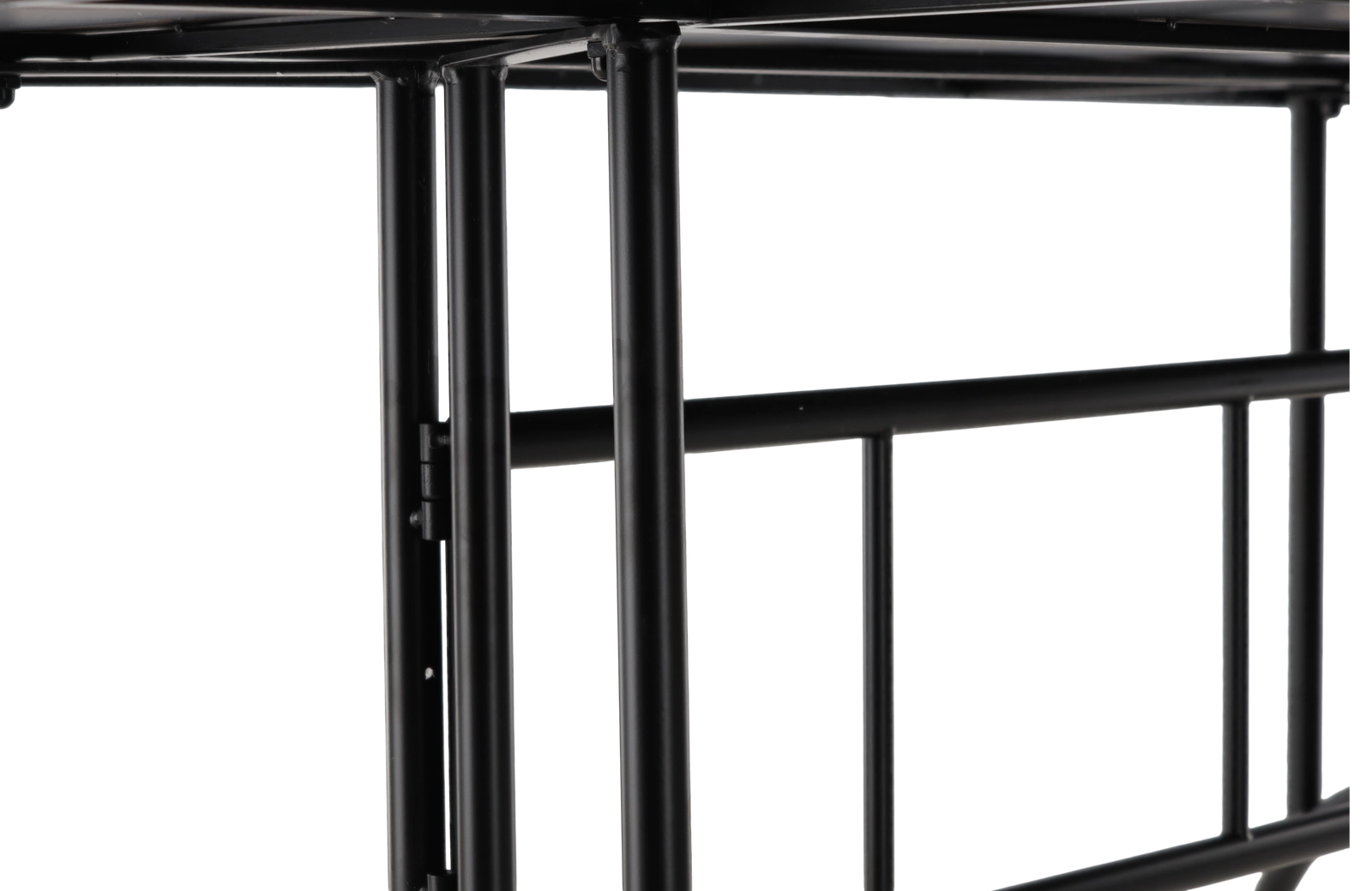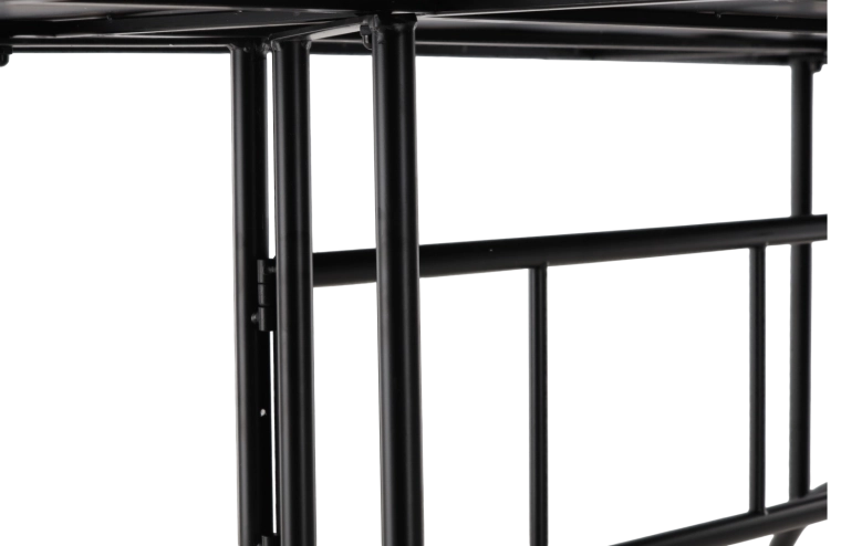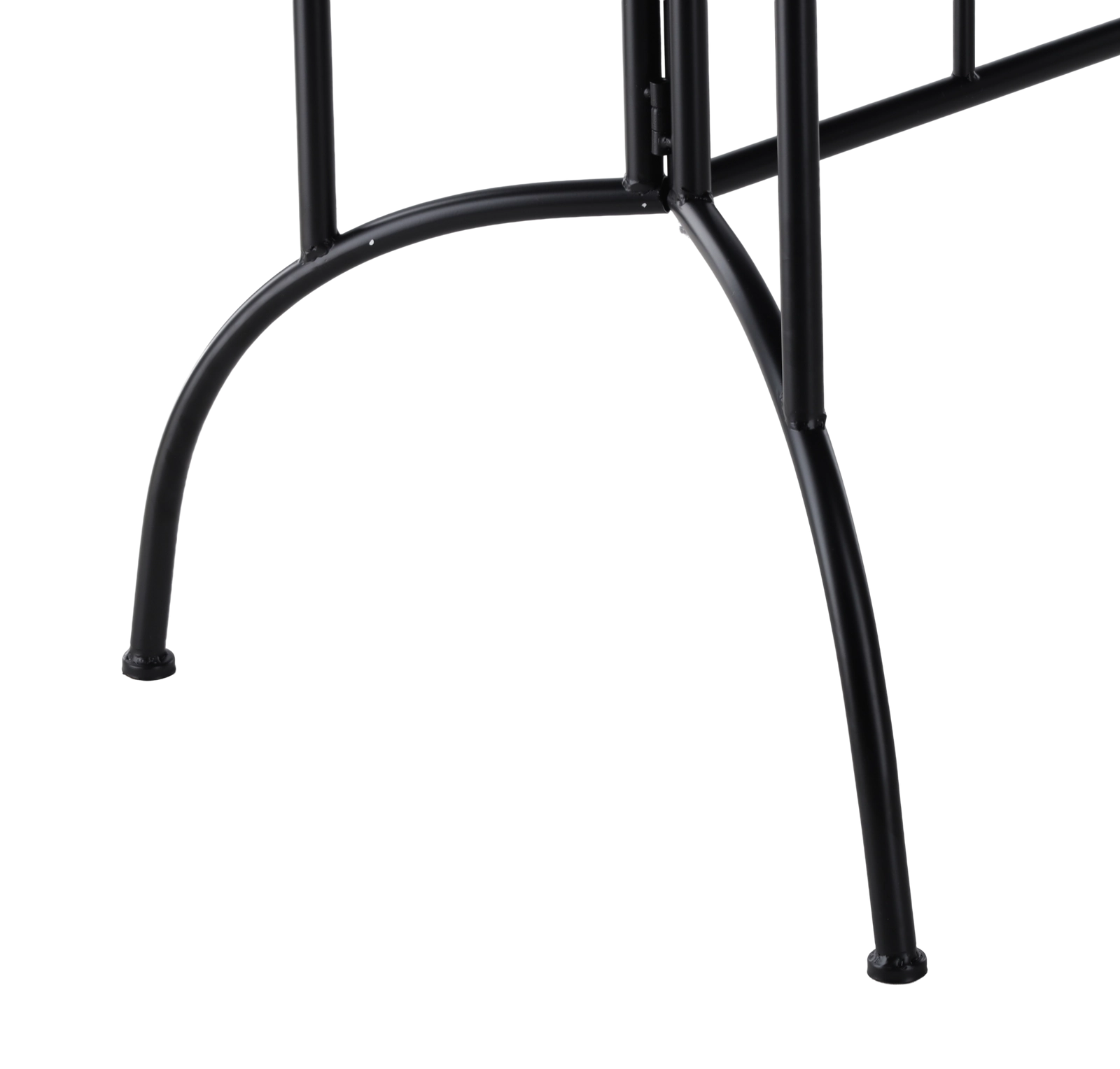 De zwarte metalen voet met kruisversteviging en sierlijke elementen garandeert uitstekende stabiliteit en weerstand tegen dagelijks gebruik op terras of in de tuin.