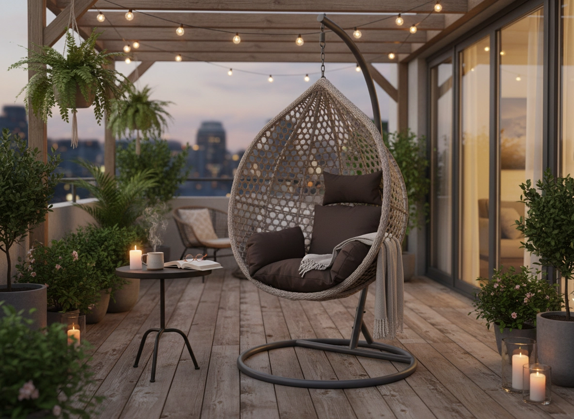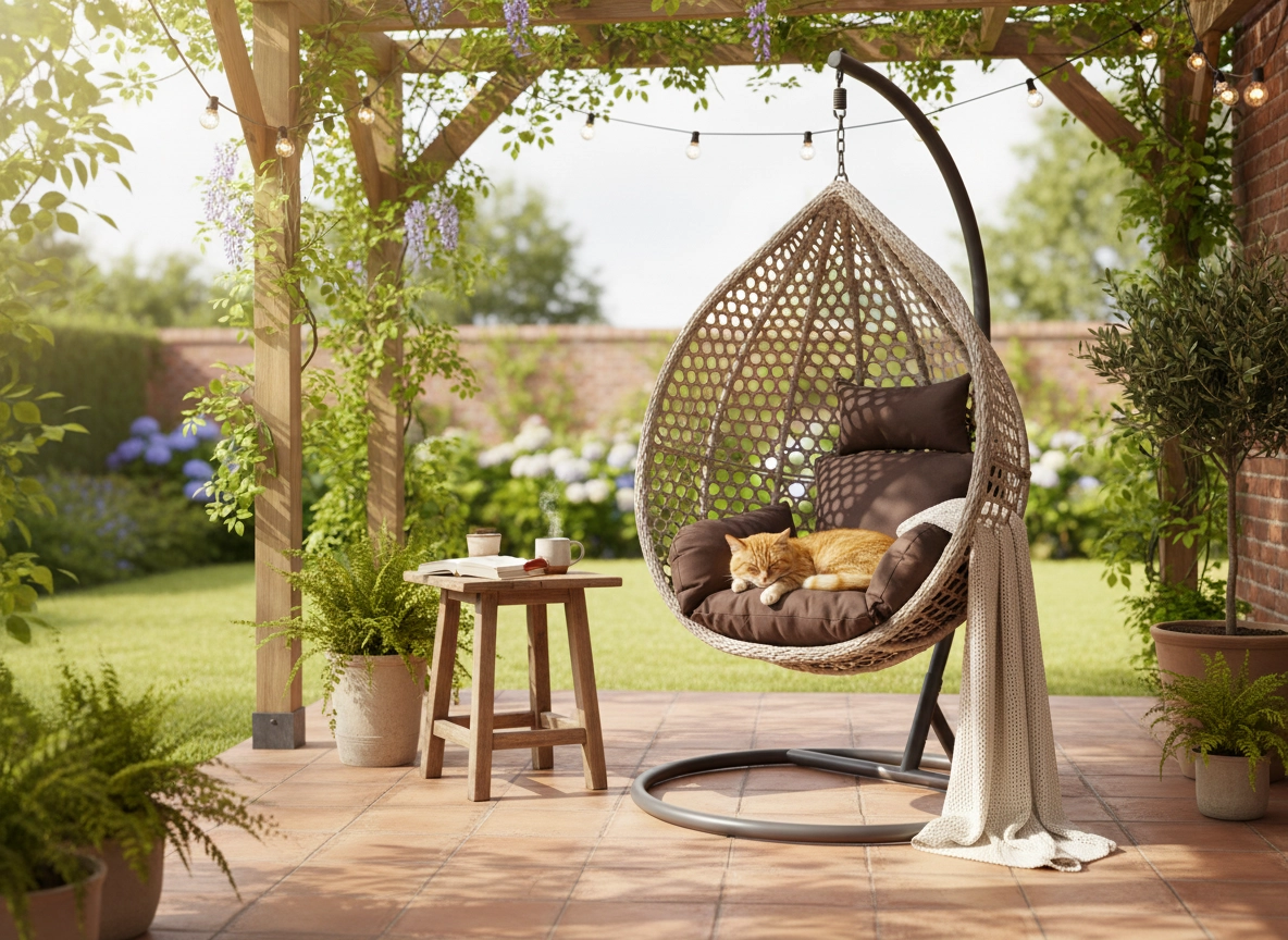 Dikke zitkussens en rugsteunen creëren een knus “nest” om te lezen, te ontspannen of buiten te zitten.