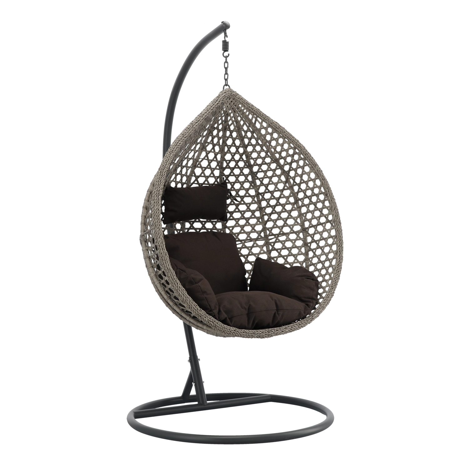 De stijlvolle hangstoel in een egale grijstint brengt een rustgevende sfeer en comfort naar elk terras, balkon en woonkamer. Het robuuste donkergrijze frame zorgt voor stabiliteit en veilig schommelen, terwijl de ruime mand met zachte kussens uitnodigt tot ontspanning. Dankzij het tijdloze design en de duurzame materialen is hij ideaal voor relax en dagelijks gebruik, zowel binnen als buiten.