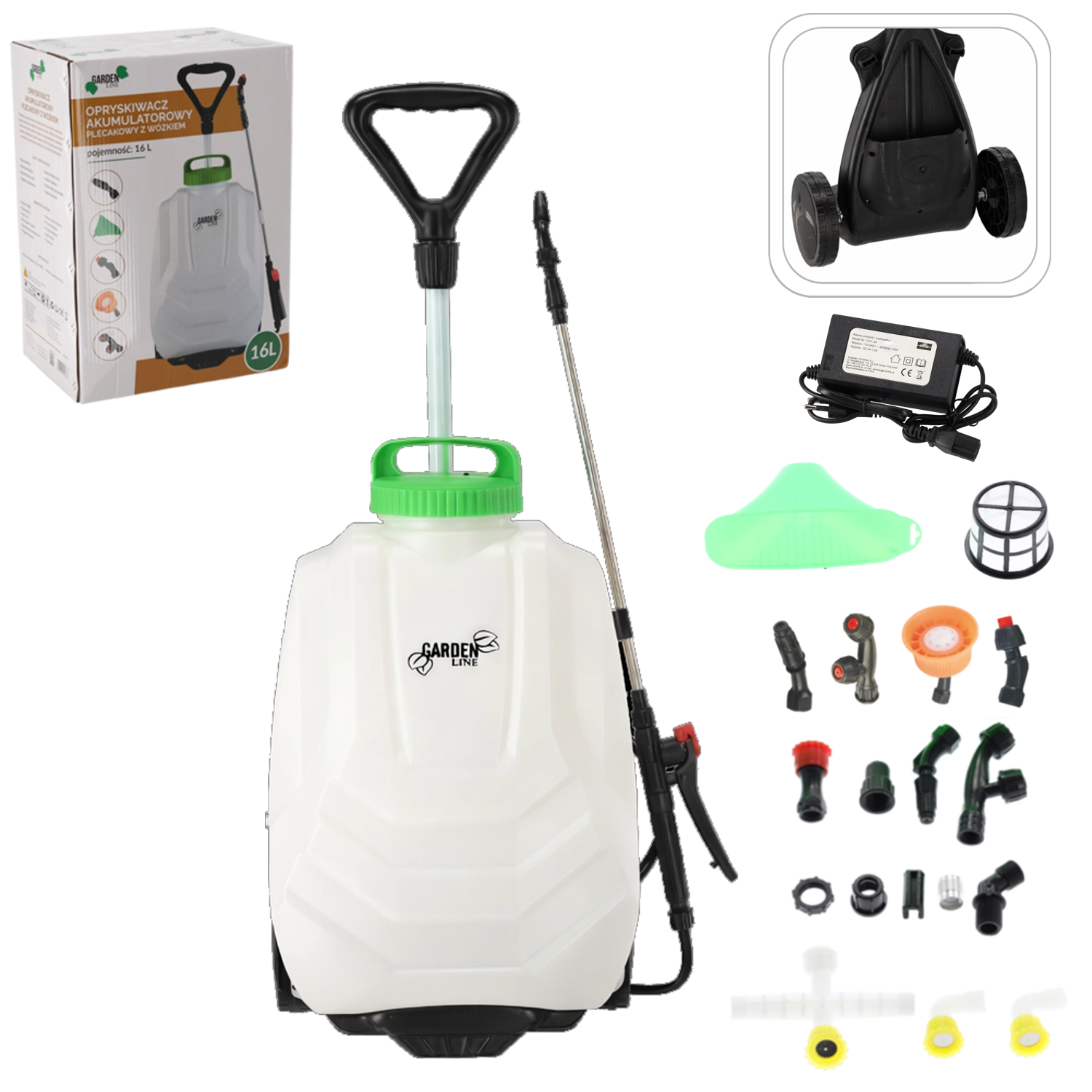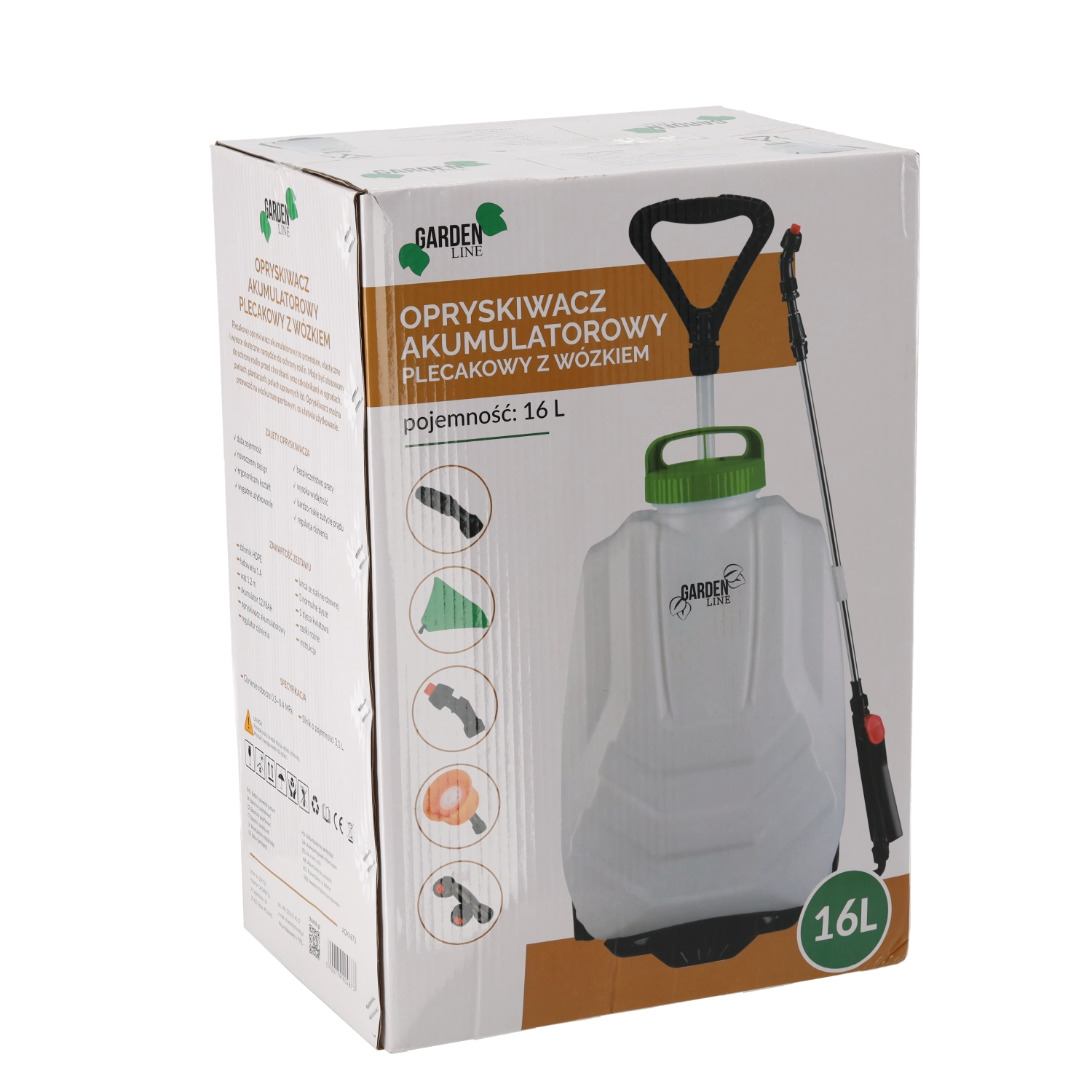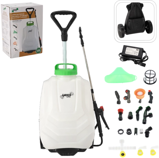 De duurzame constructie van HDPE is bestand tegen intensief gebruik en chemische middelen. In de set vindt u 4 verwisselbare sproeikoppen, een korte lans, een slang van 1,2 m, een 12V/8Ah accu en een lader voor snelle ingebruikname. Dankzij de elektrische pomp met een capaciteit van 3,1 l/min behaalt u consistente resultaten zonder vermoeiend pompen.