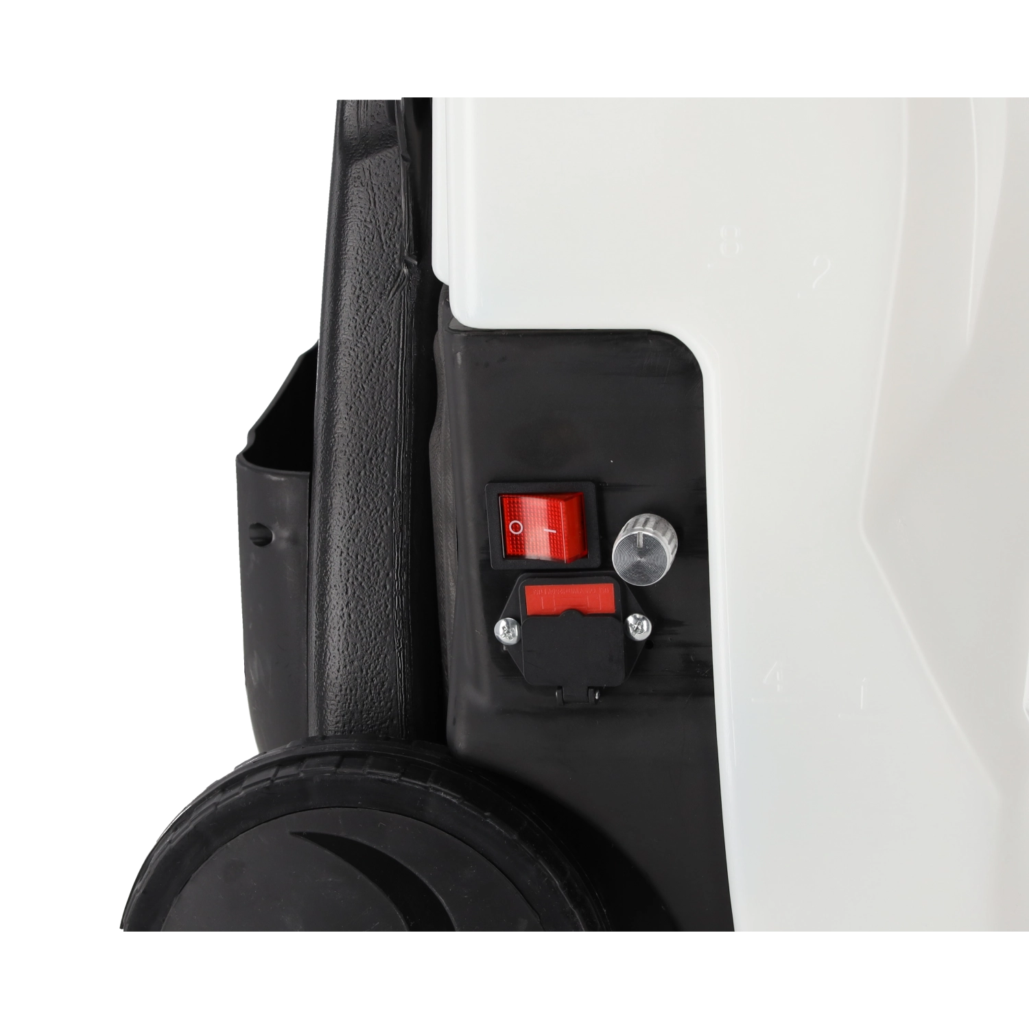 De elektrisch aangedreven pomp op accu en overzichtelijke bedieningsknoppen maken het mogelijk de druk precies in te stellen en de sproeiing volledig onder controle te houden.