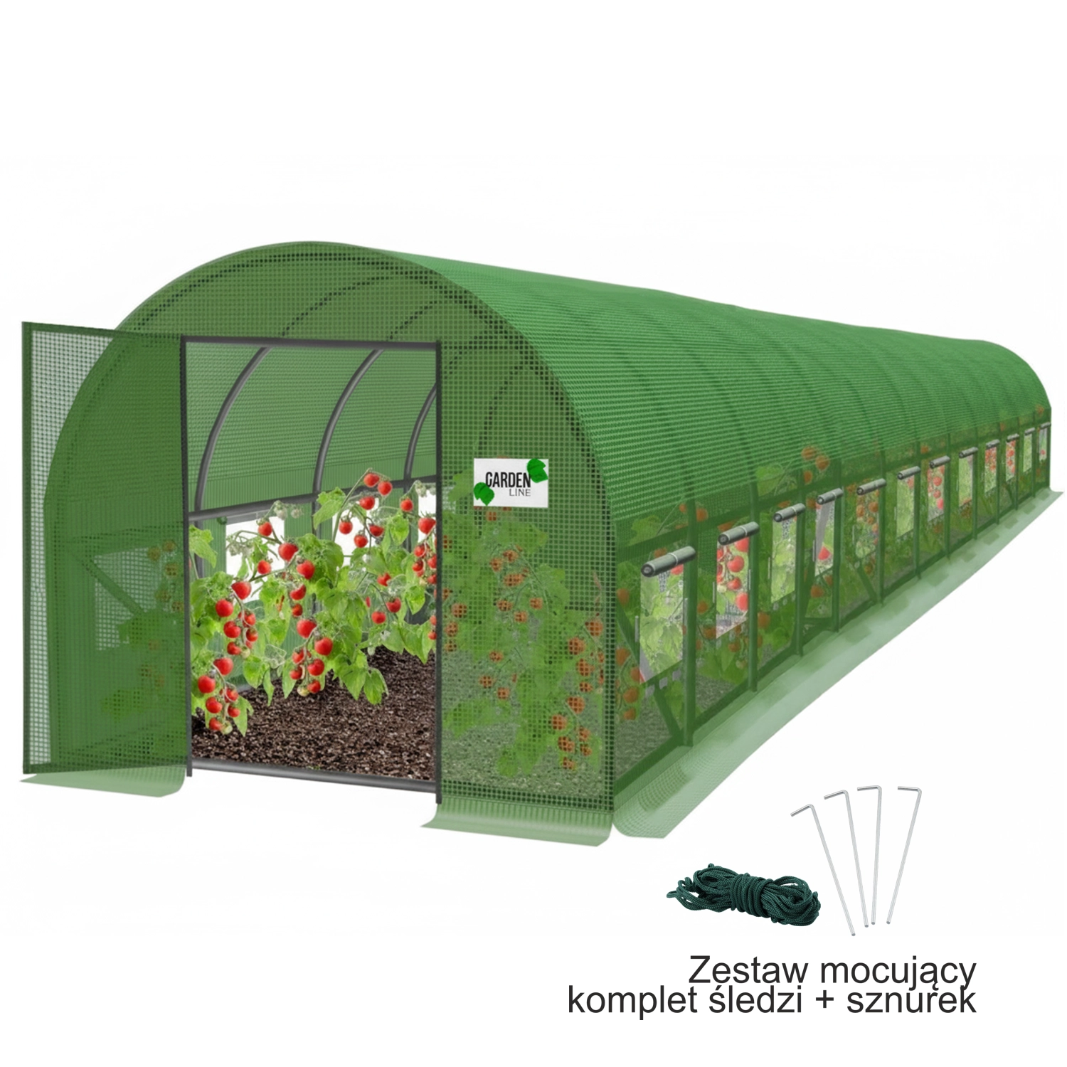 Royale ruimte van 12 × 5 × 2 m biedt een ideaal microklimaat voor groenten, kruiden en zaailingen. Vleugeldeuren minimaliseren ritsstoringen en garanderen gemakkelijke doorgang, ook bij regen, terwijl de PE-folie 140 g/m² met UV4 met geïntegreerd groen PP-gaas scheur- en weerbestendig is.