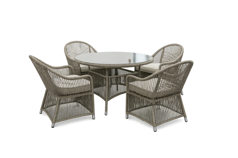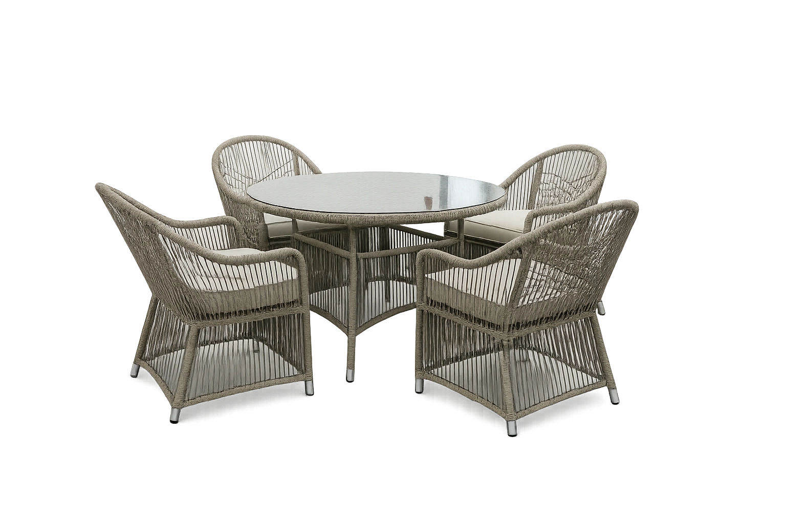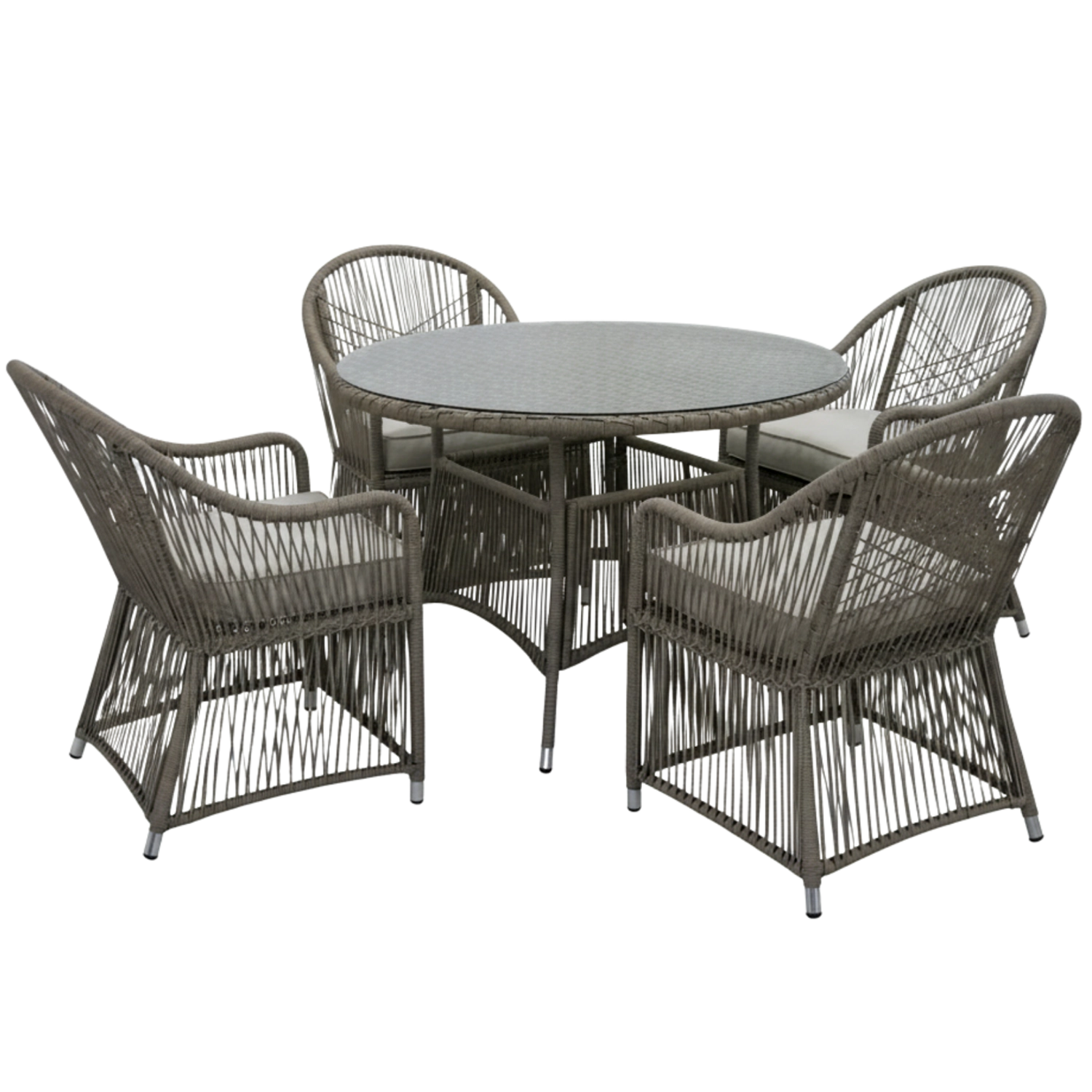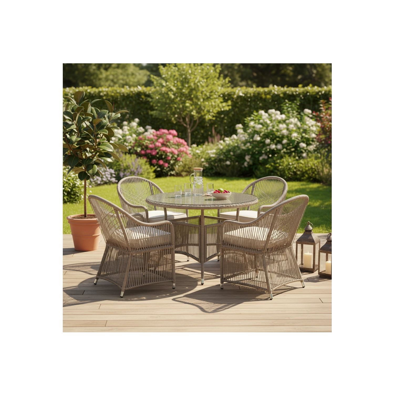 Tuin eethoek: 4 fauteuils en ronde tafel, grijs rotan met kussens