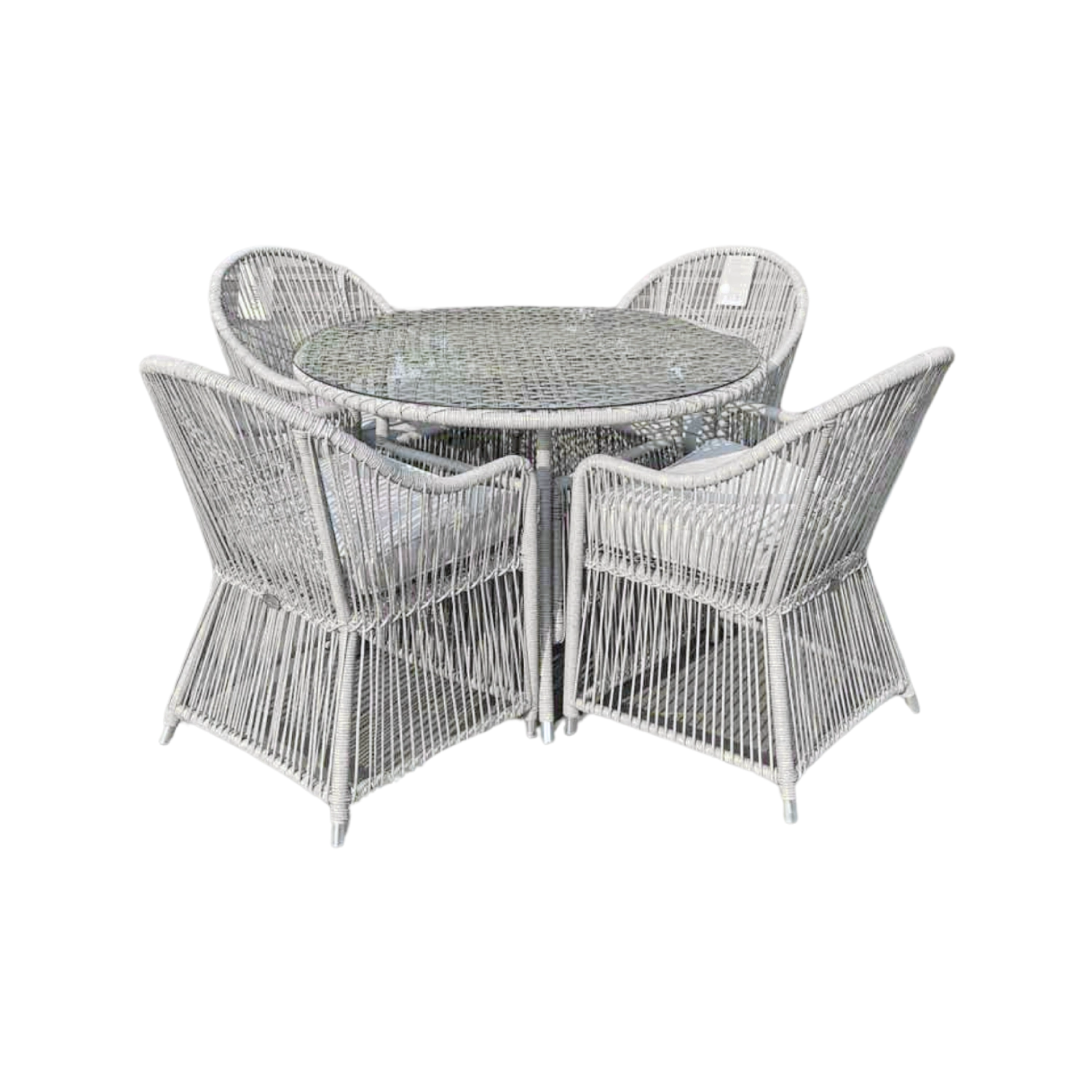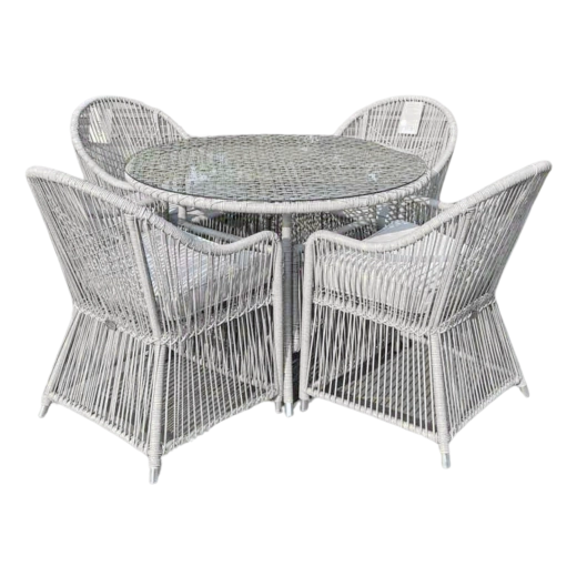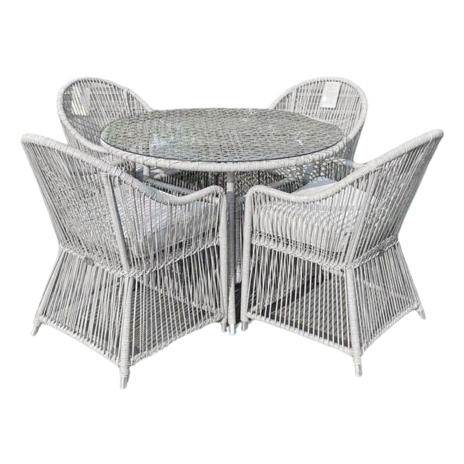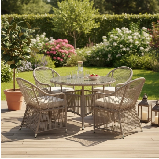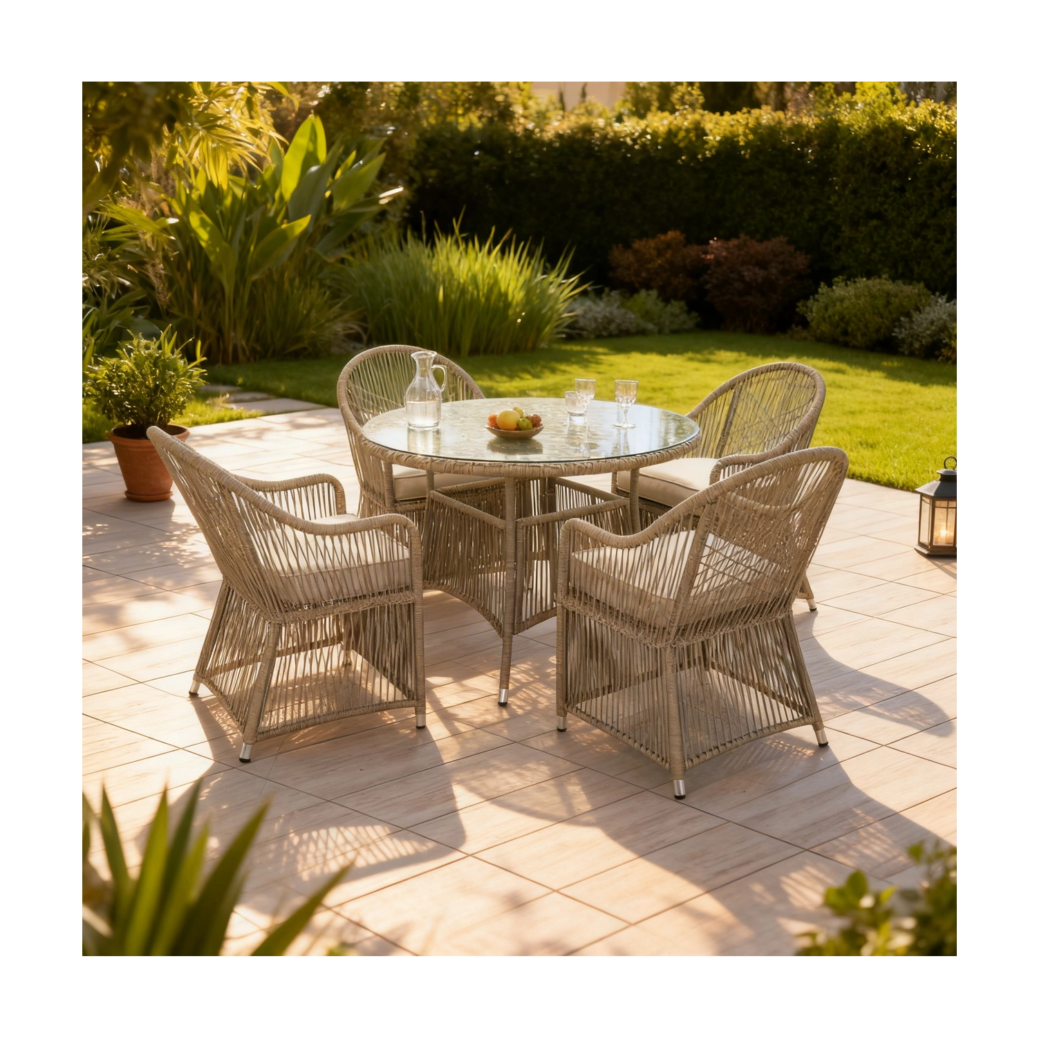 Tuin eethoek: 4 fauteuils en ronde tafel, grijs rotan met kussens