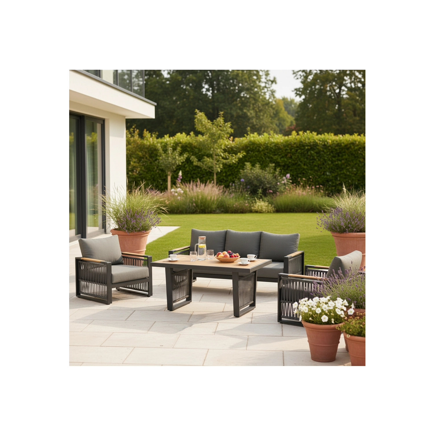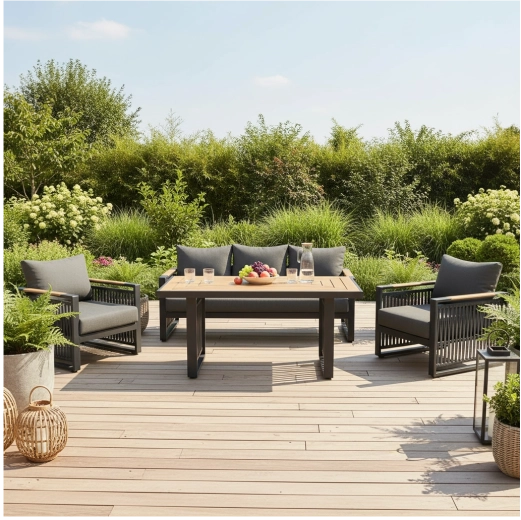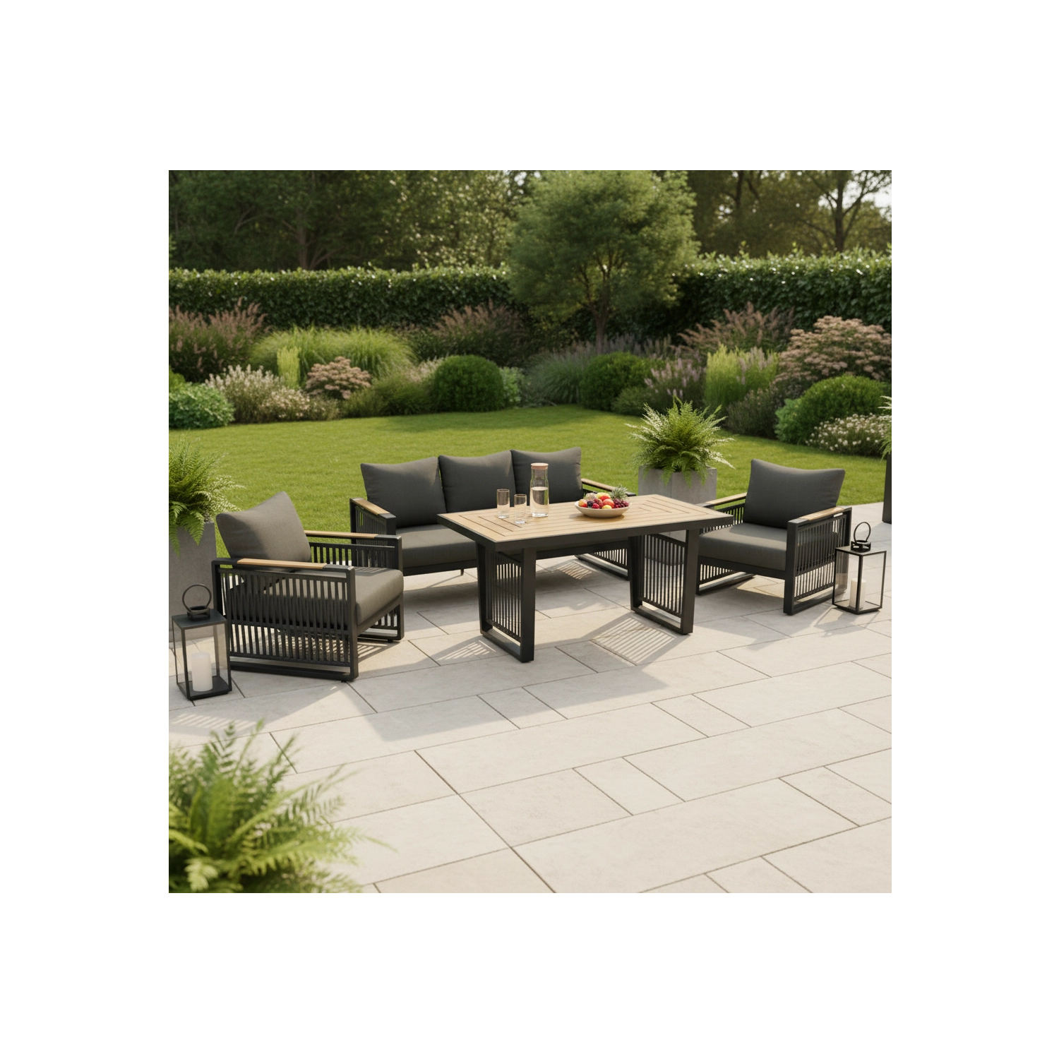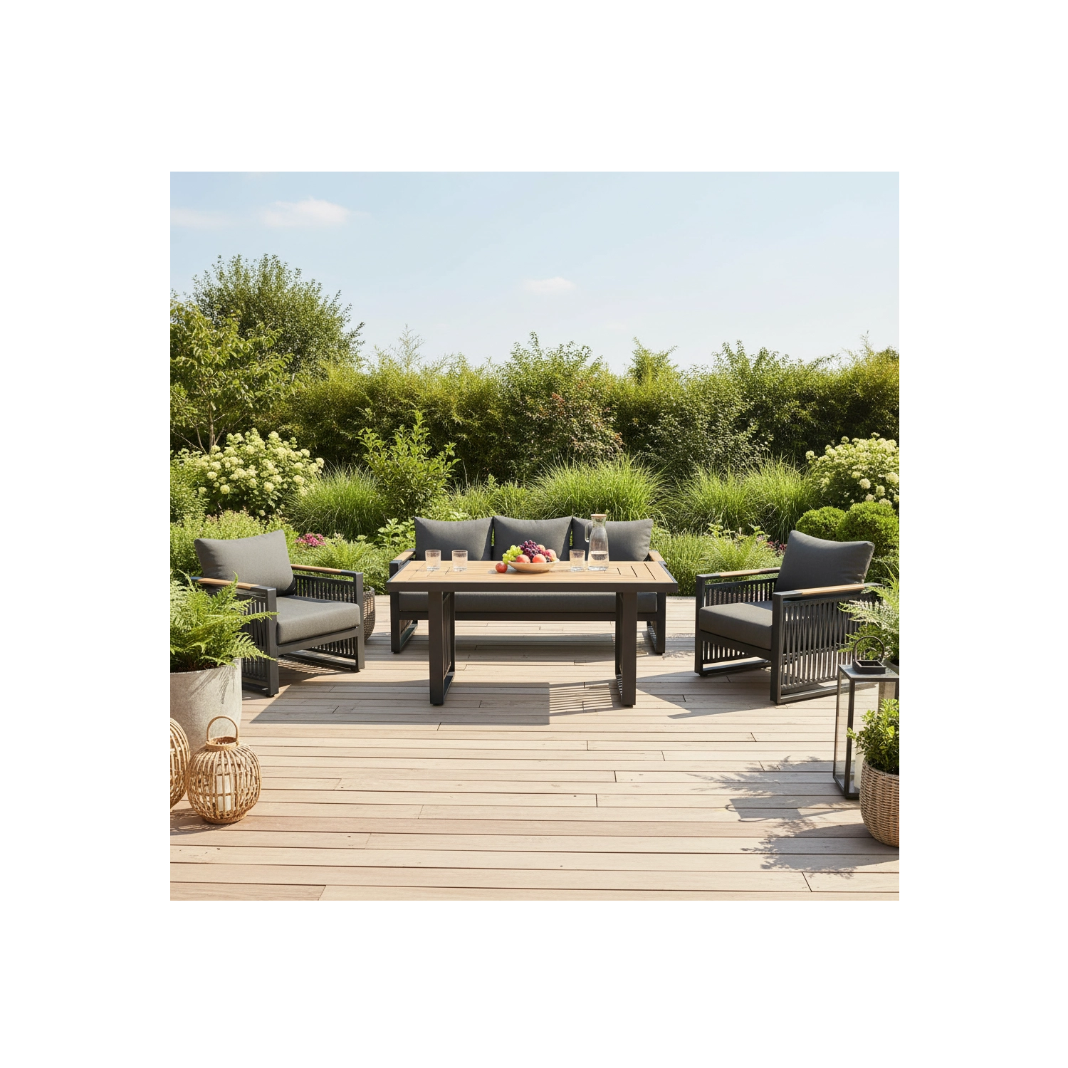 Dikke kussens van 12 cm op zitting en rug bieden uitzonderlijk comfort en stabiele rugondersteuning. De set is ideaal voor 4–5 personen en past perfect in tuin, terras en patio – voor de ochtendlijke koffie, middagrust en een gezellige avond met vrienden.