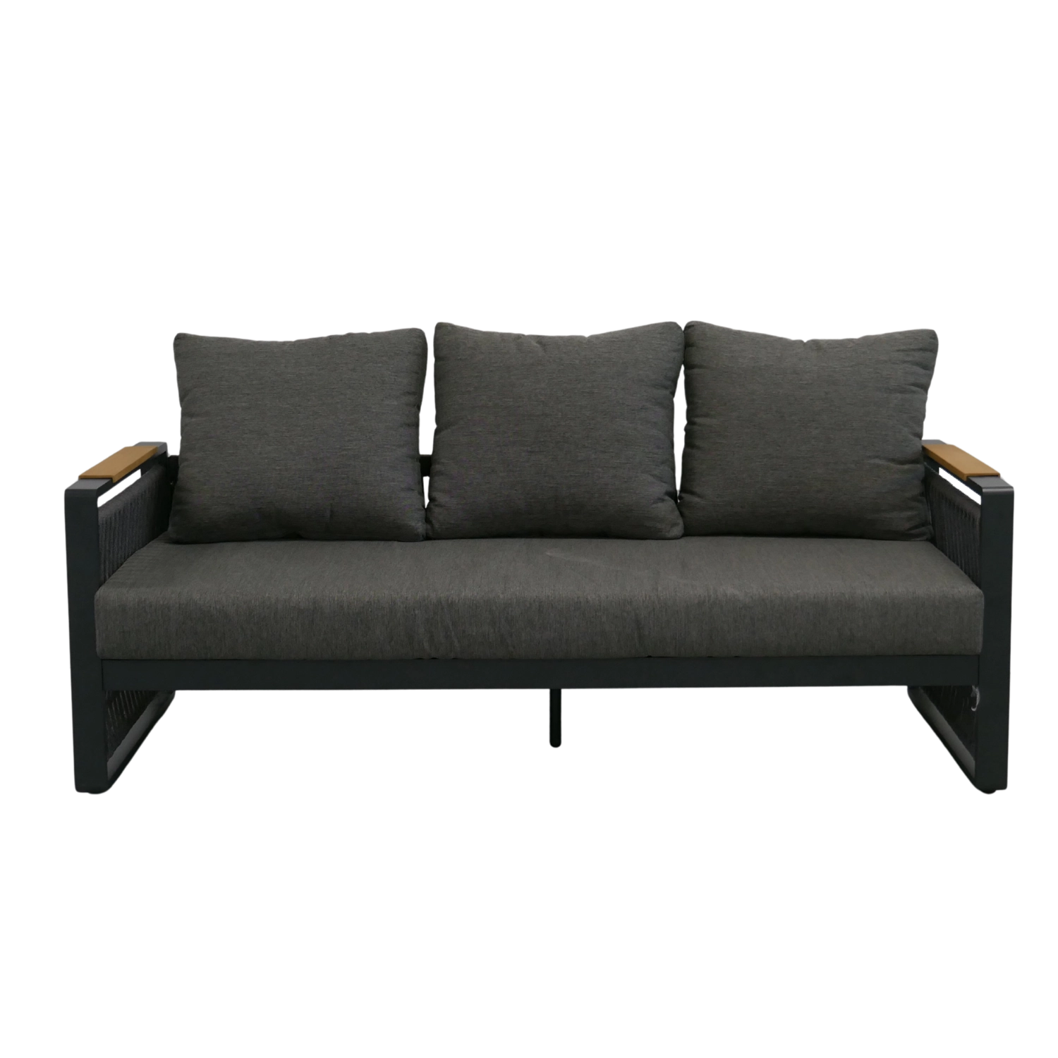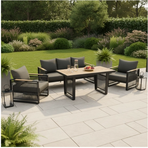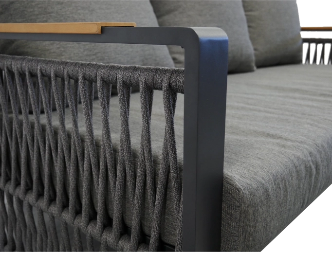 De SKOPJE-set is ontworpen voor dagelijks relaxen en gezellige samenkomsten. De lichte maar stevige aluminium frames met poedercoating trotseren het weer, terwijl het design-touwvlechtwerk en de houtlook polywood op de armleuningen en het tafelblad het premium karakter van de hele set onderstrepen.