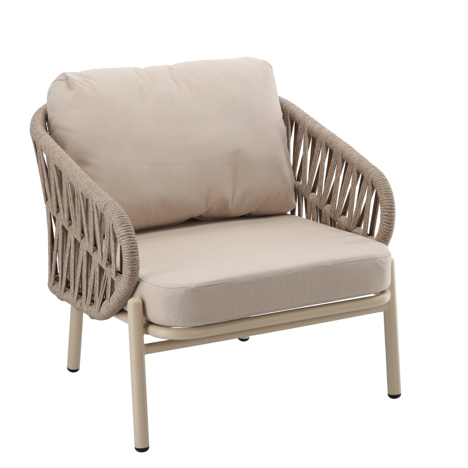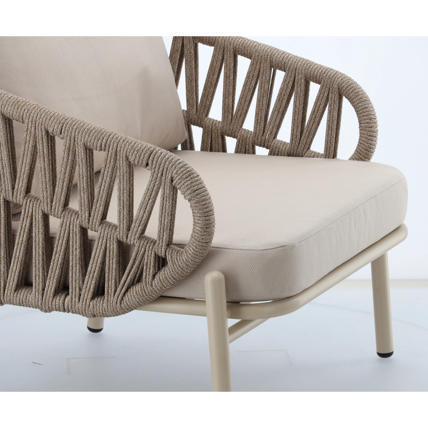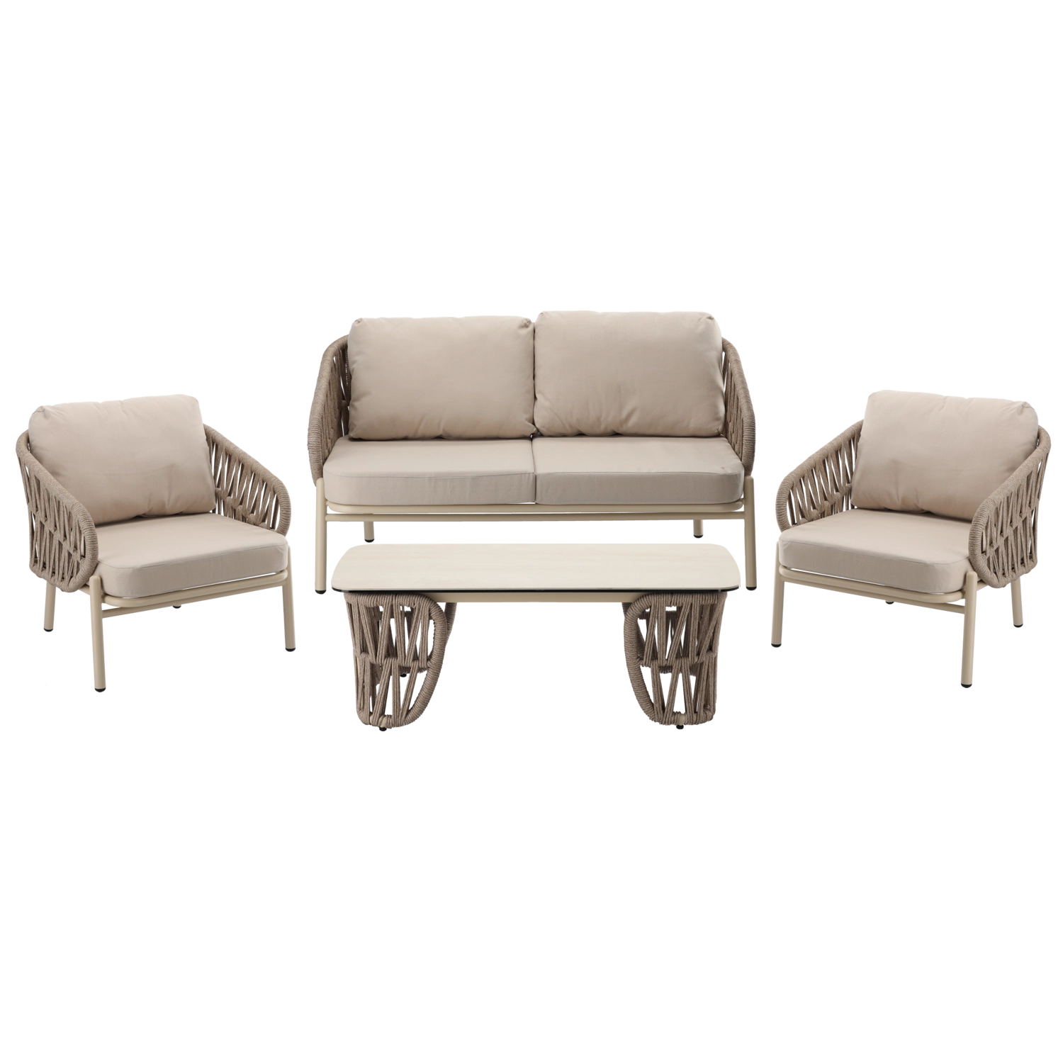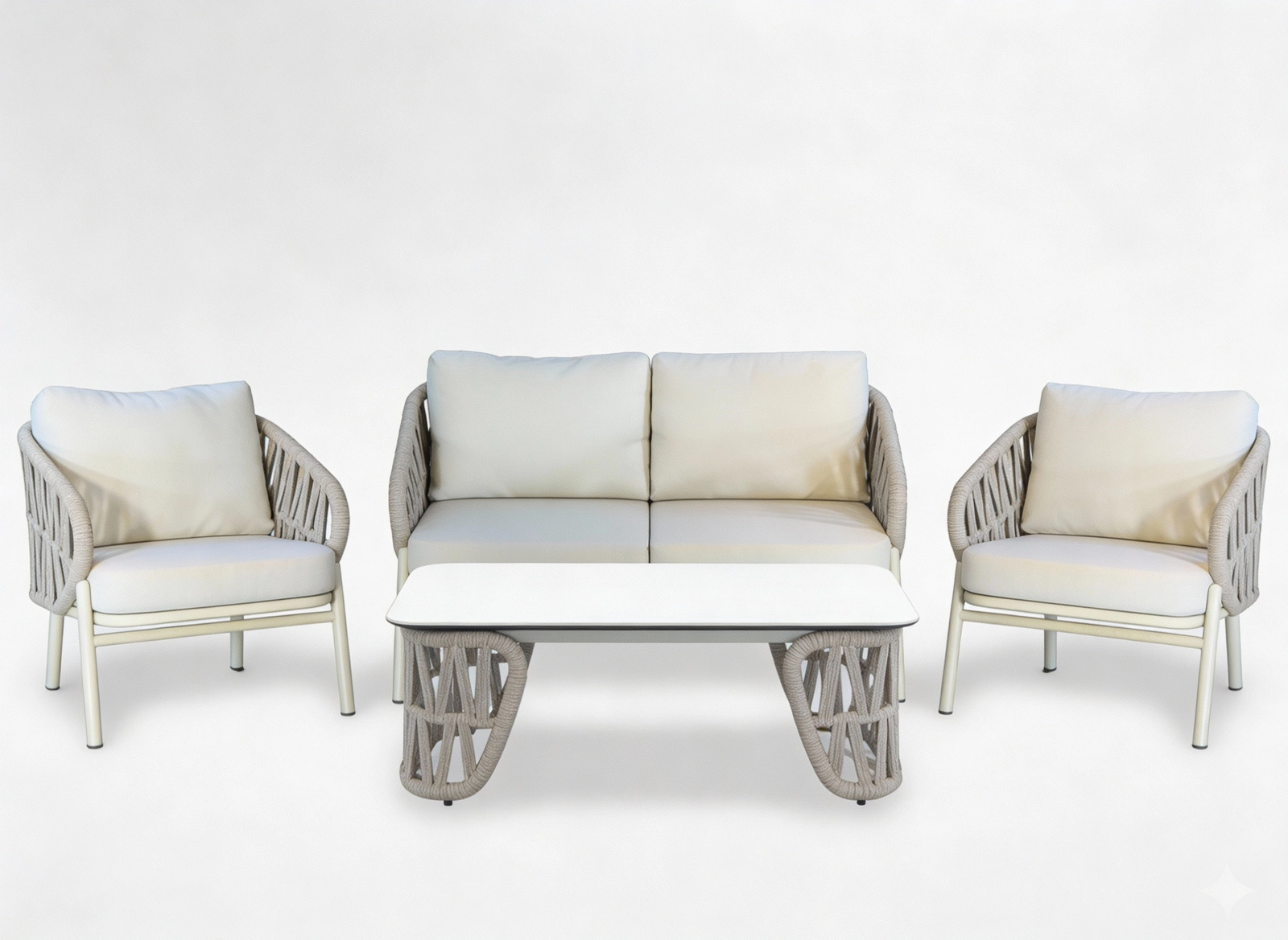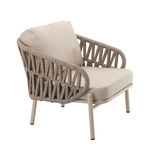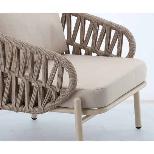 De set bevat een tweezitsbank, 2 comfortabele fauteuils en een ruime salontafel. De lichte maar stevige aluminiumconstructie met poedercoating is weer- en corrosiebestendig, waardoor de set seizoen na seizoen meegaat. De neutrale beige kleur en de gevlochten zijpanelen geven het geheel een tijdloze elegantie.
